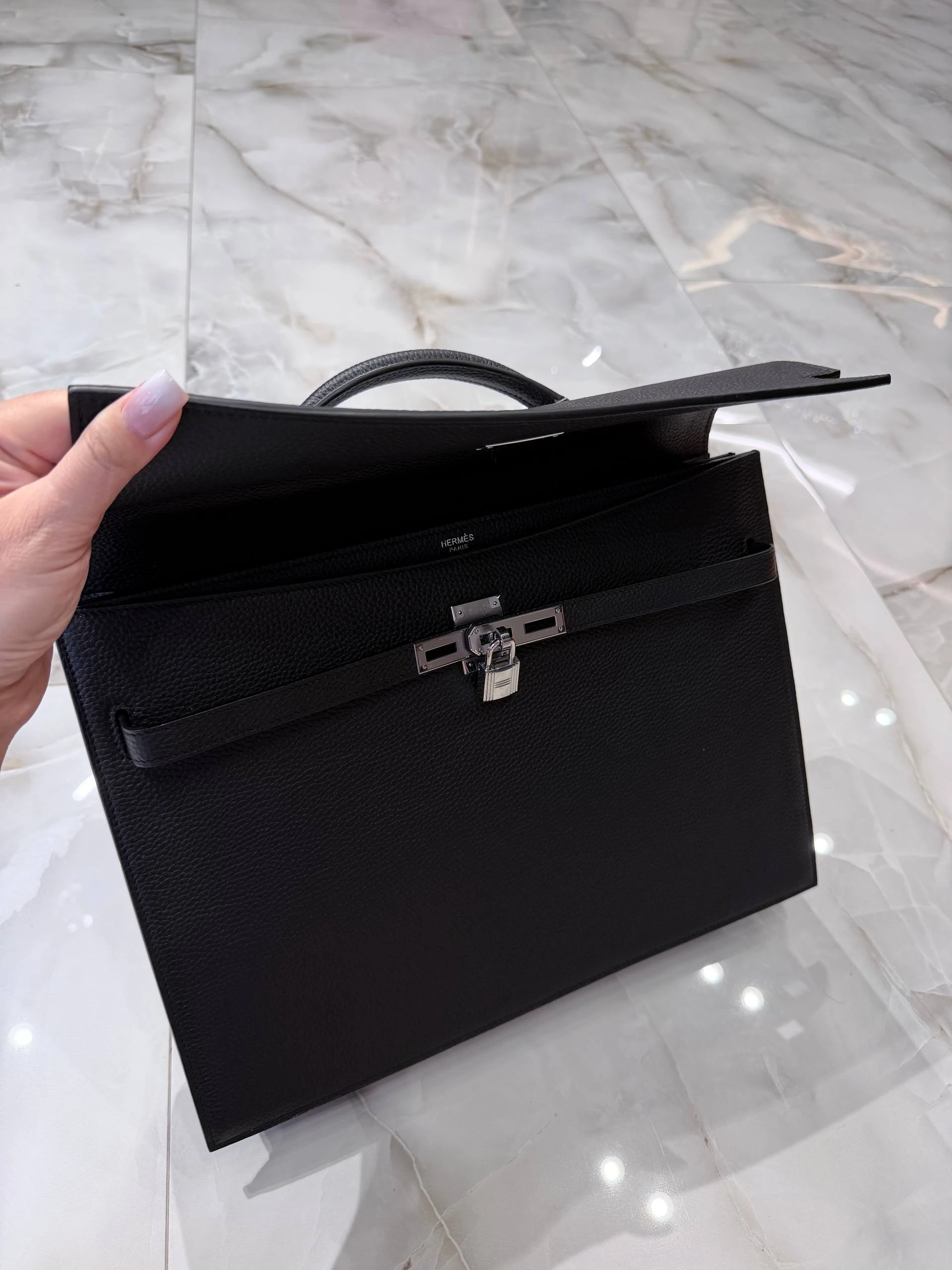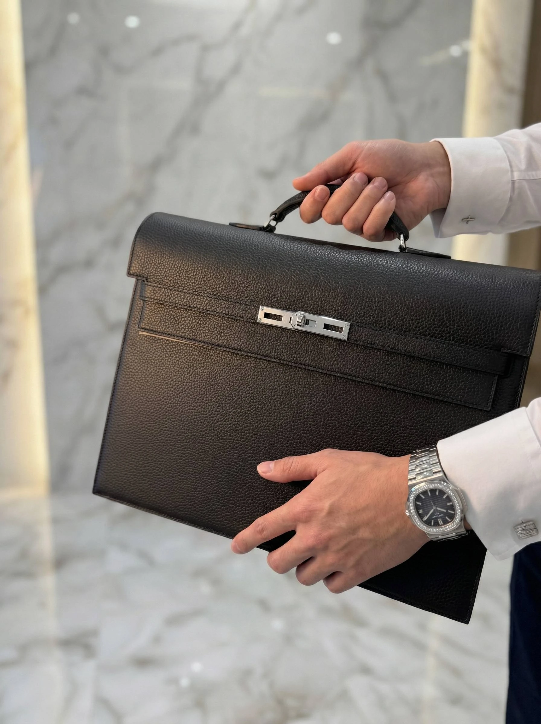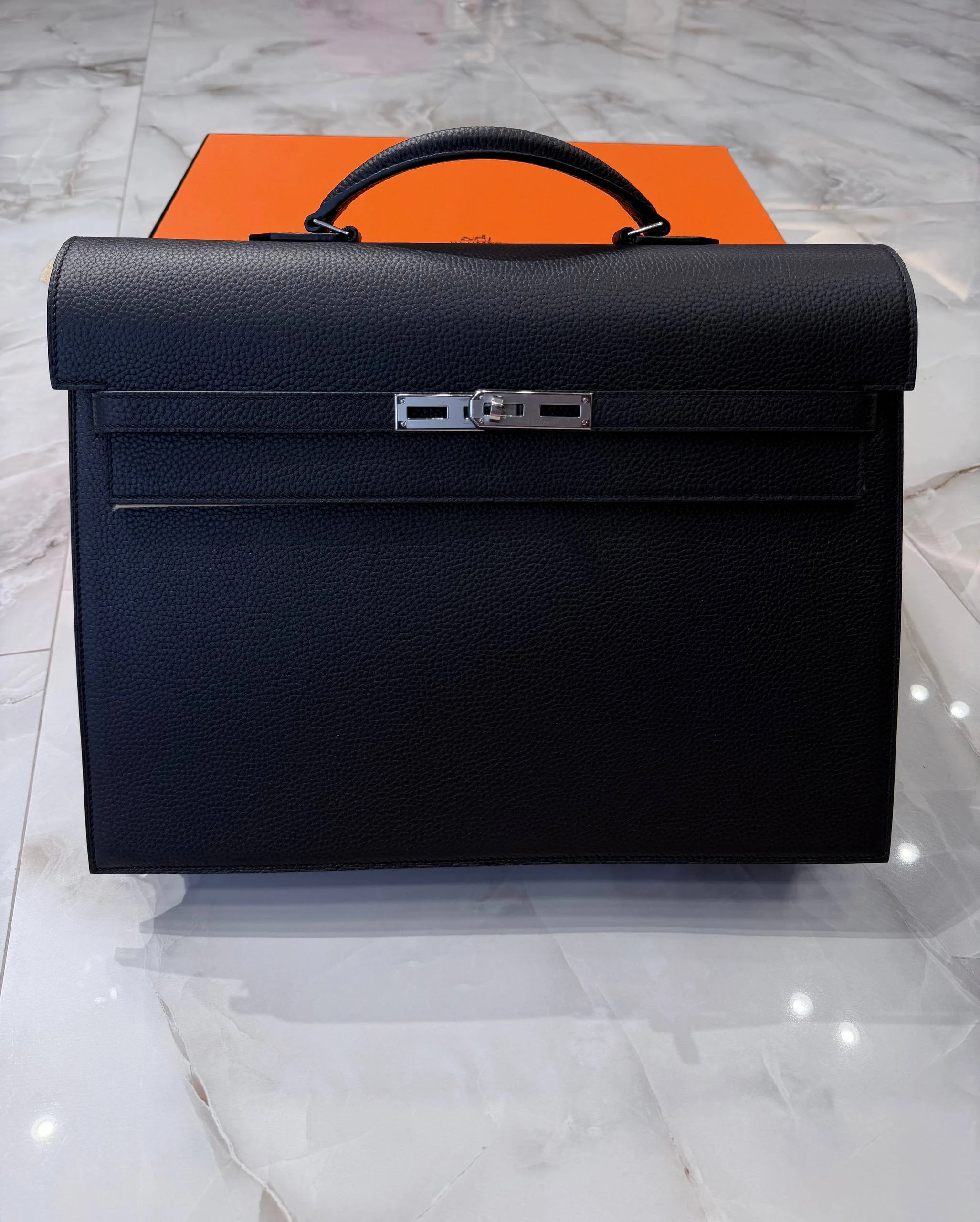 Элегантный мужской портфель из зернистой кожи Togo глубокого черного цвета — сочетание традиционного мастерства и современного минимализма. Идеален для деловых встреч и повседневной офисной жизни: сдержанный силуэт, надежная фурнитура серебристого тона и продуманная внутренняя организация для документов и гаджетов.