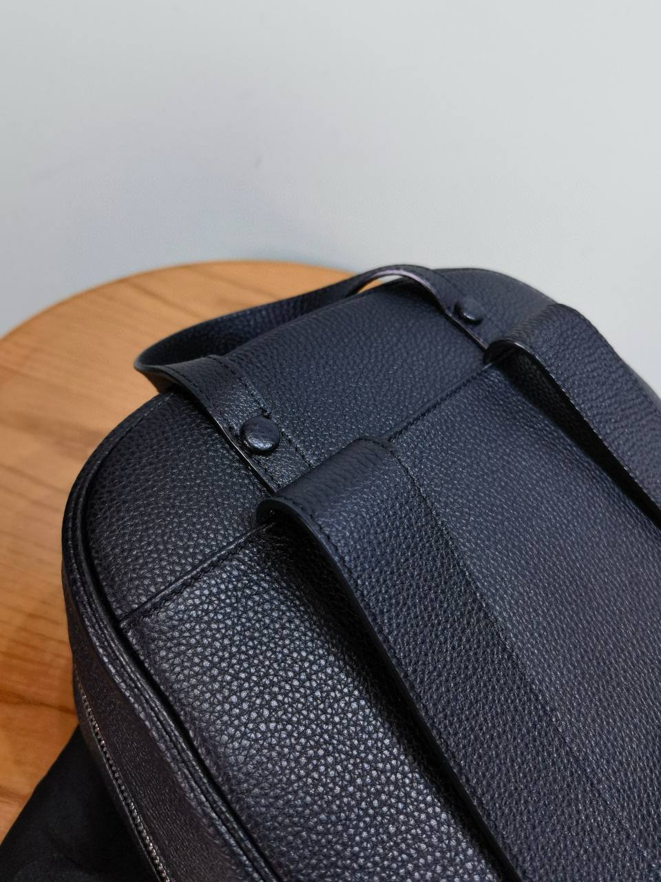 • Отделения и функциональность: основное отделение закрывается на двойную молнию с крупными тянущимися элементами из кожи; на лицевой стороне — внешний карман на молнии для быстрого доступа к мелочам. Эргономичный верхний ручной хват для переноски в руке.