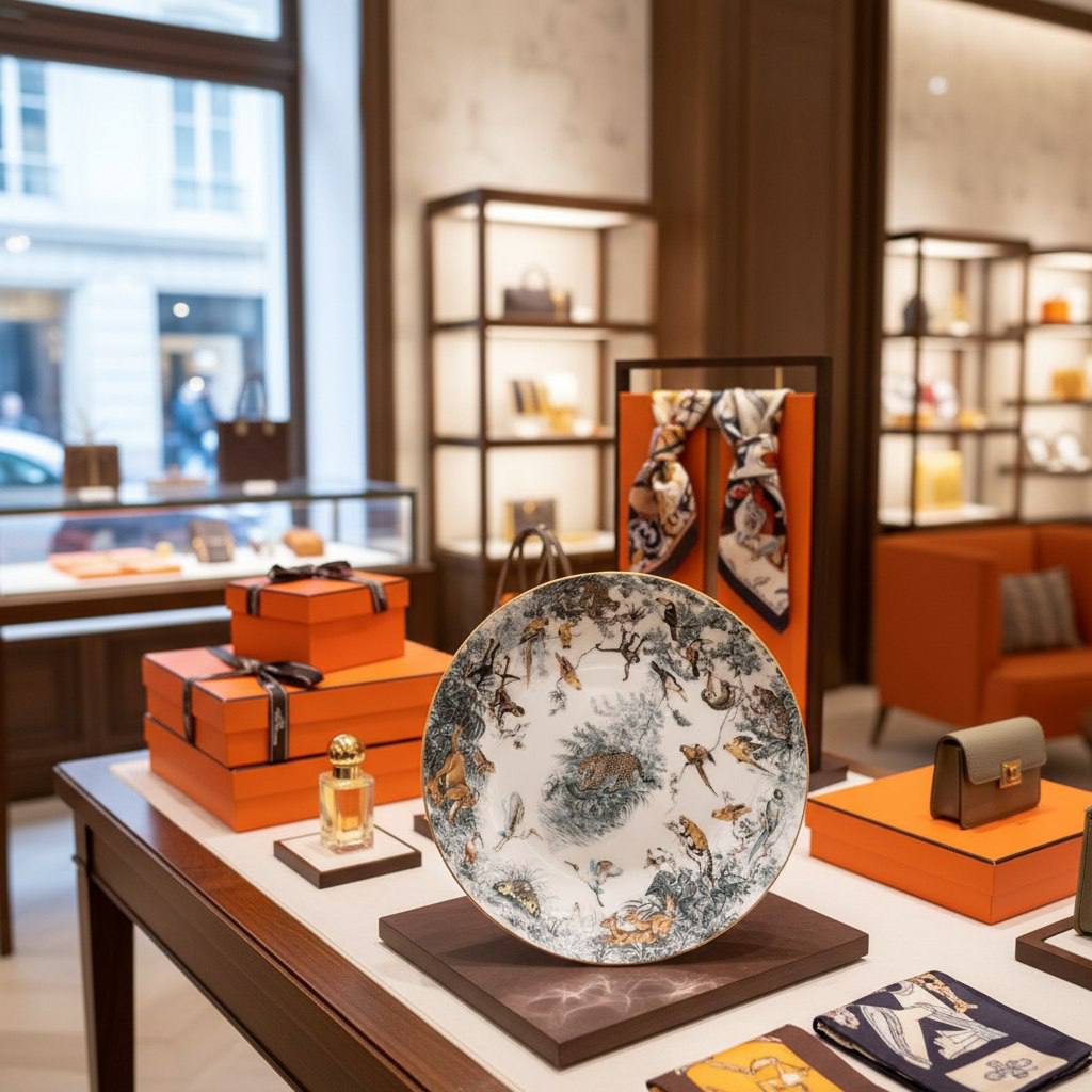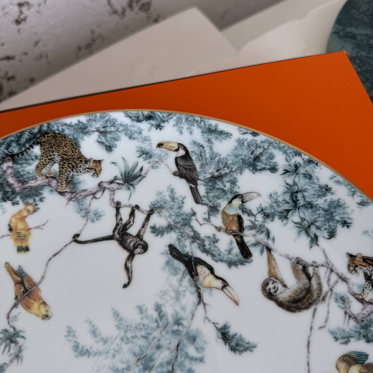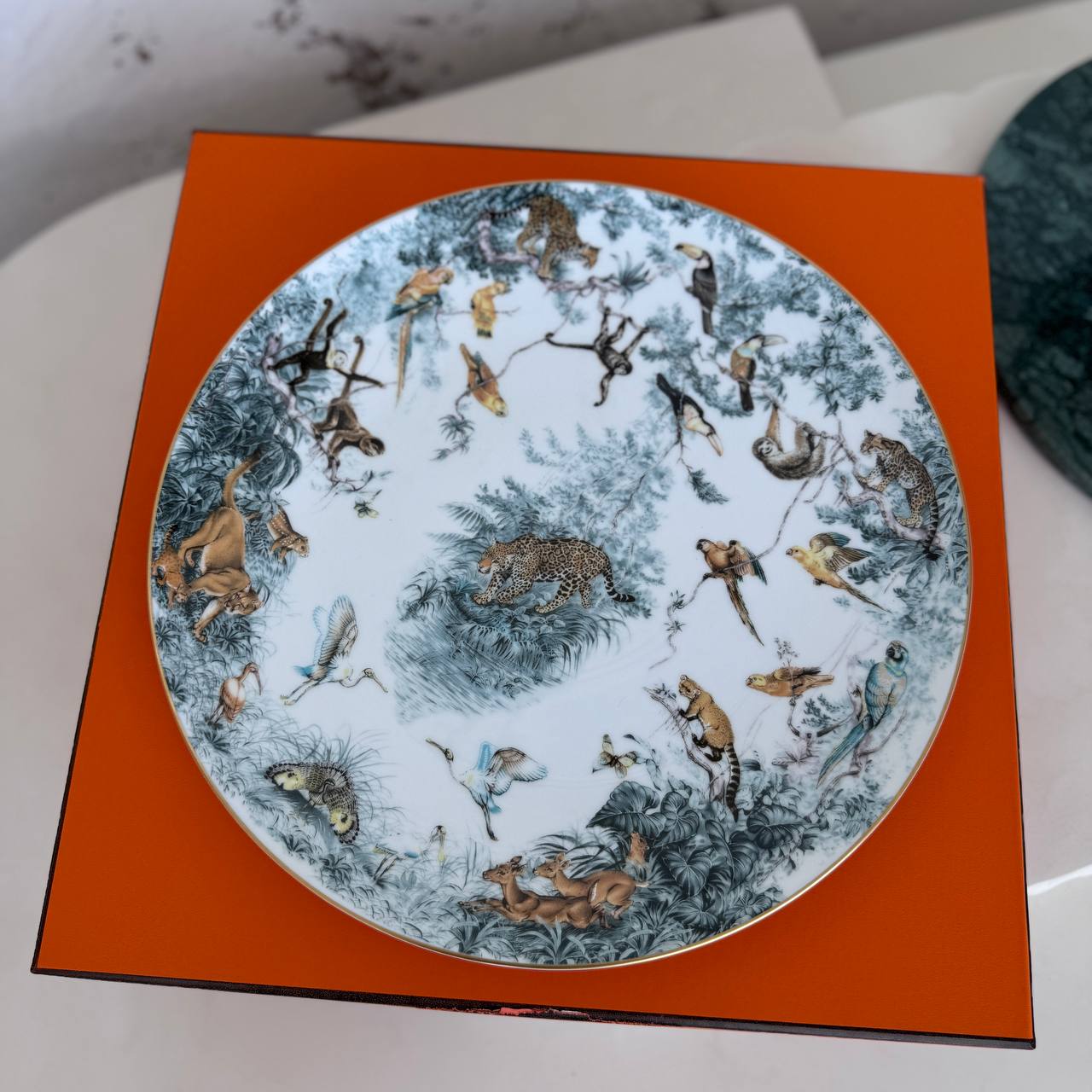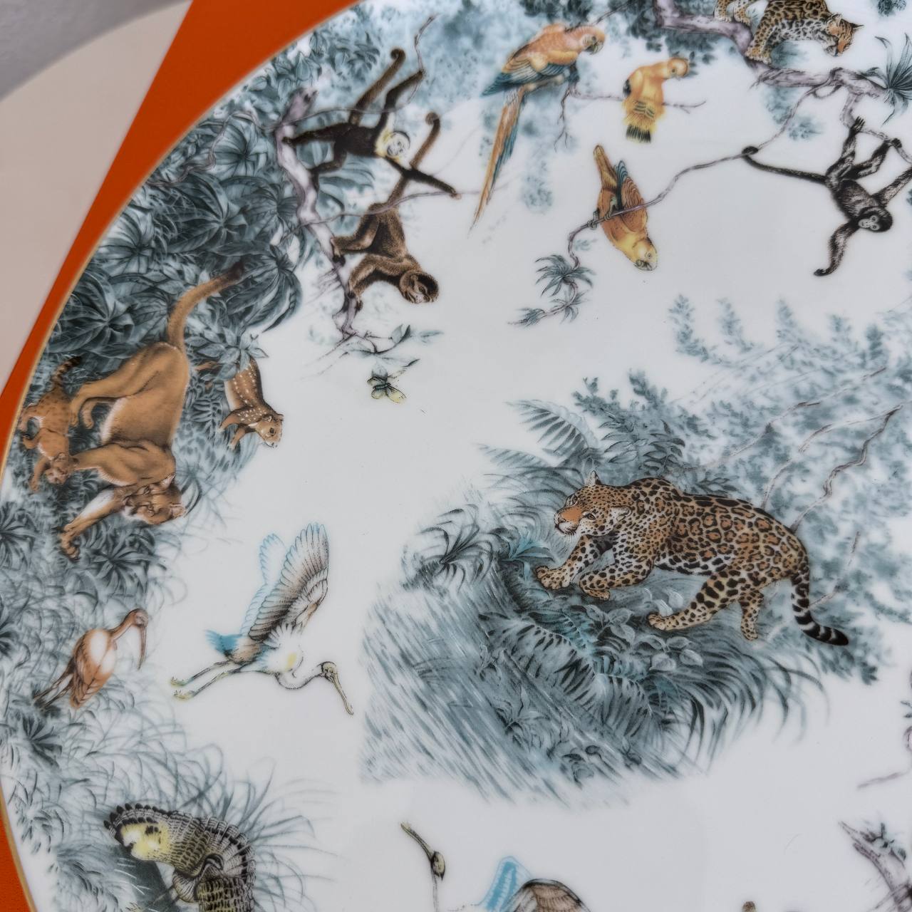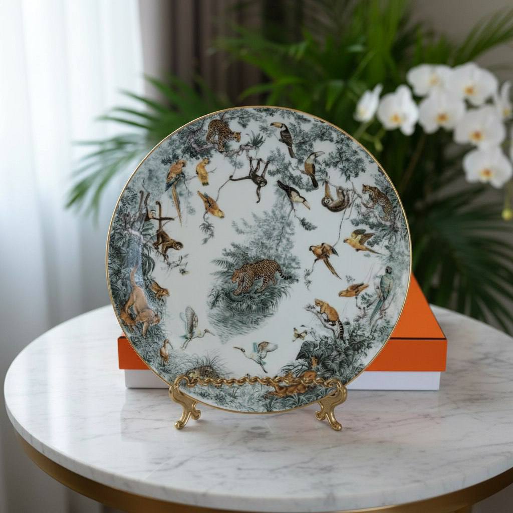 Обеденная тарелка Hermès входит в серию Carnets d'Equateur, посвященную дикой природе. Она изображает леопарда и изготовлена из императорского костяного фарфора.