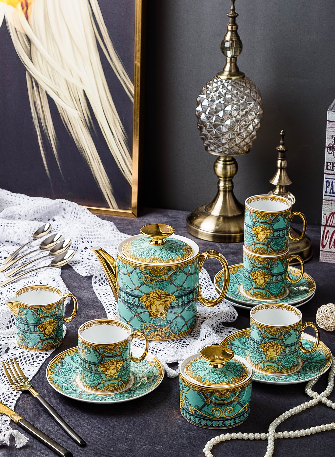 Чайный сервиз Versace Palazzo из 15 предметов — это роскошный набор посуды, изготовленный из костяного фарфора, рассчитанный на 6 персон. Он отличается изысканным дизайном и высоким качеством.