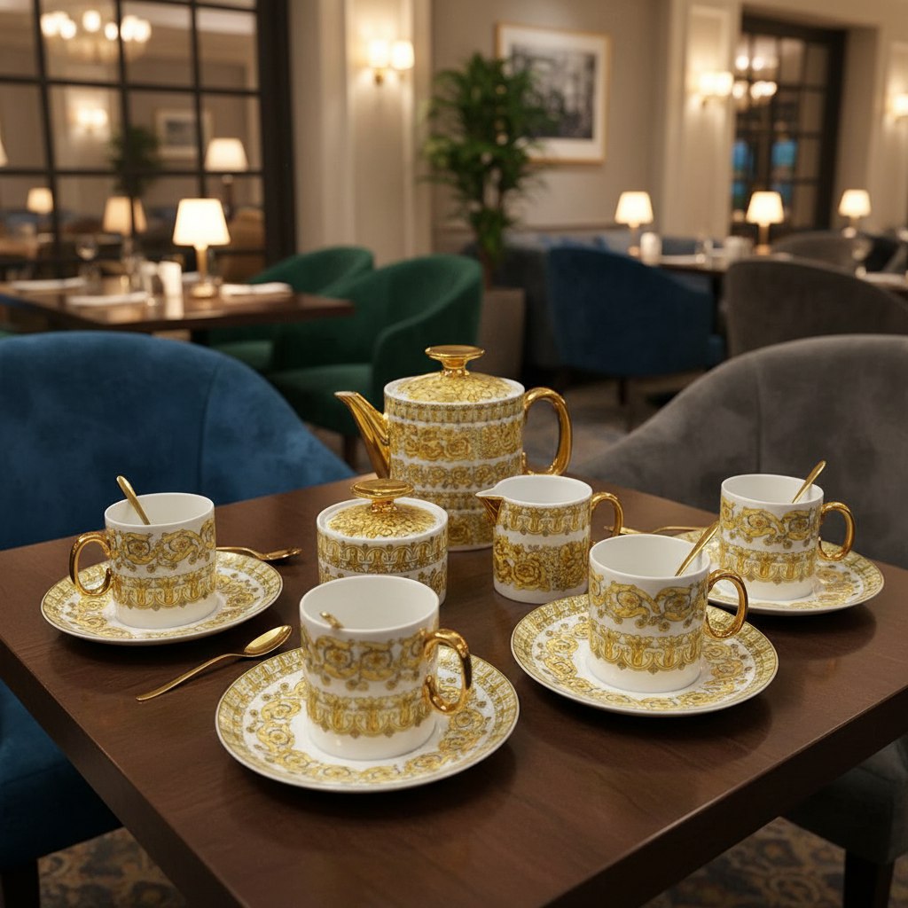 Чайный сервиз Versace Palazzo из 15 предметов — это роскошный набор посуды, изготовленный из костяного фарфора, рассчитанный на 6 персон. Он отличается изысканным дизайном и высоким качеством.
