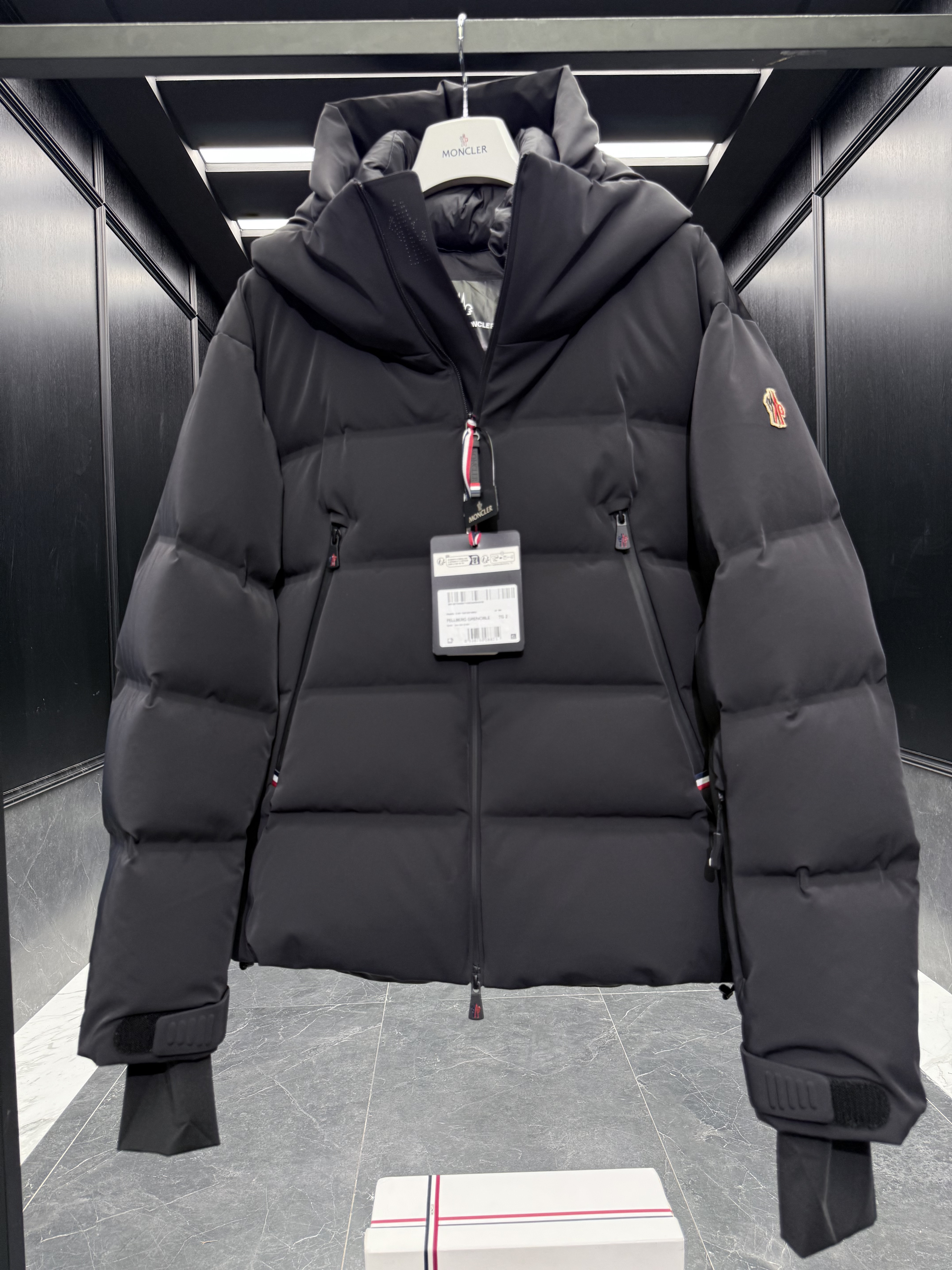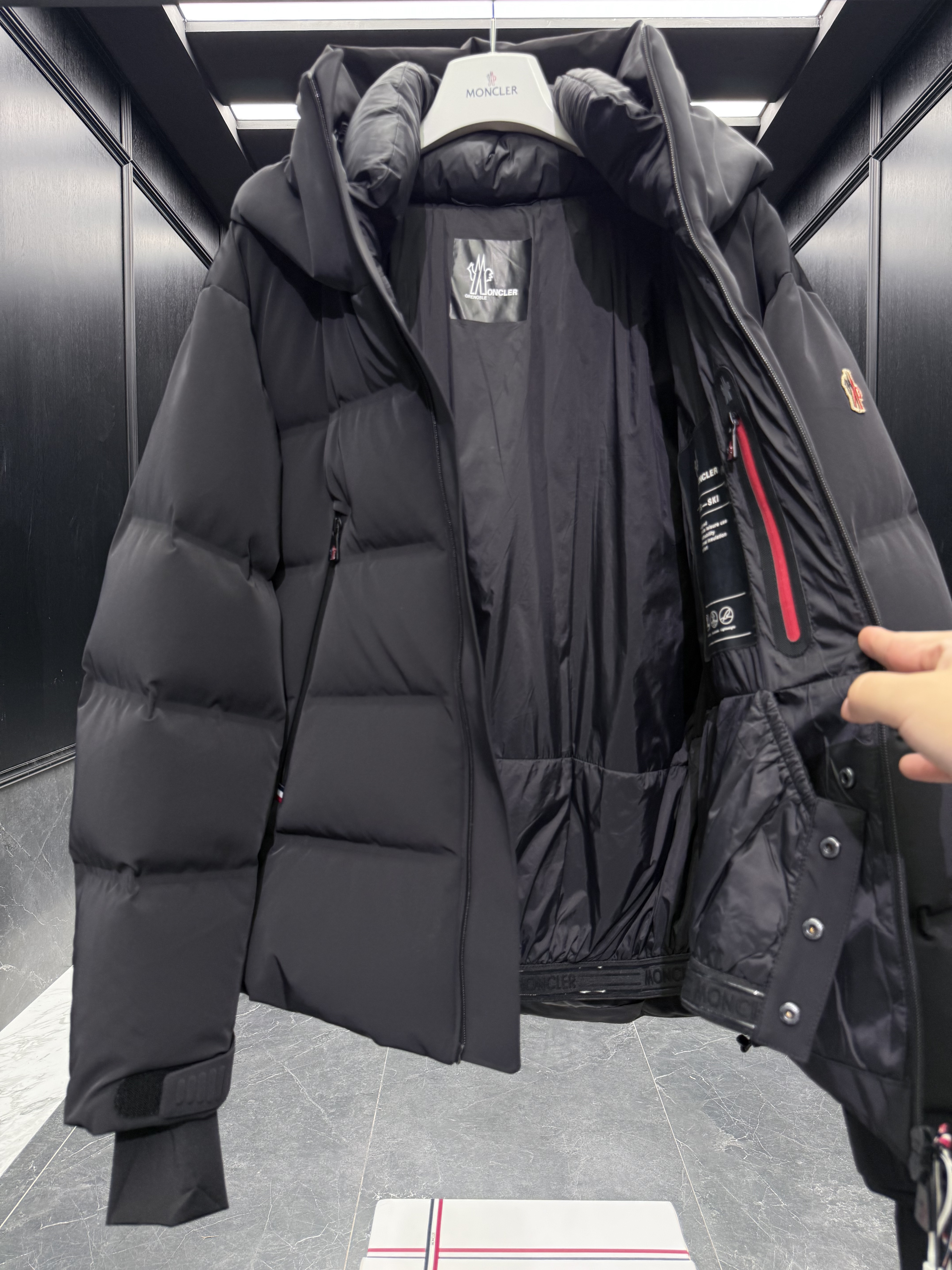 Пуховик оснащён двумя функциональными боковыми карманами на молниях с фирменными акцентами в цветах французского флага, что подчеркивает принадлежность к престижному бренду Moncler. Регулируемые манжеты на липучках и внутренние трикотажные защёлки на рукавах обеспечивают плотную посадку и дополнительную защиту от проникновения холодного воздуха. Двухзамковая молния позволяет удобно регулировать посадку и обеспечивает свободу движений, что особенно важно для активного образа жизни. Логотип Moncler на рукаве является символом высокого качества и стильного статуса владельца.