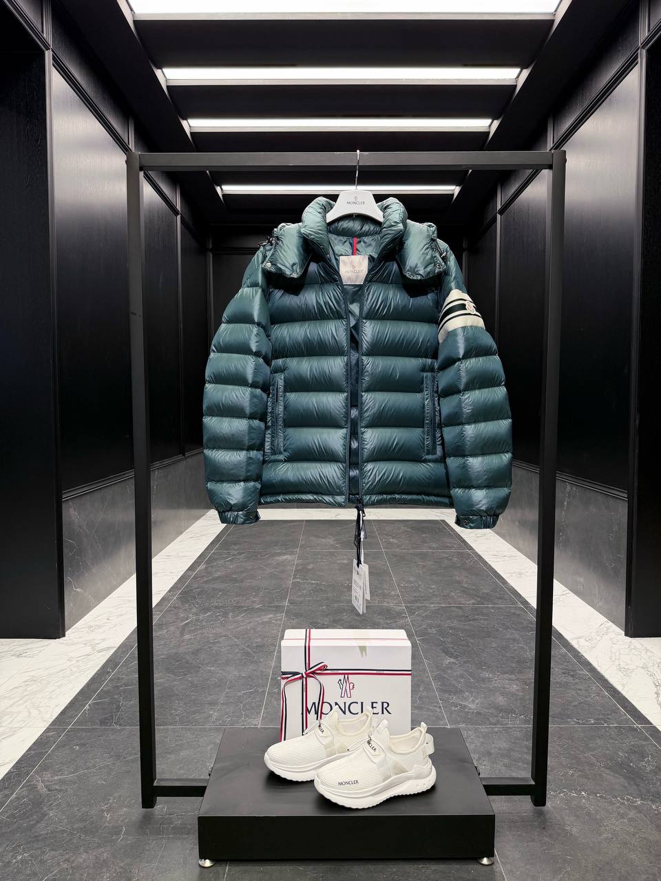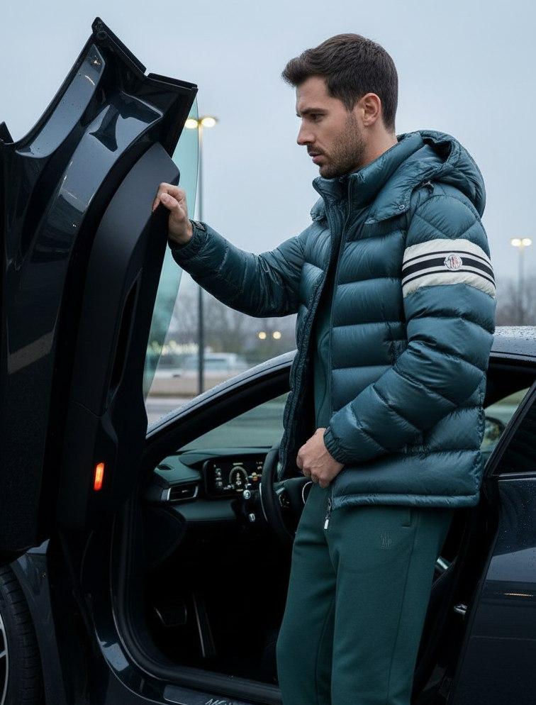 Стильный и функциональный мужской пуховик Moncler Landre выполнен в классическом пуховом силуэте с акцентом на лаконичную городскую эстетику. Верхняя ткань с лёгким глянцем подчёркивает насыщенный тёмно‑зелёный оттенок, а широкие горизонтальные стёганые канты создают объёмную, при этом лёгкую «пуховую» структуру. Высокий ворот‑стойка с дополнительной тёплой накладкой защищает от ветра, а съёмная/фиксируемая деталь капюшона позволяет менять образ и регулировать степень утепления в зависимости от погоды.