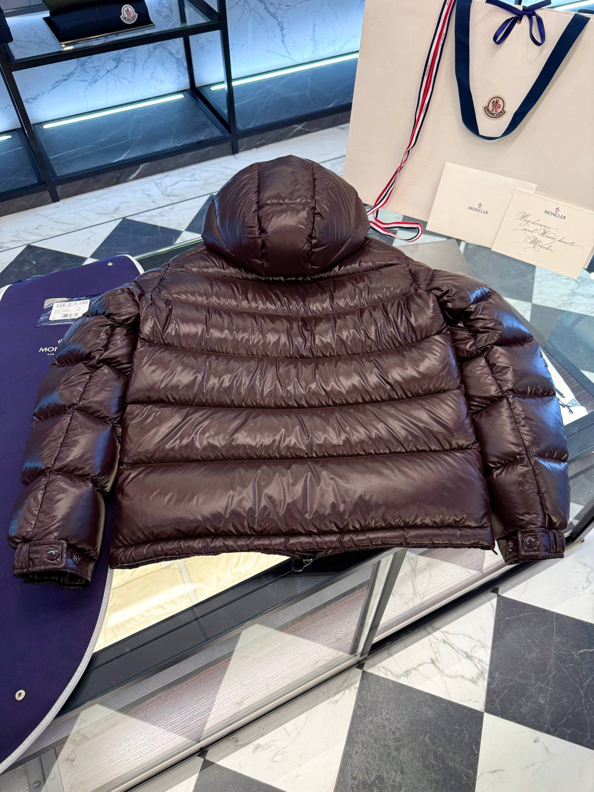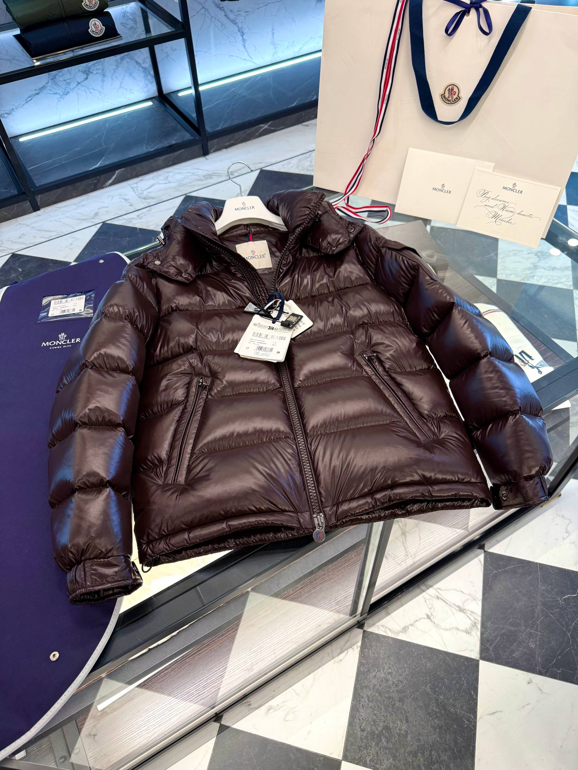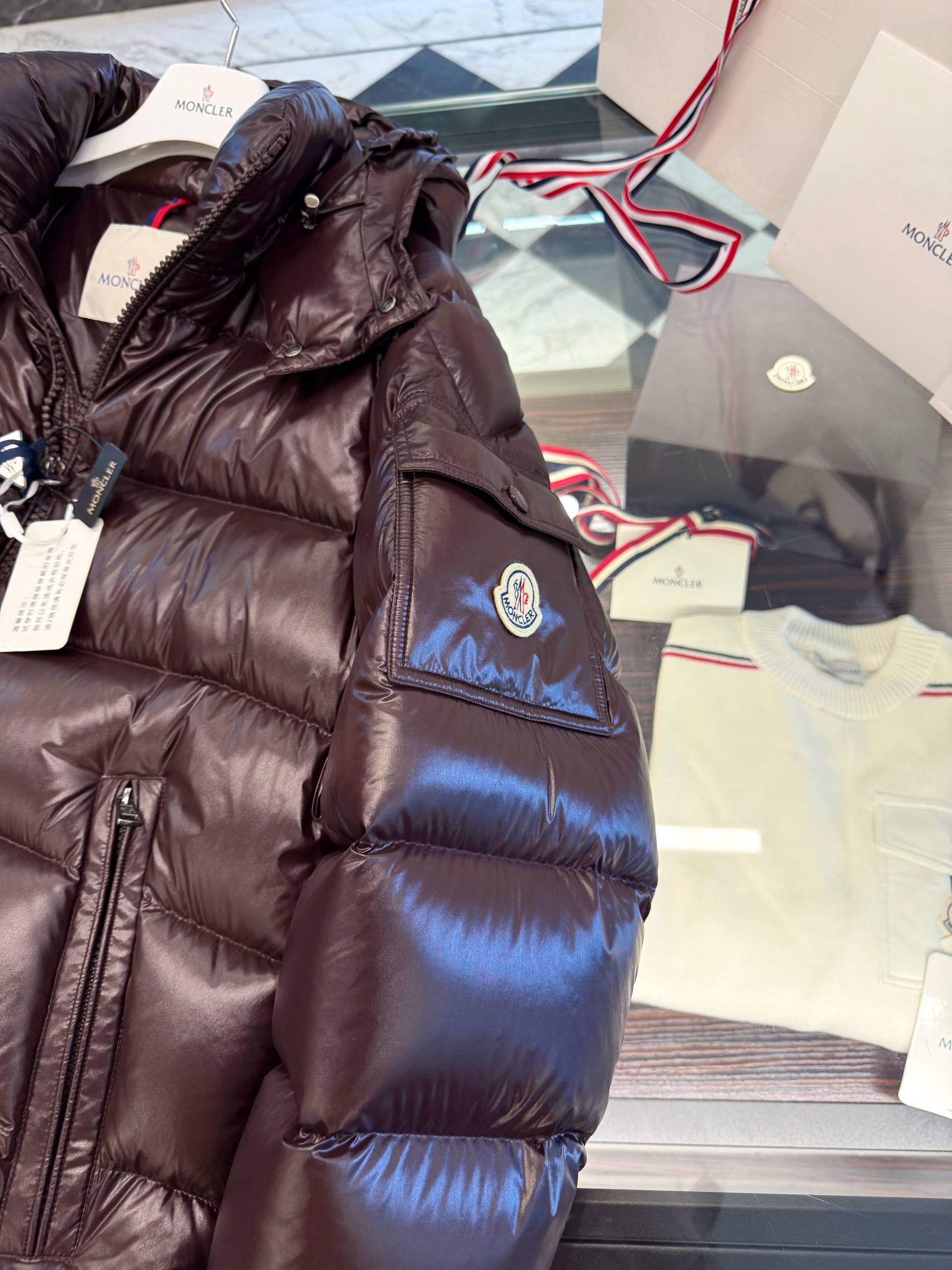 Мужской пуховик Moncler Maya в насыщенном тёпло-коричневом оттенке с лёгким глянцевым блеском ткани. Модель выполнена в характерной для Maya «пуховой» конструкции с горизонтальными стёгаными секциями, обеспечивающими равномерное распределение наполнителя и оптимальную теплоизоляцию. Пуховик короткой длины — на уровне линии бедер — создаёт современный силуэт и удобен для активного городского ритма.