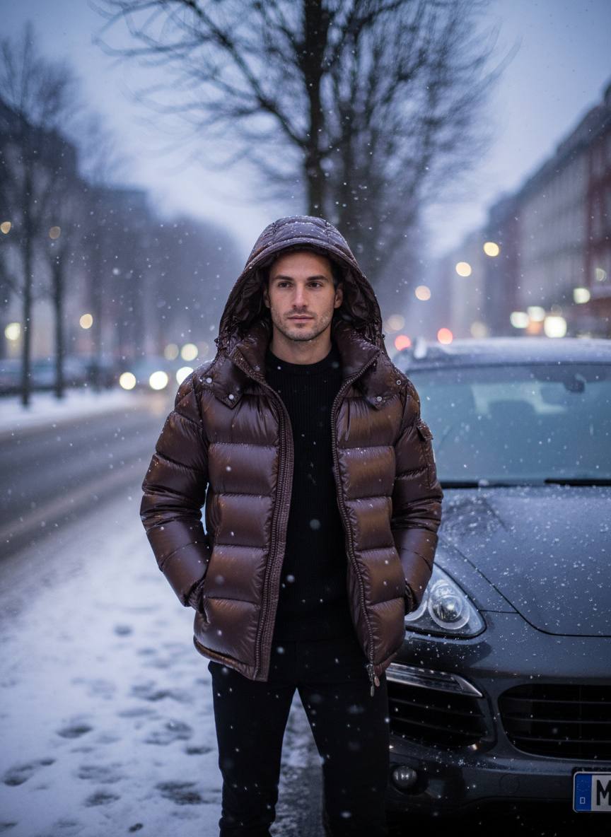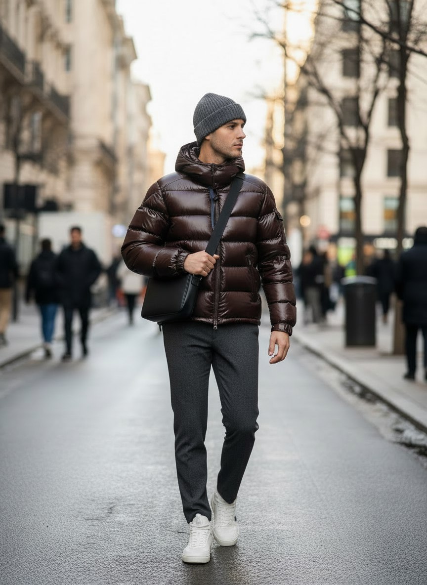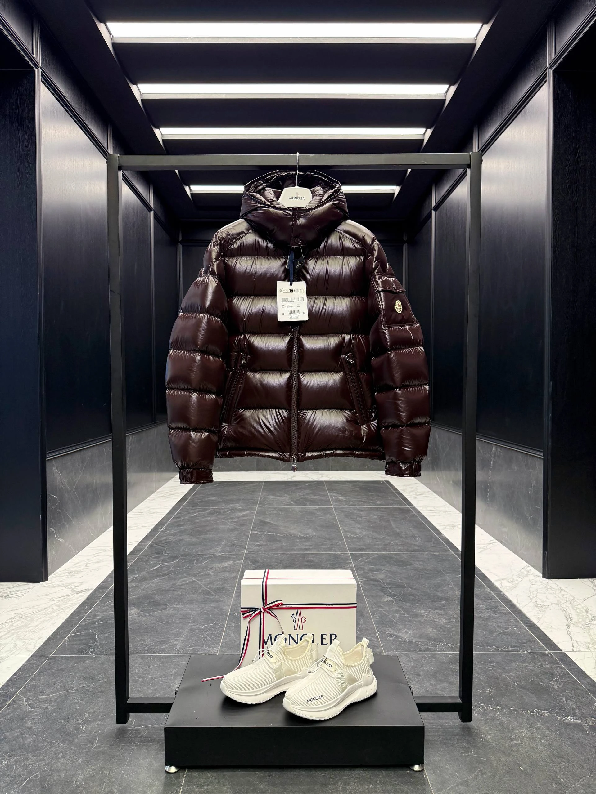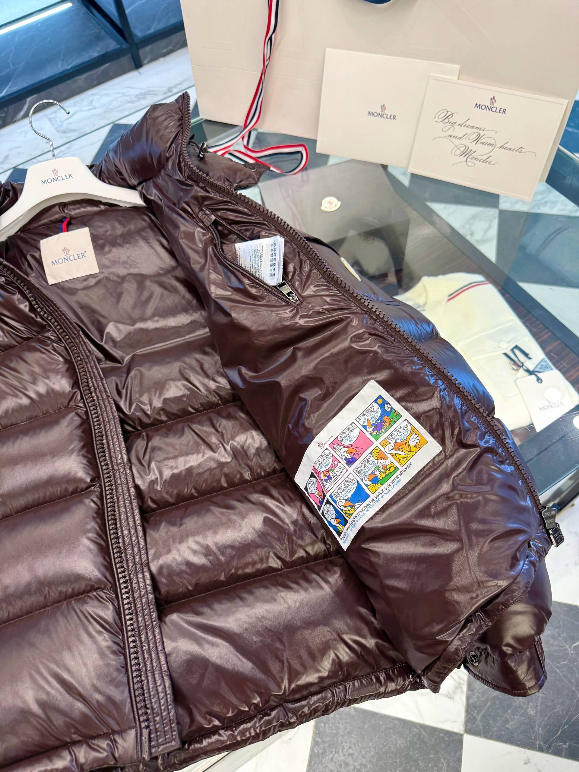 Мужской пуховик Moncler Maya в насыщенном тёпло-коричневом оттенке с лёгким глянцевым блеском ткани. Модель выполнена в характерной для Maya «пуховой» конструкции с горизонтальными стёгаными секциями, обеспечивающими равномерное распределение наполнителя и оптимальную теплоизоляцию. Пуховик короткой длины — на уровне линии бедер — создаёт современный силуэт и удобен для активного городского ритма.