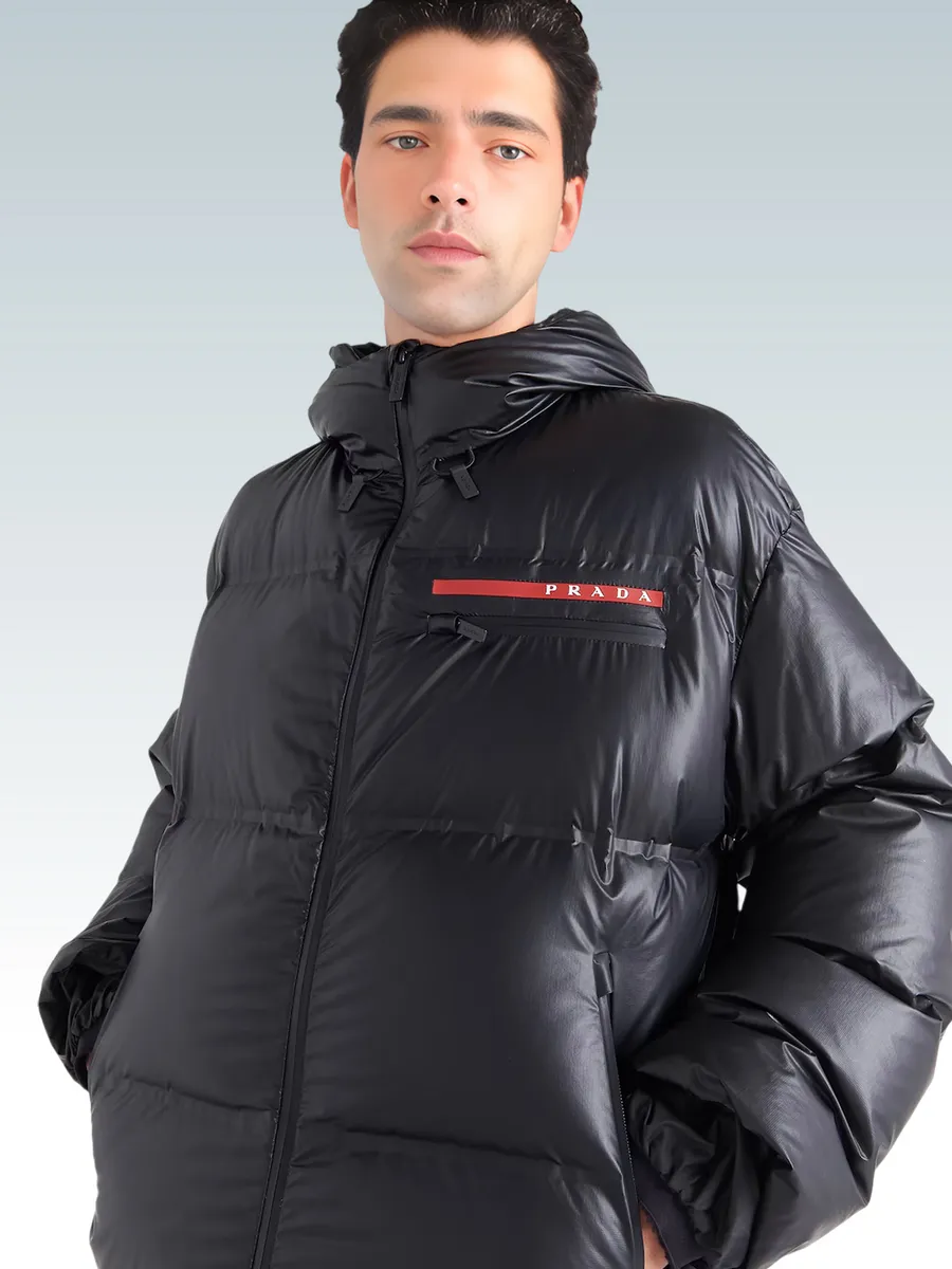 Мужской пуховик Prada с наполнителем из гусиного пуха — это синоним роскоши, тепла и безупречного итальянского стиля. Модель насыщенного черного цвета станет надежным спутником в самые суровые зимы, подчеркивая ваш безупречный вкус.