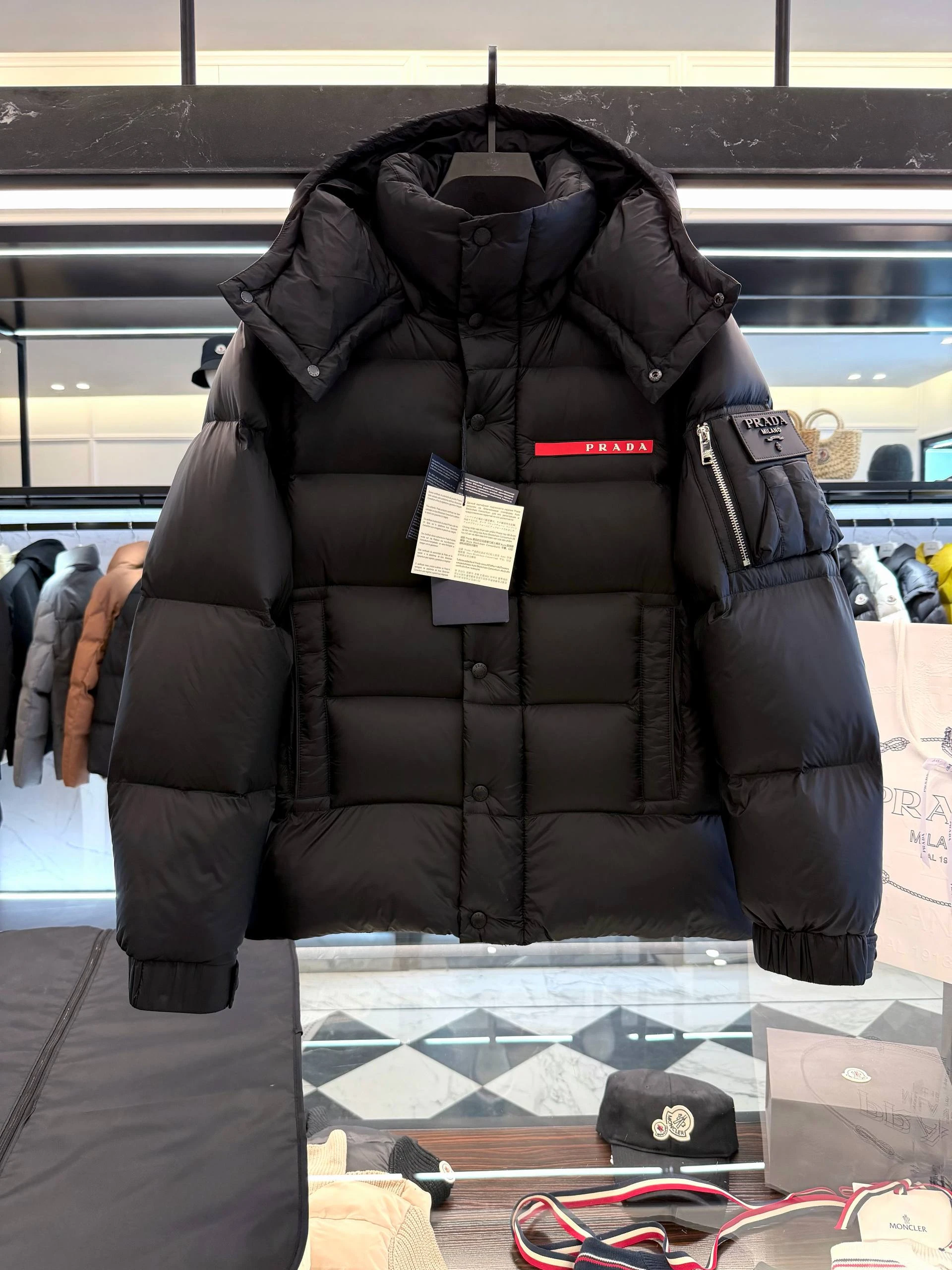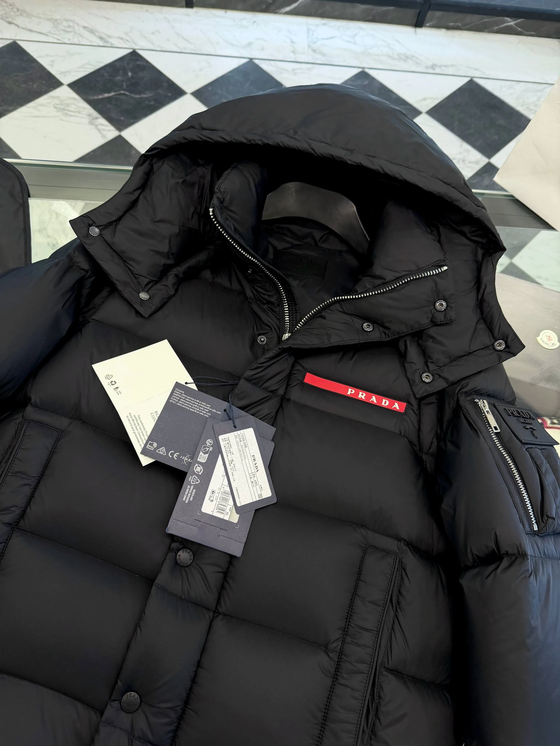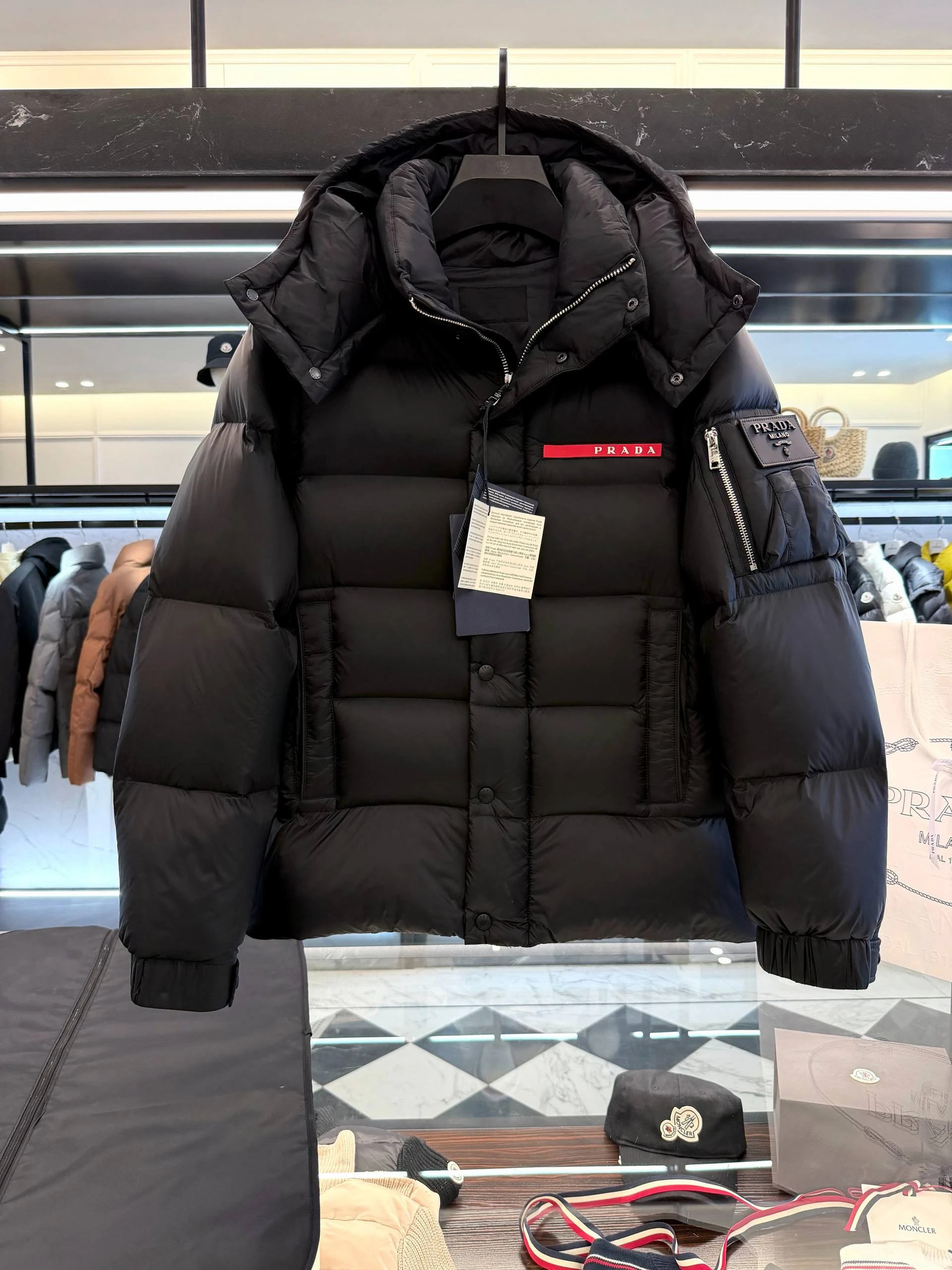 Мужской пуховик PRADA сочетает утилитарную функциональность и минималистичную люксовую эстетику. Глянцевая поверхность задаёт сдержанный, но выразительный тон. Объёмная квадратная стёжка создаёт равномерную теплоизоляцию и современный силуэт. Воротник-стойка плавно переходит в съёмный/фиксируемый капюшон с кнопочной системой крепления, обеспечивая дополнительную защиту от ветра и холода.