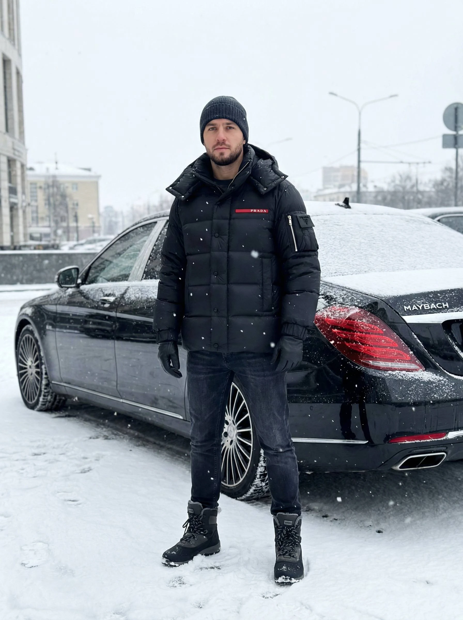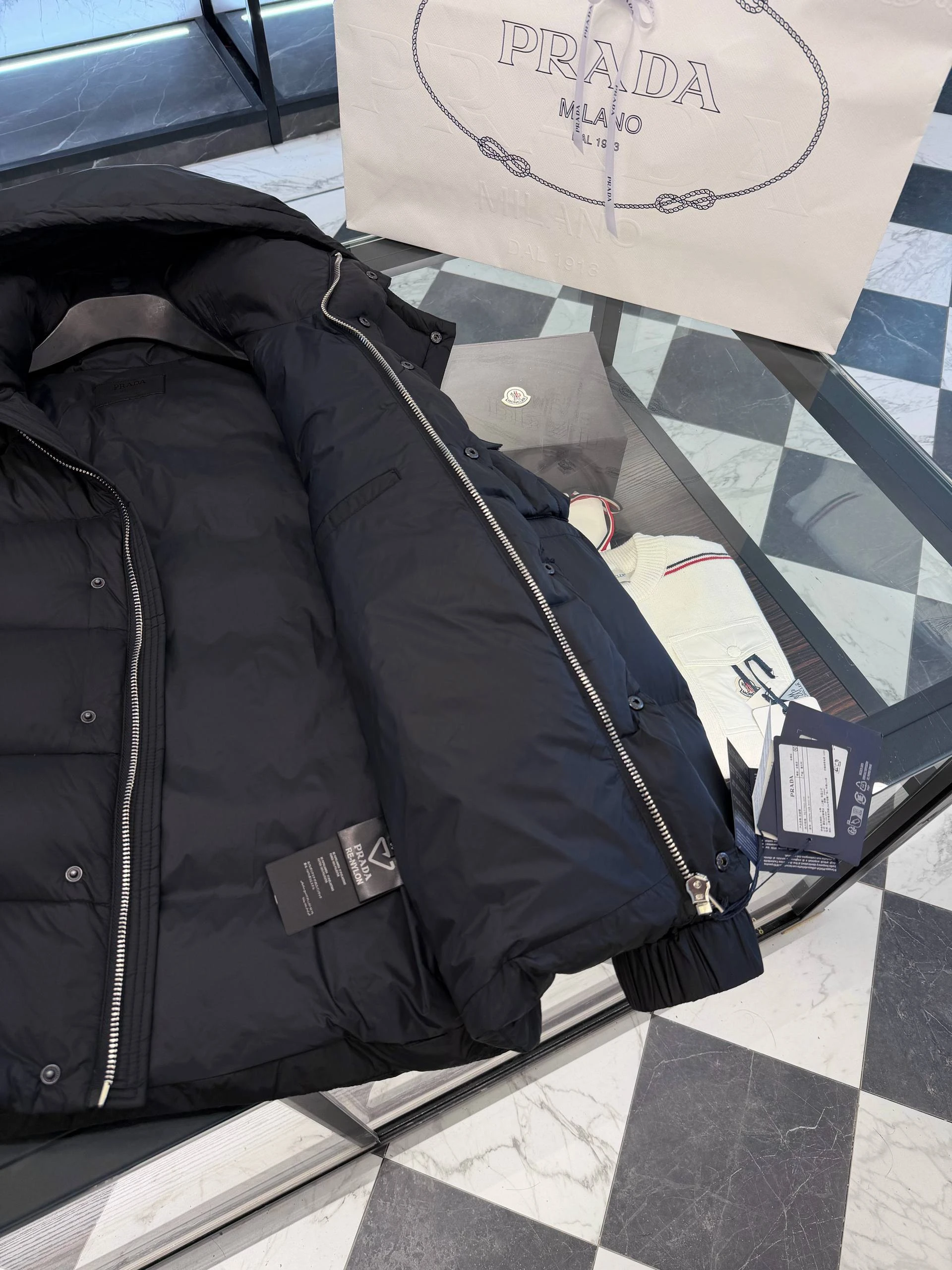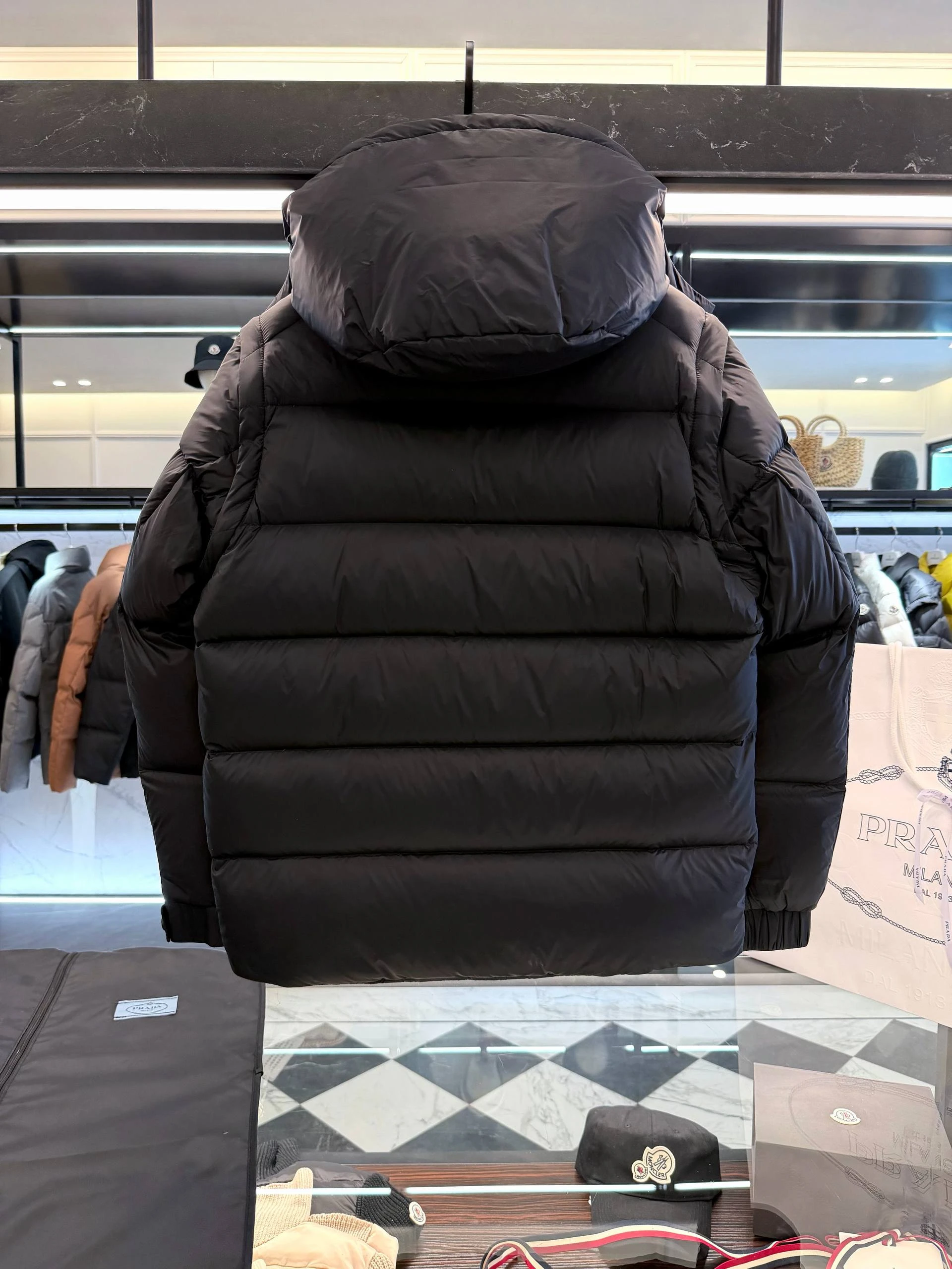 Мужской пуховик PRADA сочетает утилитарную функциональность и минималистичную люксовую эстетику. Глянцевая поверхность задаёт сдержанный, но выразительный тон. Объёмная квадратная стёжка создаёт равномерную теплоизоляцию и современный силуэт. Воротник-стойка плавно переходит в съёмный/фиксируемый капюшон с кнопочной системой крепления, обеспечивая дополнительную защиту от ветра и холода.