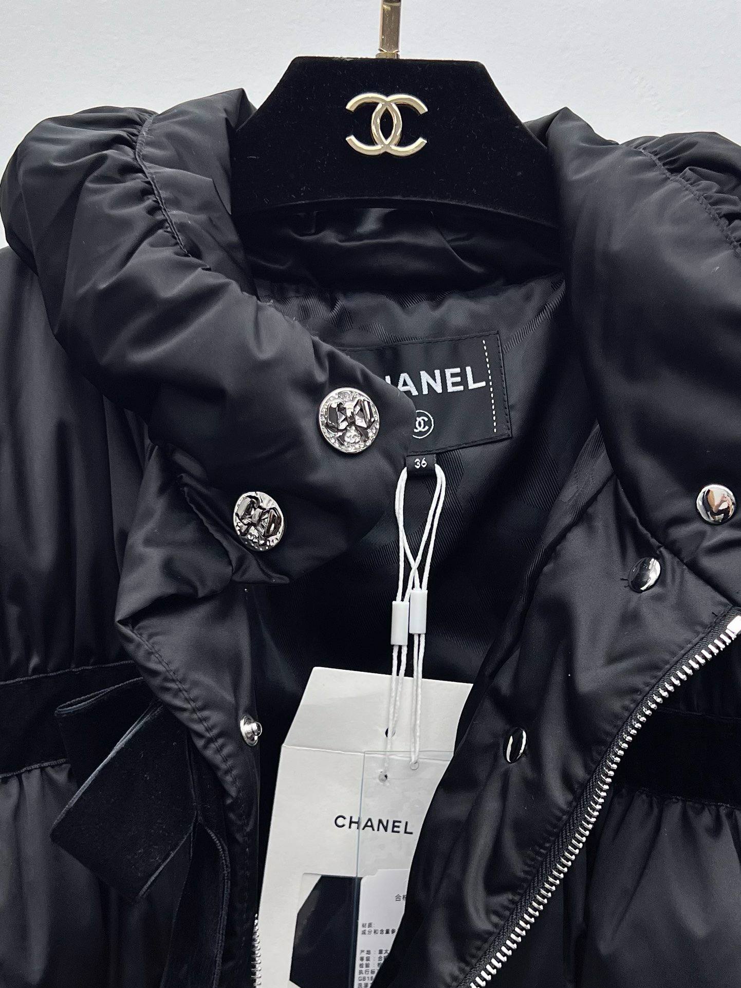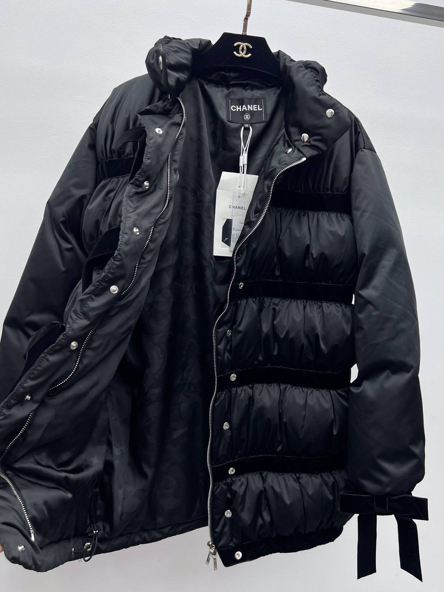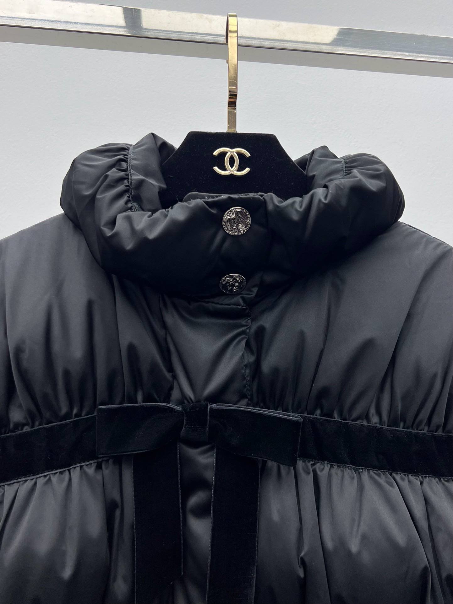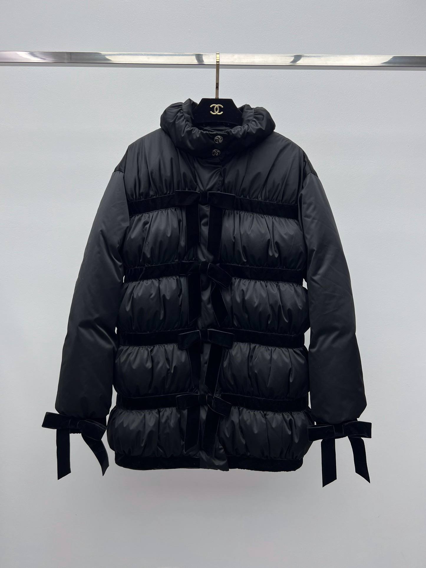 Пуховик выполнен в лаконичном чёрном оттенке с лёгким глянцевым эффектом внешней ткани. Силуэт — слегка свободный, длина до бёдер, с выраженными горизонтальными объёмными секциями, наполненными пухом для превосходной теплоизоляции. Воротник-стойка плотно облегает шею, застёгивается декоративными пуговицами сверху, защищая от ветра. Рукава гладкие, контрастируют по фактуре с корпусом, а элегантные бархатные ленты в несколько рядов по передней части и на манжетах придают пуховику изысканный, «шикарный» акцент, характерный для дома моды. Модель сочетает функциональность (тёплый наполнитель, закрытая линия застёжки) и декоративность (бархатные банты и аккуратная обработка).