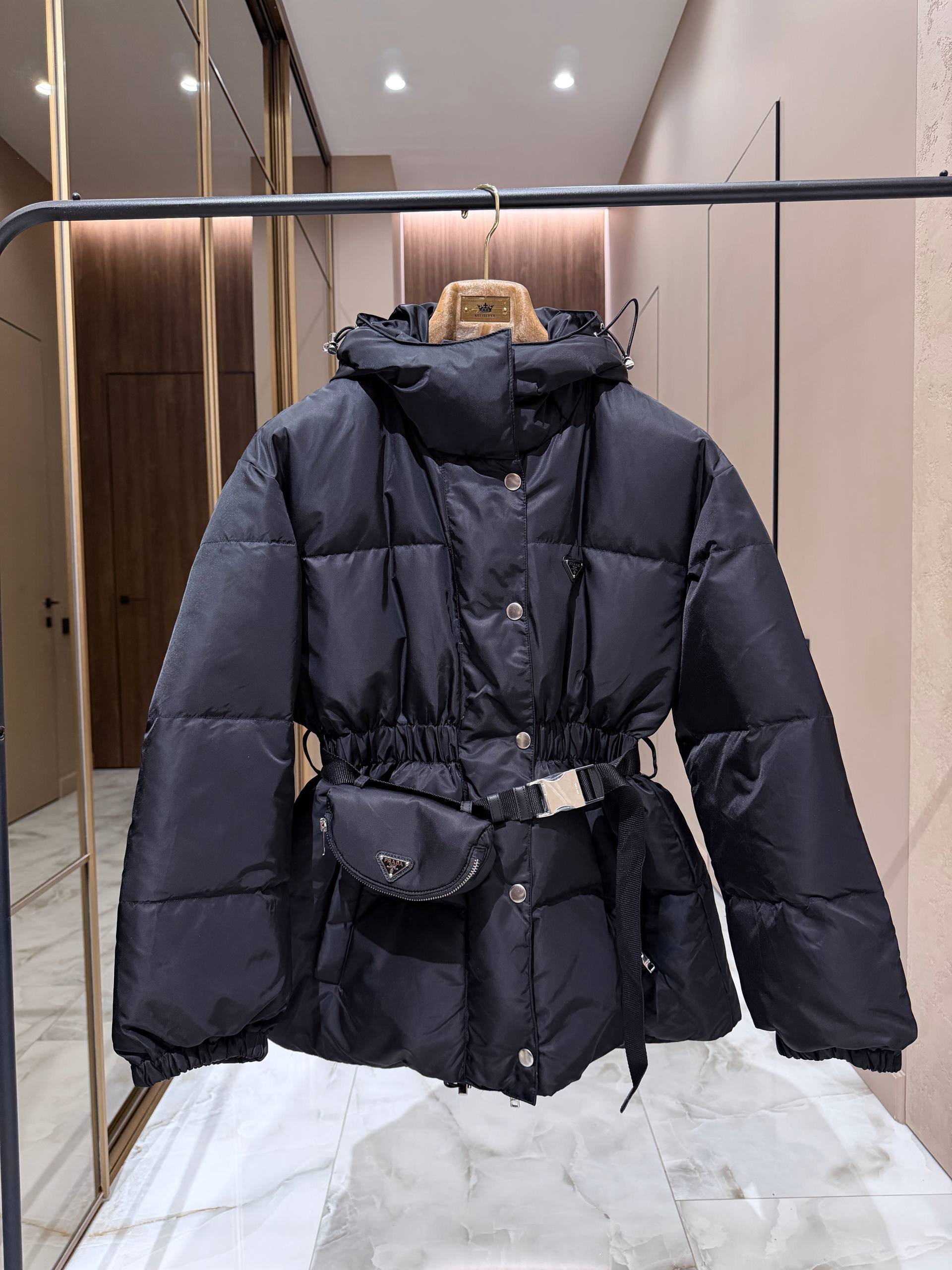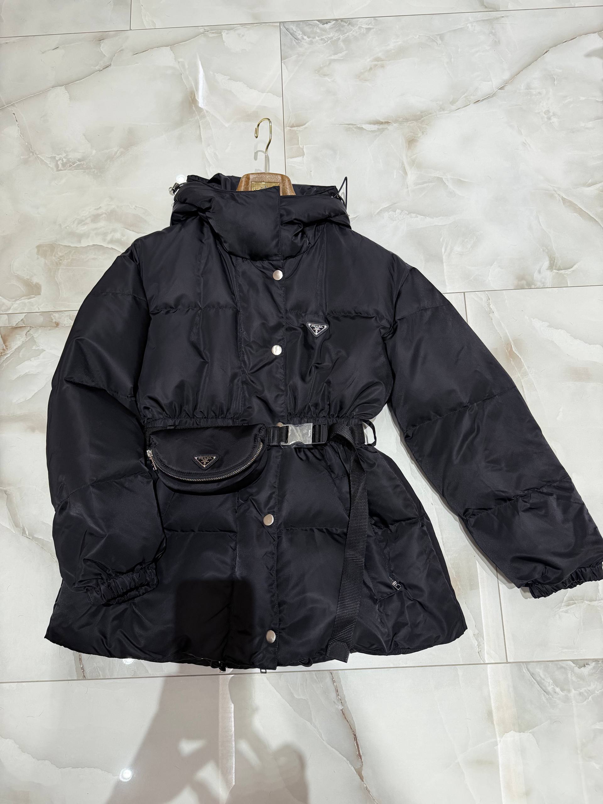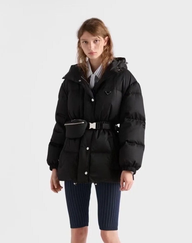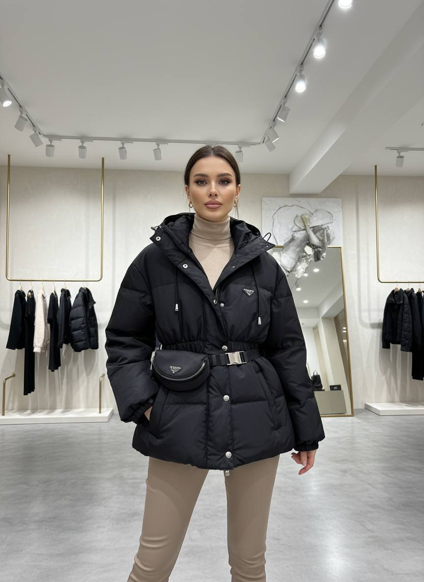 В комплект входит модная поясная сумка с фирменным логотипом Prada, которая не только служит стильным аксессуаром, но и позволяет удобно хранить необходимые мелочи. Куртка оснащена глубоким капюшоном, застёгивается на молнию и кнопки, а эластичные манжеты защищают от ветра. Универсальный чёрный цвет делает модель идеальным выбором для любого гардероба и городских образов.