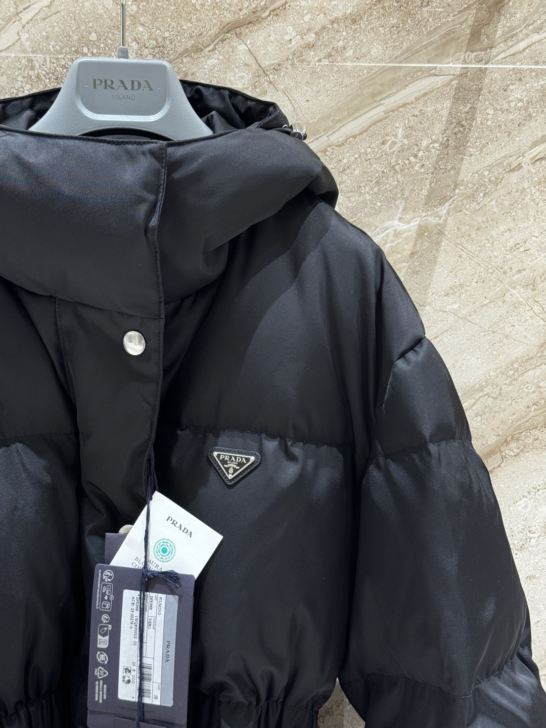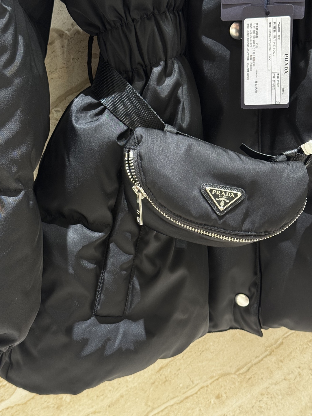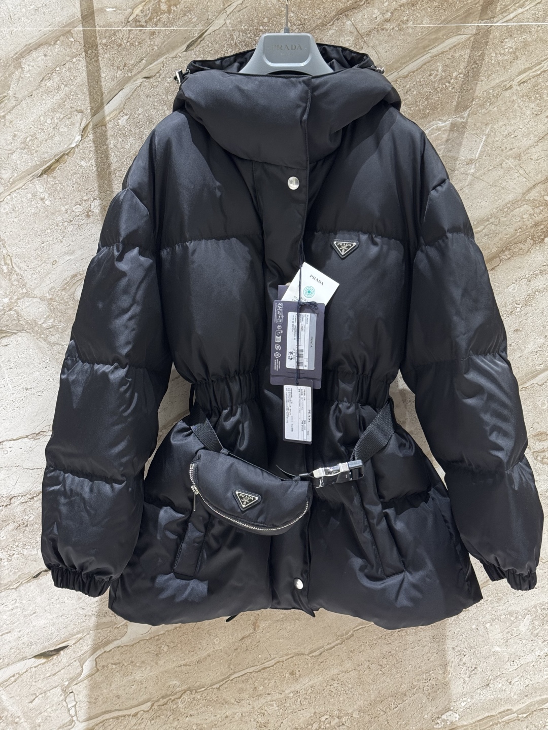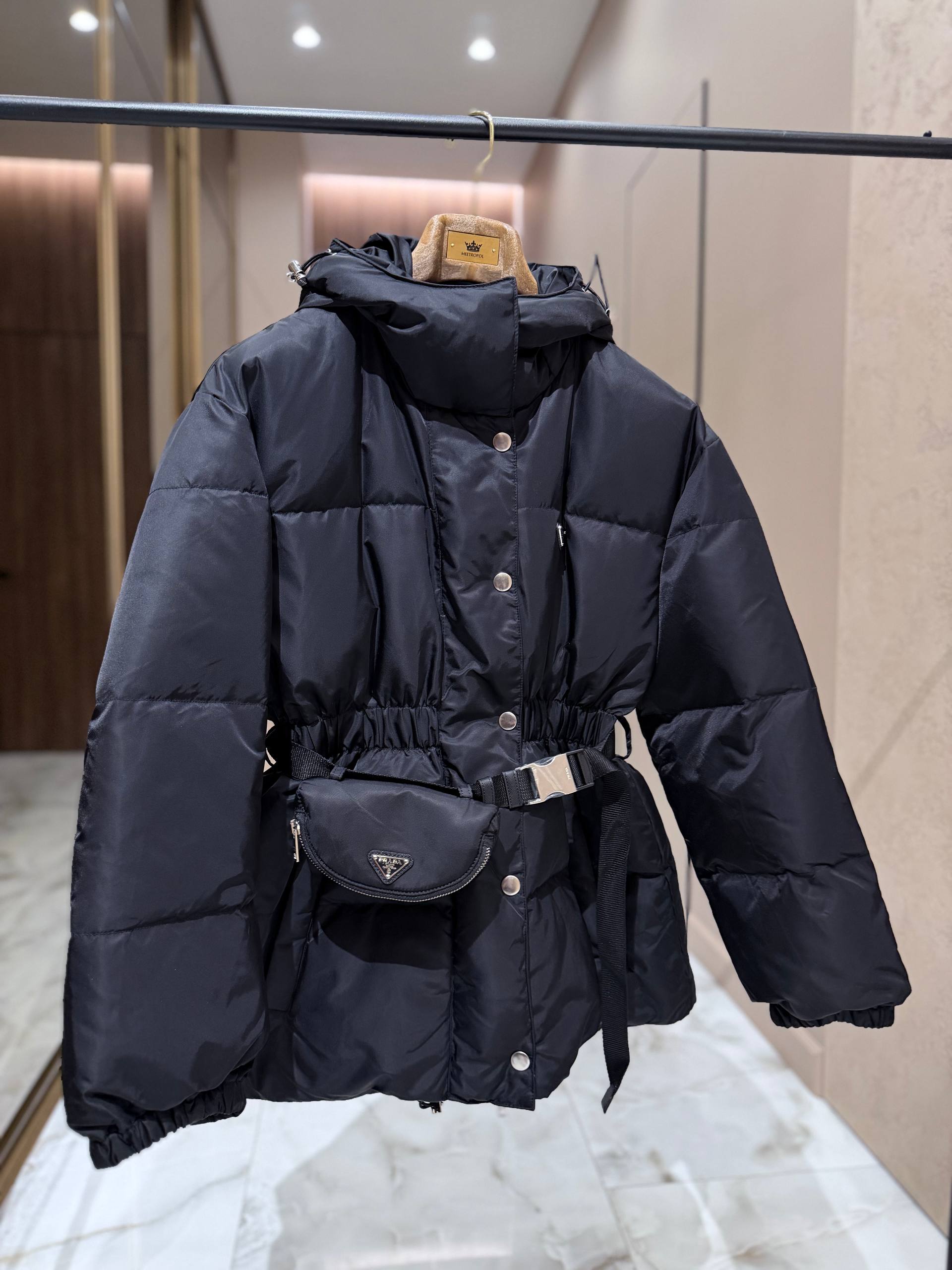 В комплект входит модная поясная сумка с фирменным логотипом Prada, которая не только служит стильным аксессуаром, но и позволяет удобно хранить необходимые мелочи. Куртка оснащена глубоким капюшоном, застёгивается на молнию и кнопки, а эластичные манжеты защищают от ветра. Универсальный чёрный цвет делает модель идеальным выбором для любого гардероба и городских образов.