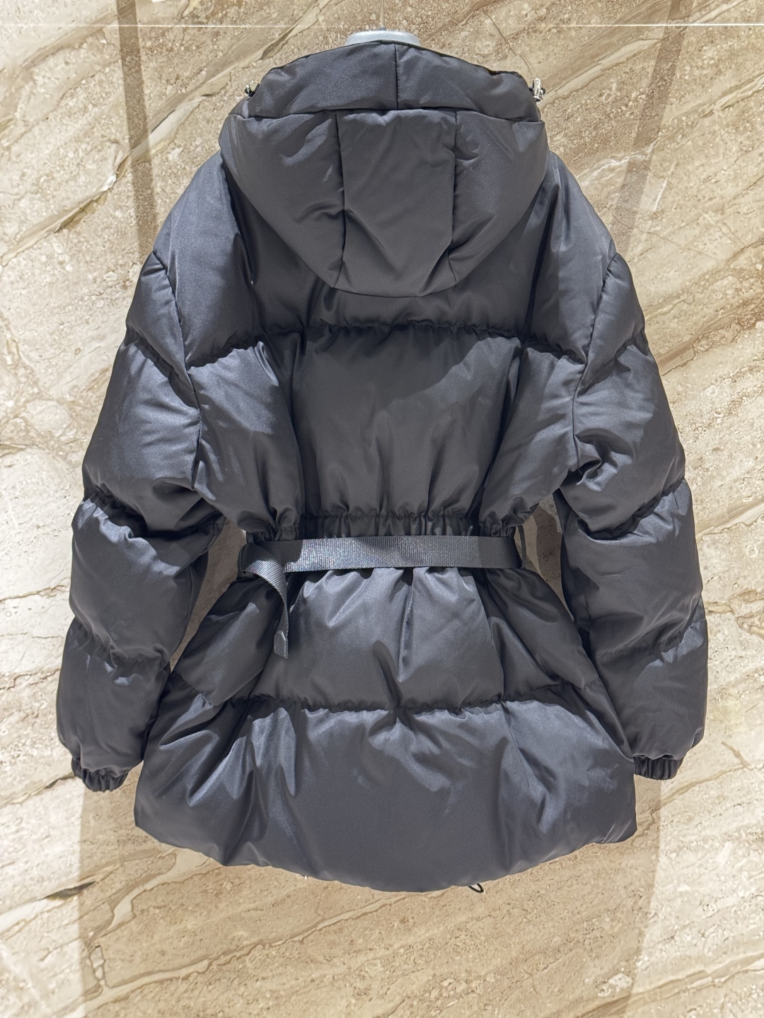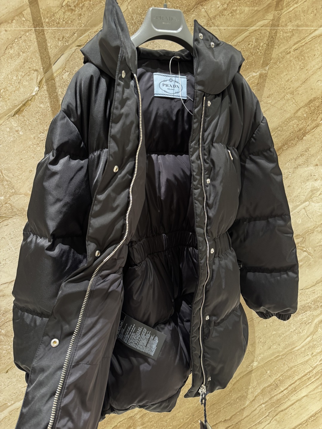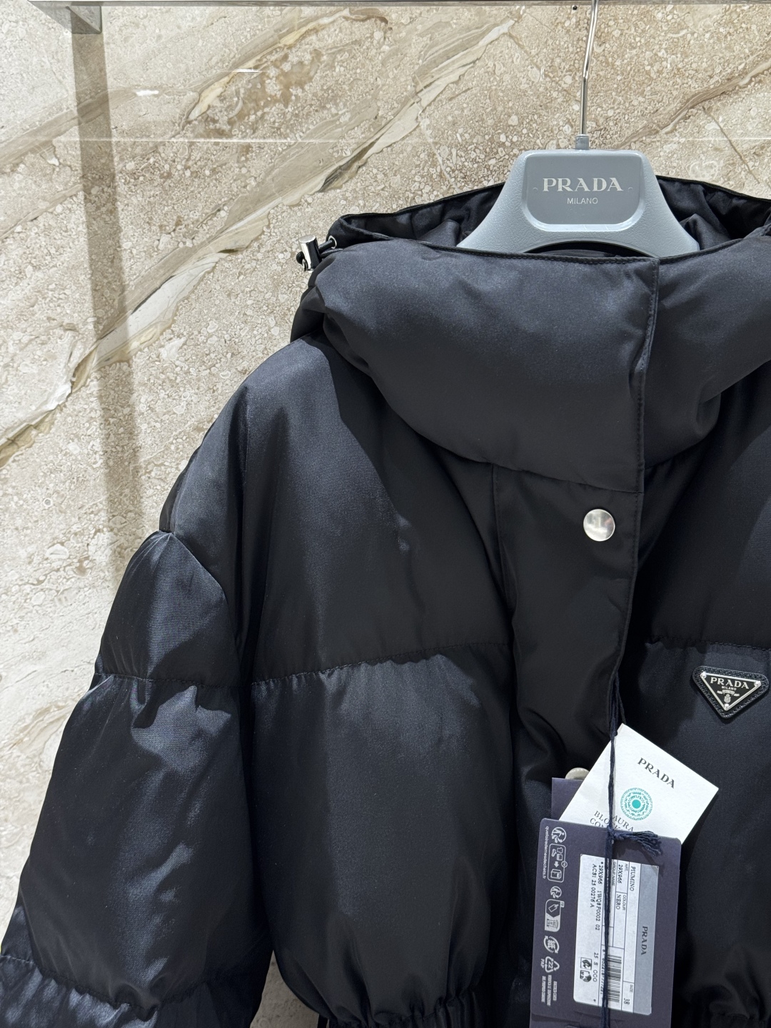 В комплект входит модная поясная сумка с фирменным логотипом Prada, которая не только служит стильным аксессуаром, но и позволяет удобно хранить необходимые мелочи. Куртка оснащена глубоким капюшоном, застёгивается на молнию и кнопки, а эластичные манжеты защищают от ветра. Универсальный чёрный цвет делает модель идеальным выбором для любого гардероба и городских образов.