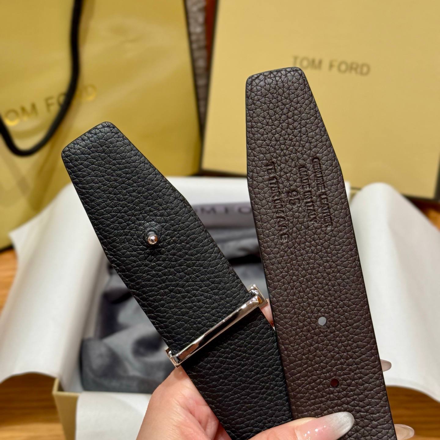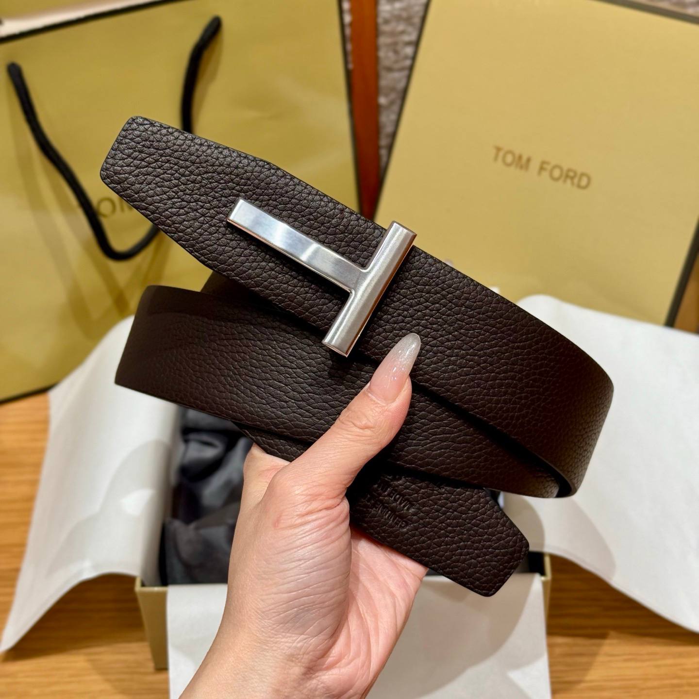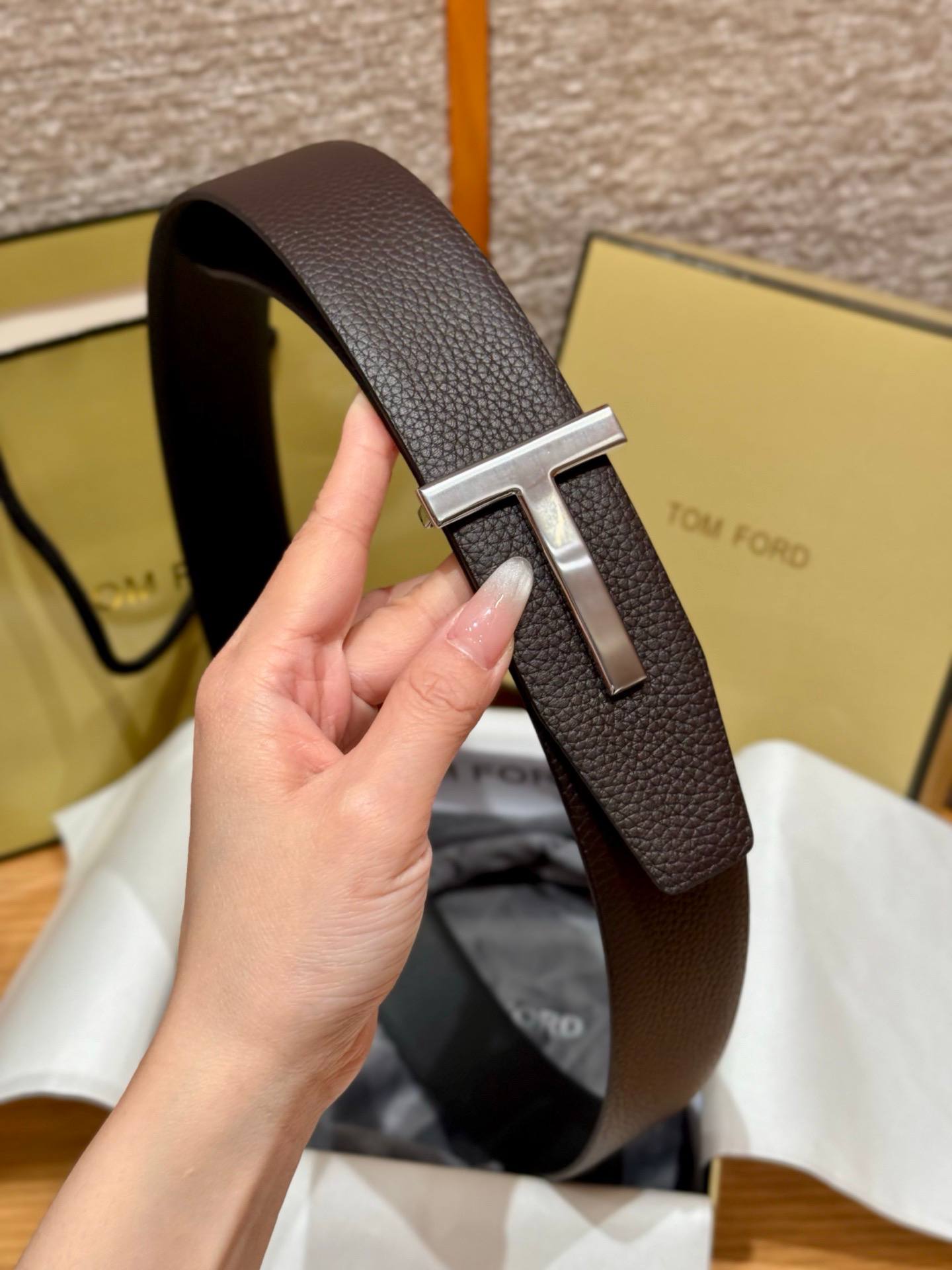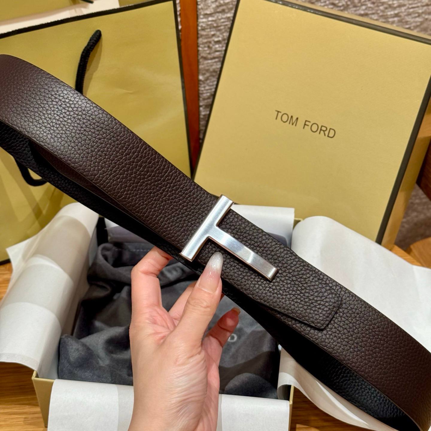• Дизайн: минималистичный лаконичный силуэт с акцентной пряжкой в форме буквы «T», привычной для мужских ремней TOM FORD. Пряжка серебристого оттенка придаёт изделию благородный, современный вид.