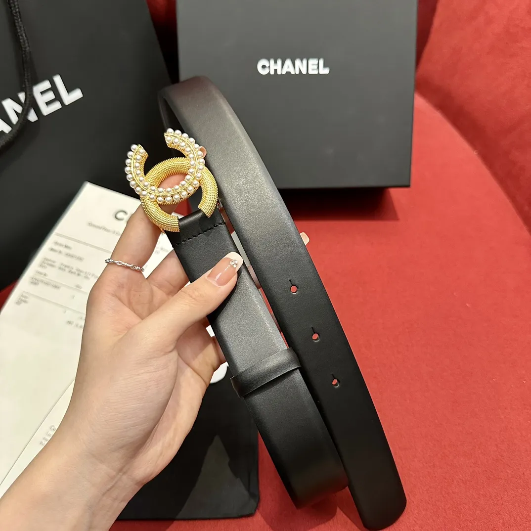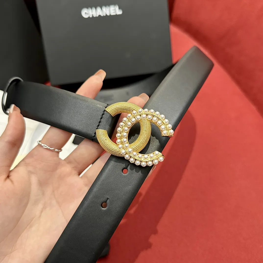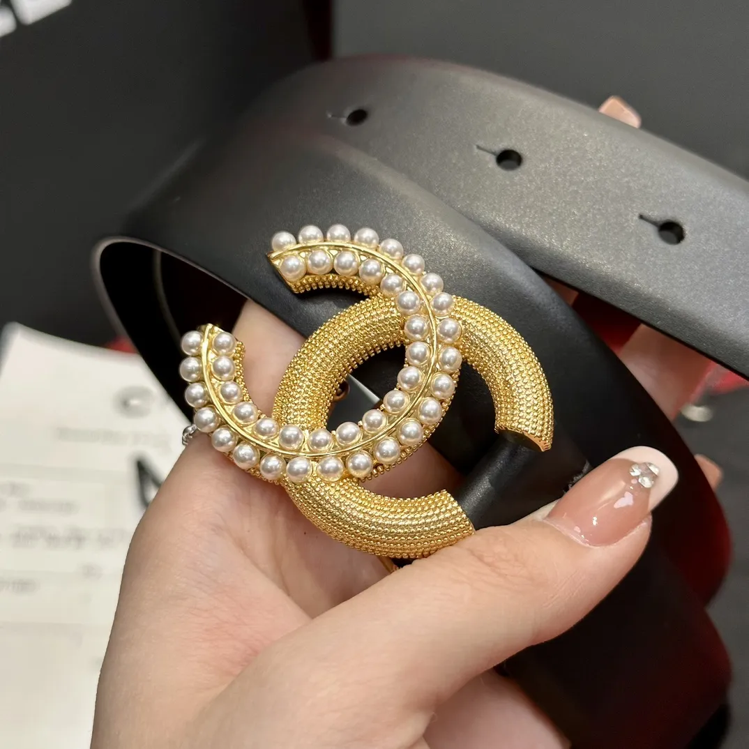 Классический повседневный женский ремень Chanel с комбинированной жемчужной и ребристой пряжкой из меди и натуральной воловьей кожи. Ширина 3,0 см