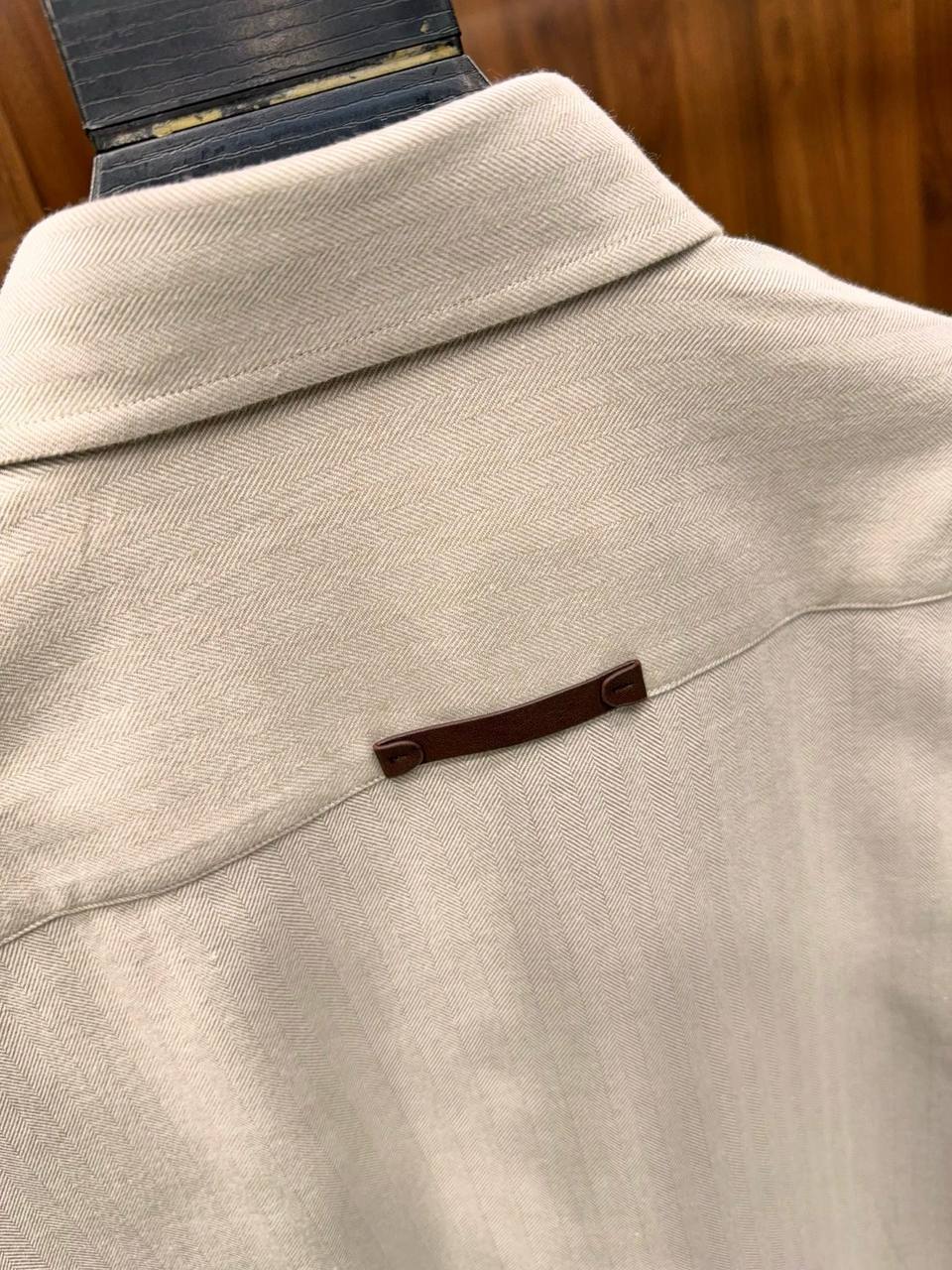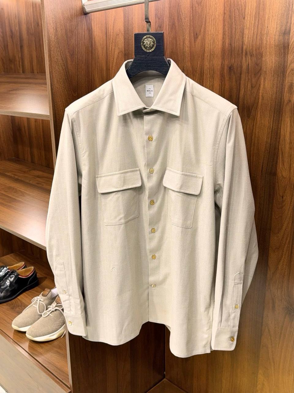 Элегантная мужская рубашка премиального бренда BERLUTI — идеальный выбор для стильных и уверенных в себе мужчин. Модель выполнена из высококачественного материала светло-бежевого оттенка, который подойдет как для офисного образа, так и для повседневной носки.