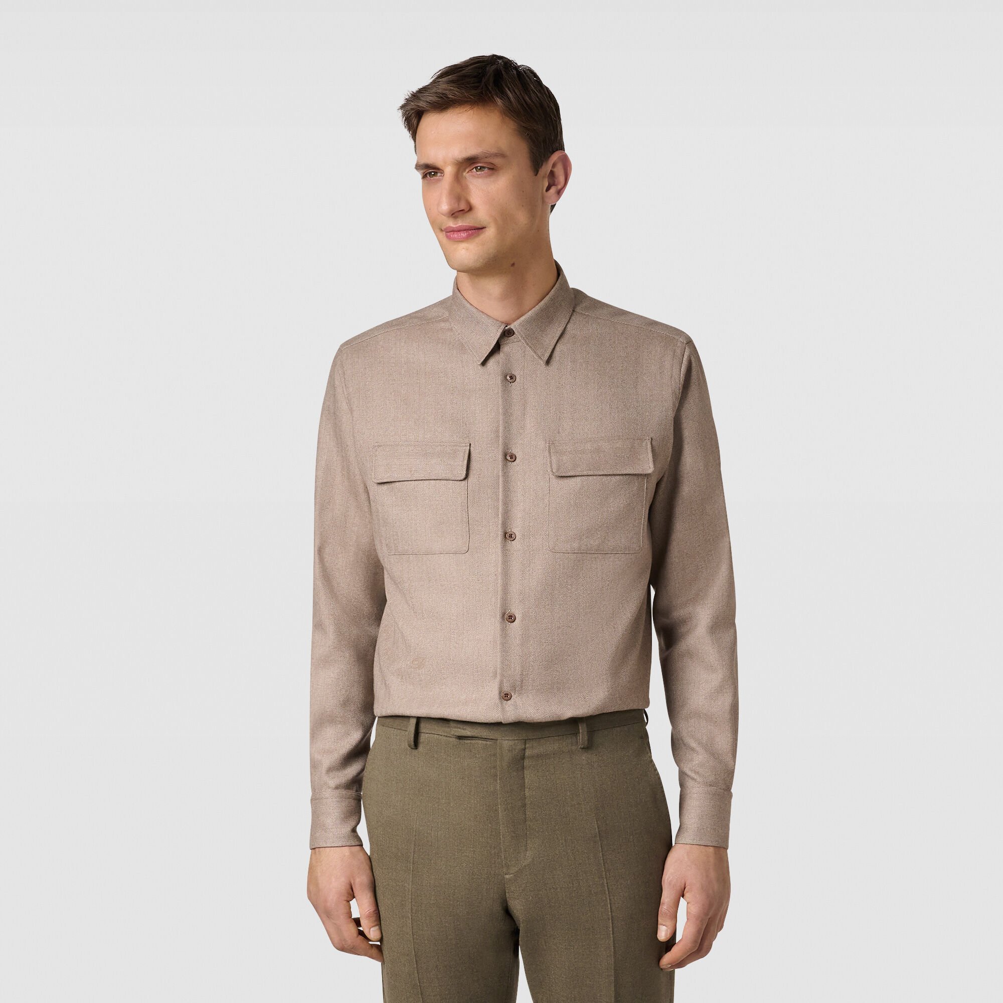Отличительными деталями рубашки являются классический воротник, золотистые пуговицы и две накладные нагрудные карманы с клапанами, придающие изделию нотку лаконичности и практичности. Длинные рукава с манжетами на пуговицах обеспечивают комфорт и завершенность образа.
