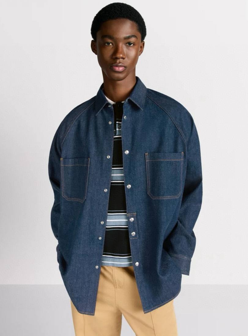 Стильная и универсальная мужская рубашка от Christian Dior, выполненная из натурального хлопка. Модель представлена в классическом темно-синем оттенке с эффектом денима, украшена контрастной строчкой и фирменной фурнитурой.