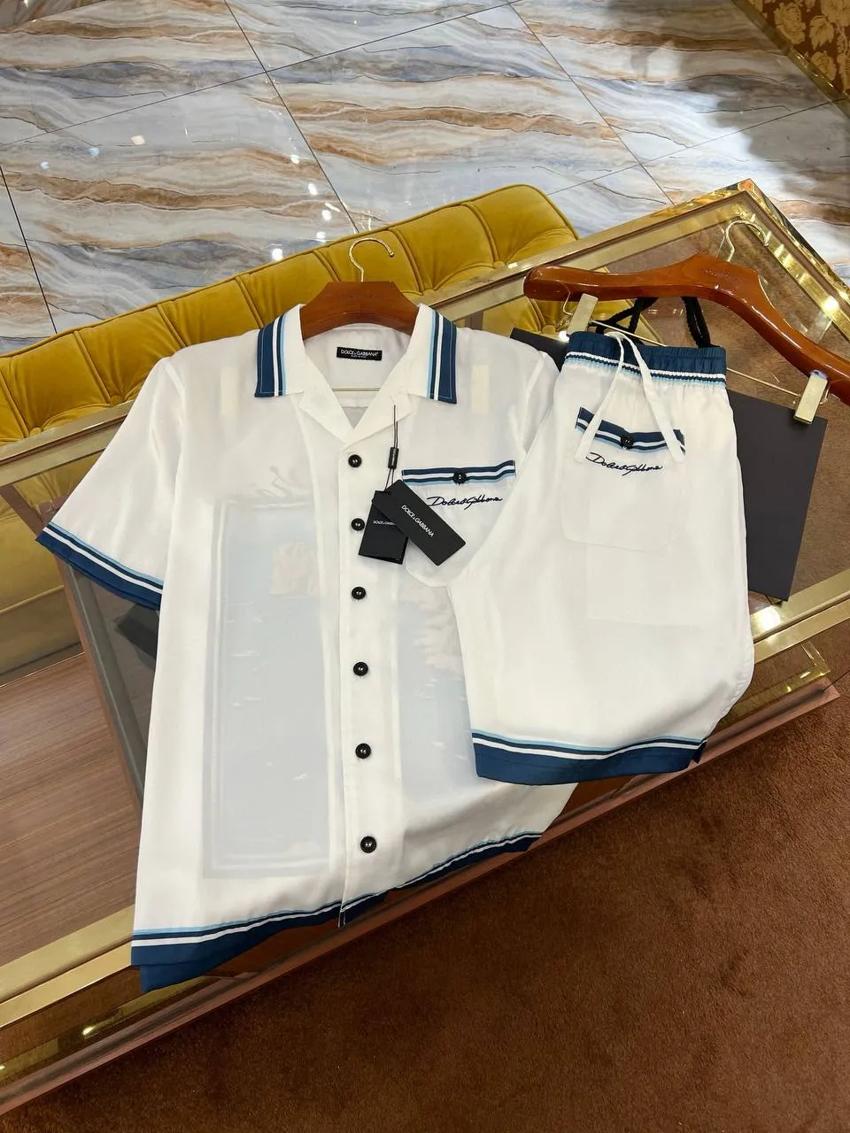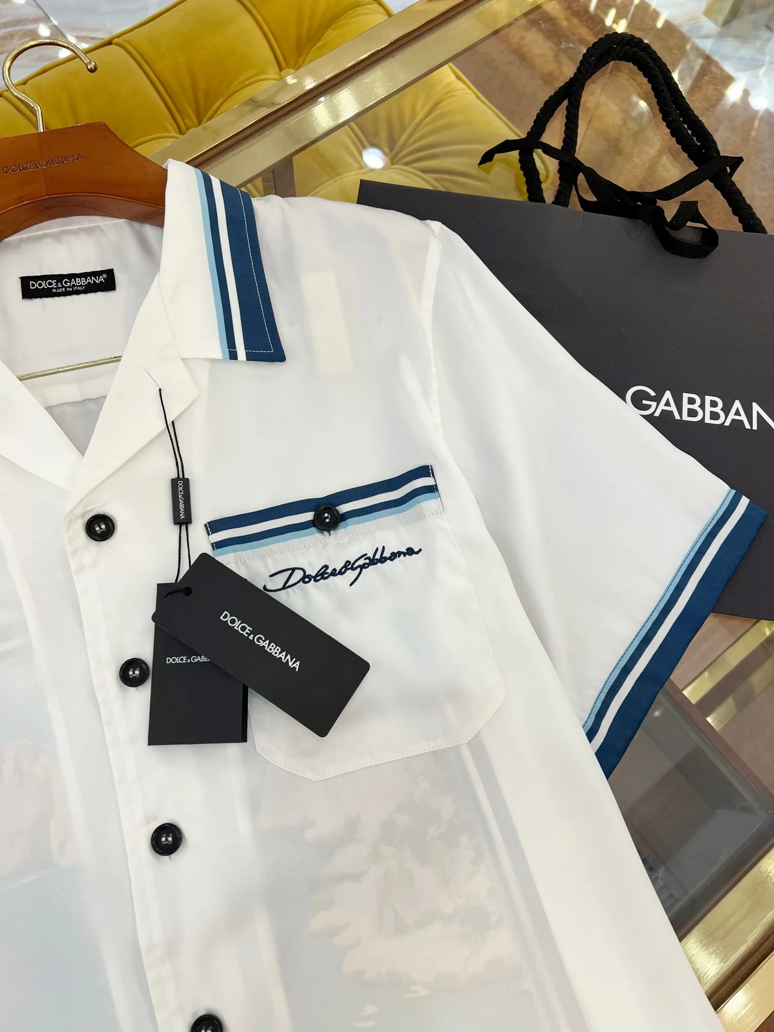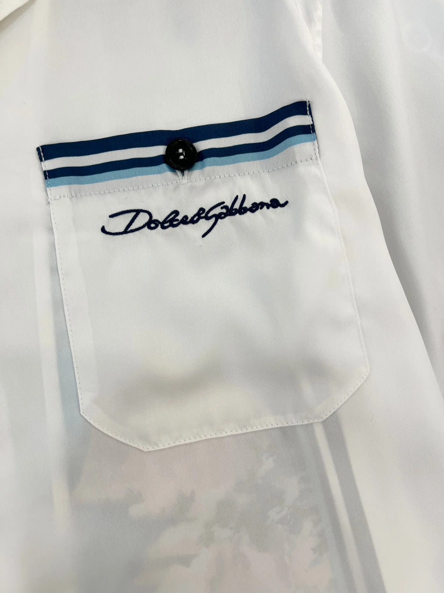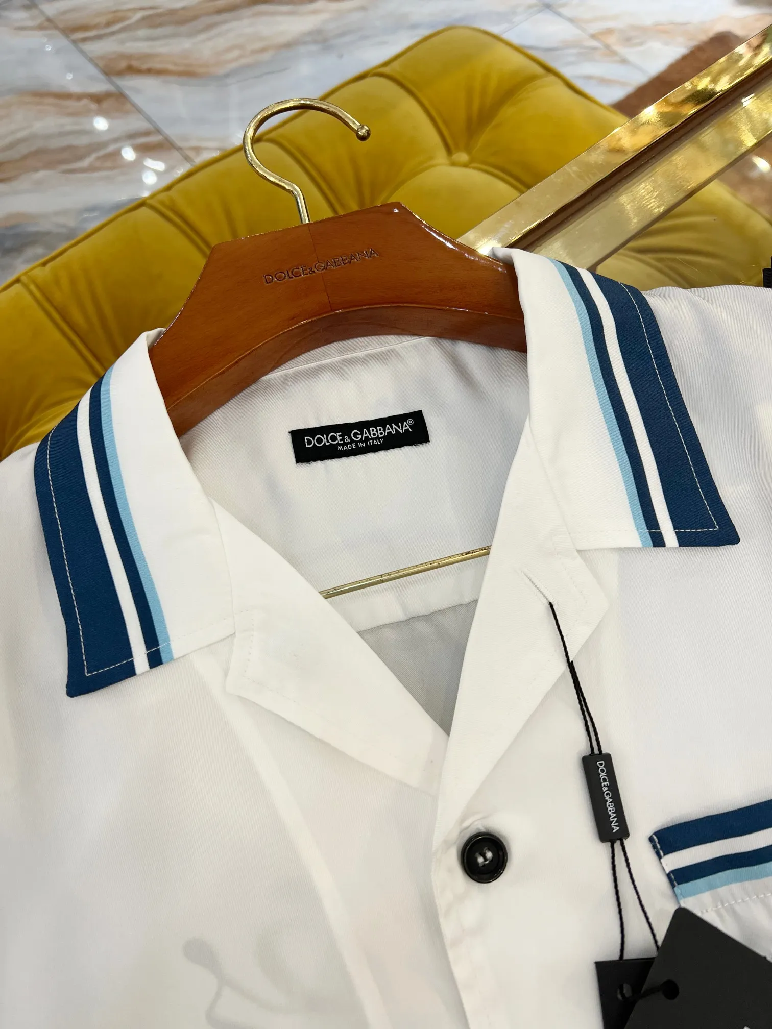Элегантная мужская рубашка Dolce & Gabbana из натурального шелка — воплощение стиля и роскоши. Модель выполнена в классическом белом цвете с контрастной отделкой на воротнике, рукавах и по низу изделия, подчёркивая современный характер бренда.