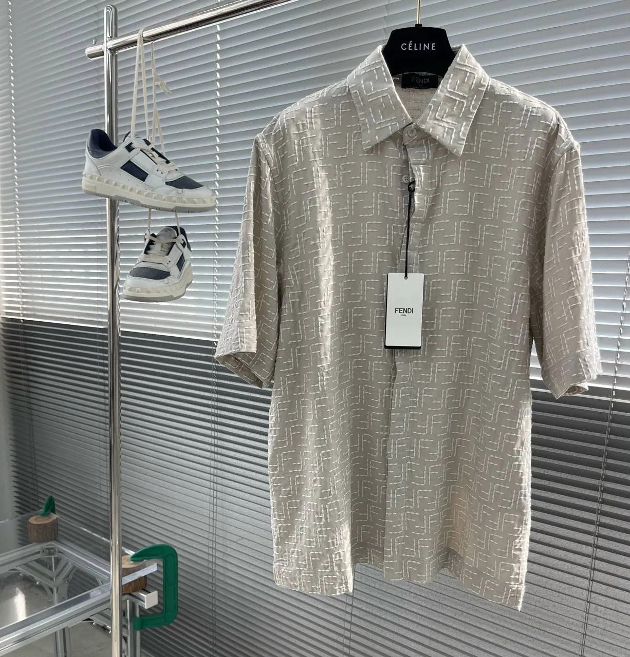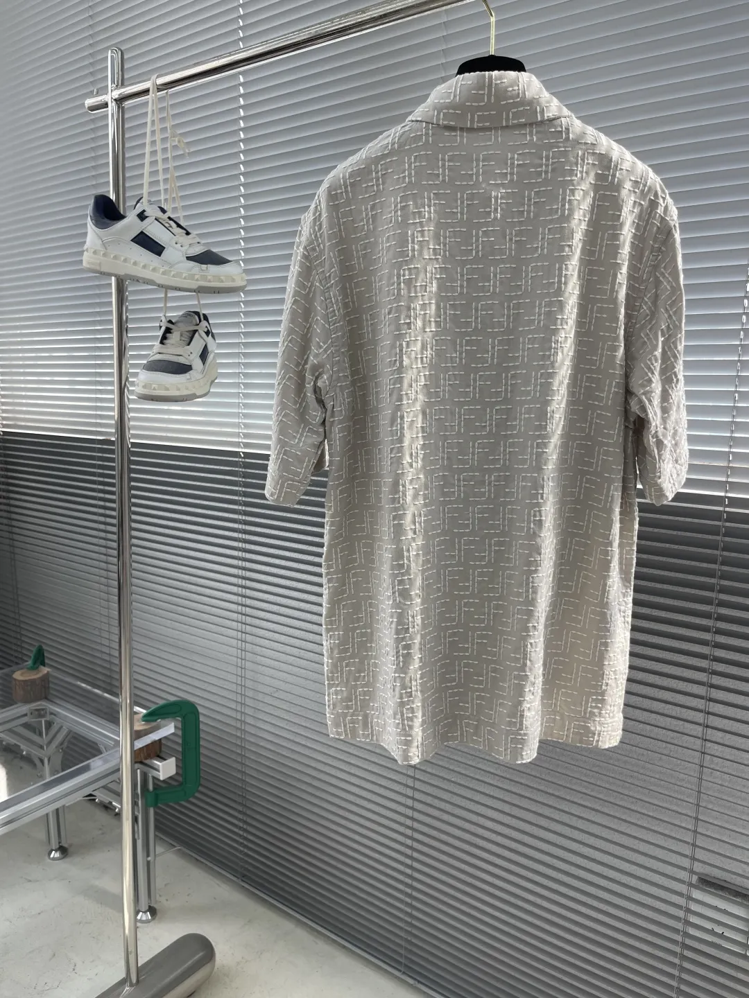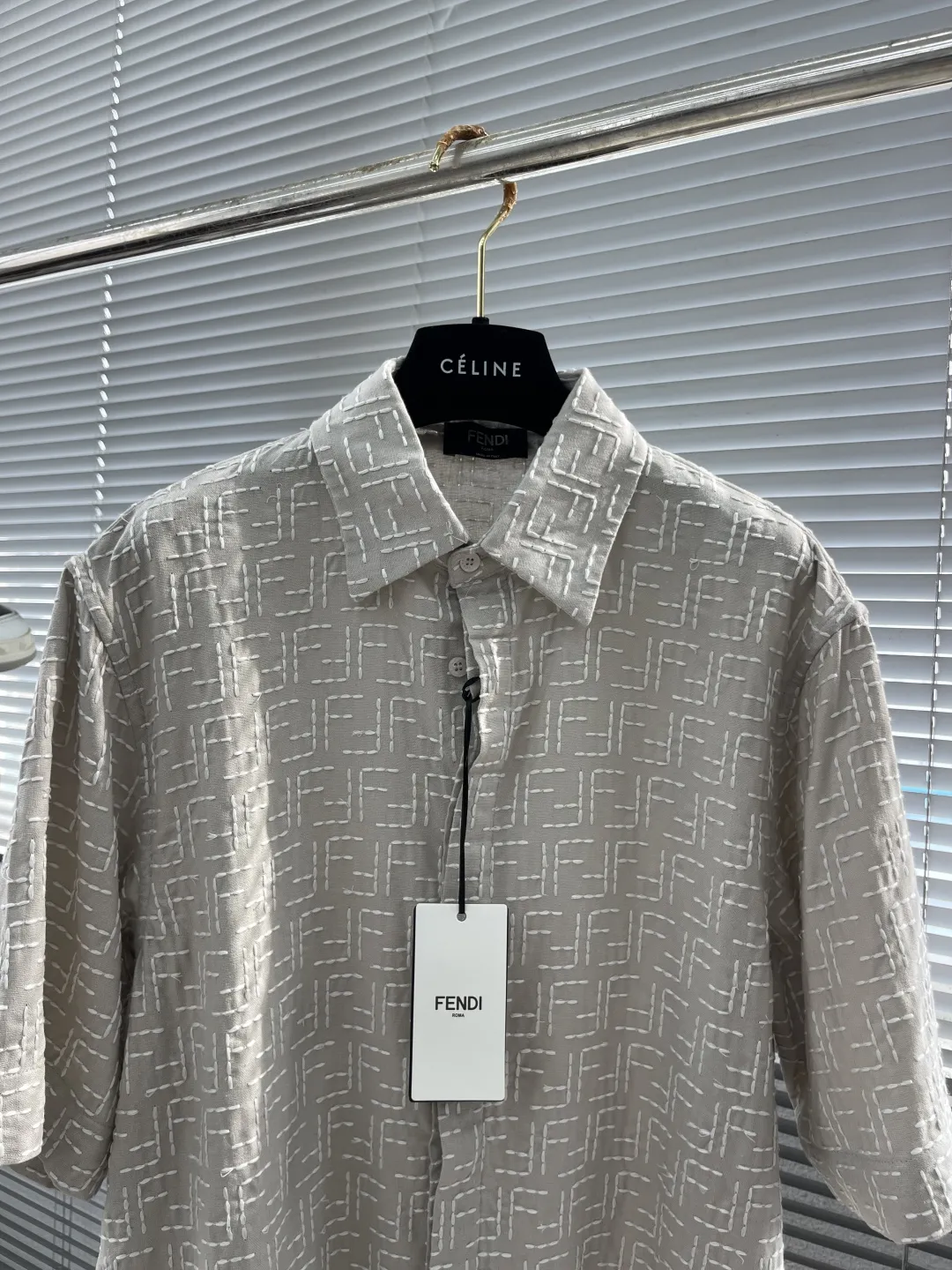 Украшена фирменным жаккардовым узором с монограммой Fendi по всей поверхности, что придаёт изделию роскошный и узнаваемый вид. Классический отложной воротник и аккуратная планка с пуговицами завершают лаконичный, но элегантный образ.