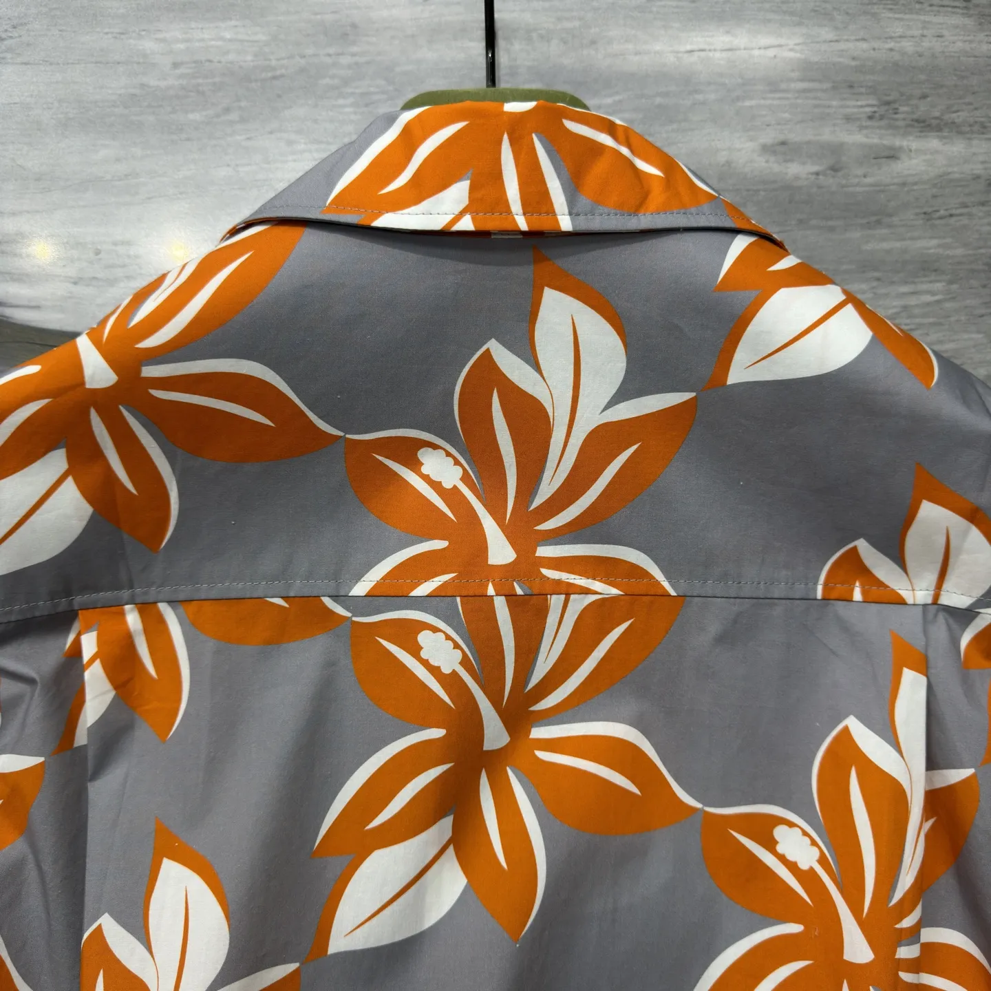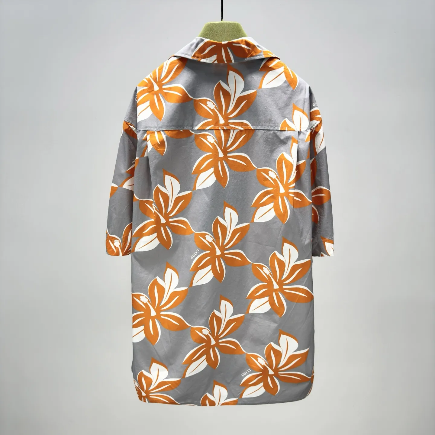 Рубашка из хлопкового поплина с принтом Gucci из коллекции Весна/Лето 2025 года представляет собой стильный и яркий элемент гардероба. Её оригинальный принт с изображениями гибискуса и банановых листьев создает атмосферу расслабленного летнего отдыха. Серо-оранжевый оттенок хлопка-поплина добавляет свежести, а перламутровые пуговицы придают изделию элегантный и уникальный штрих. Легкий и дышащий материал делает эту рубашку идеальной для теплого времени года, обеспечивая комфорт и стиль.