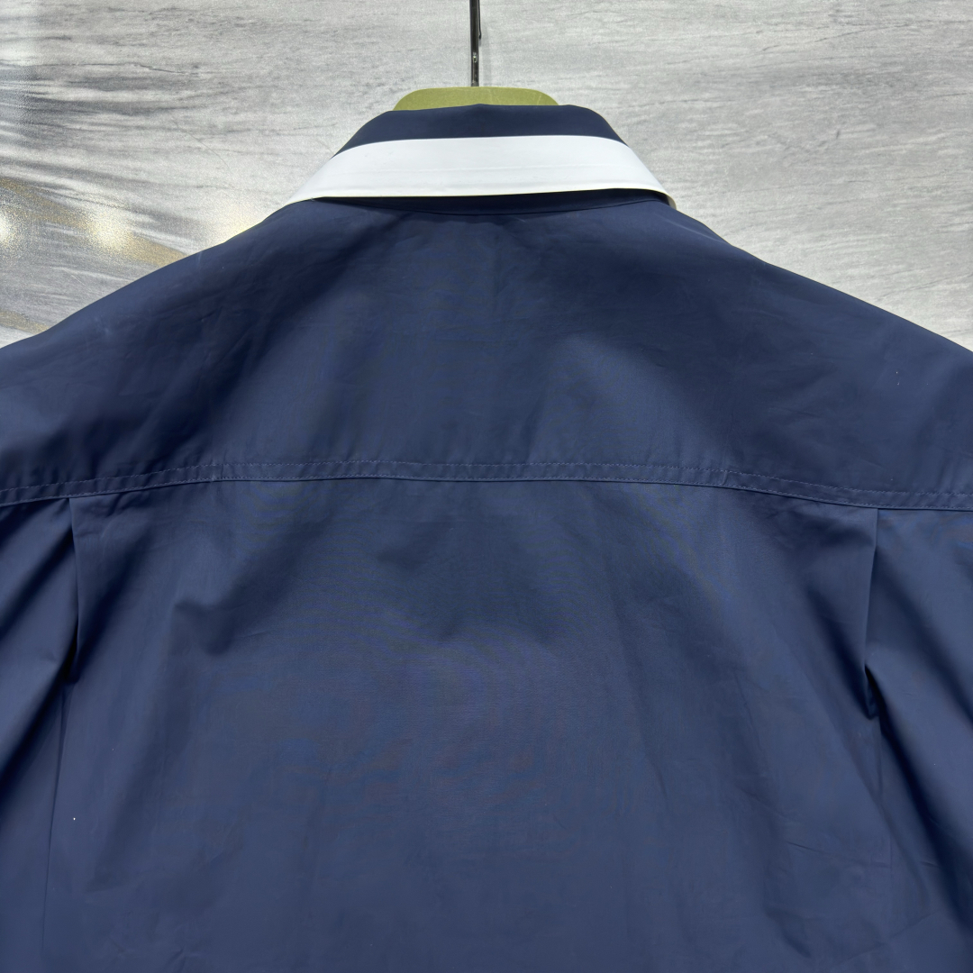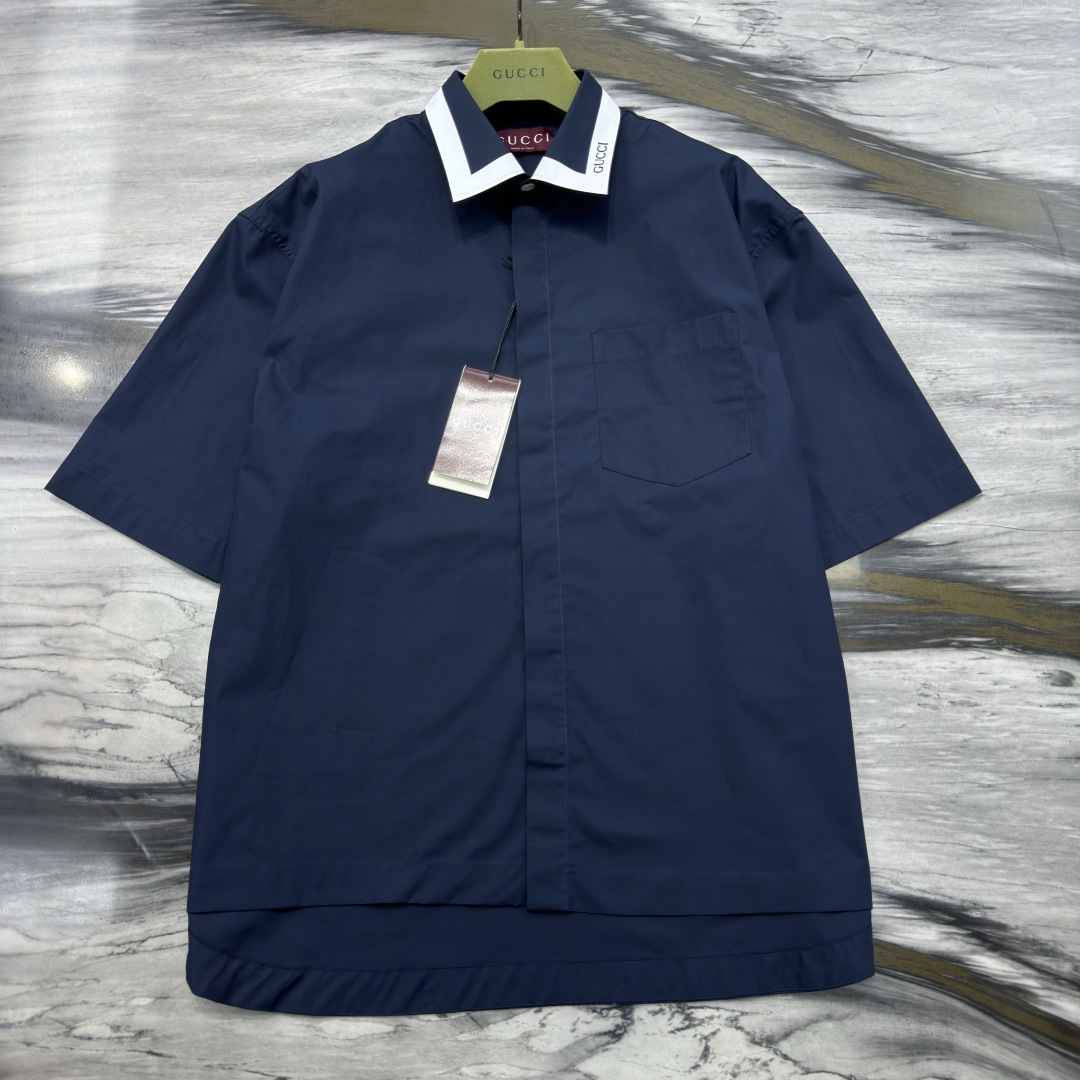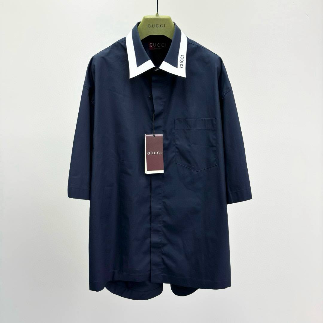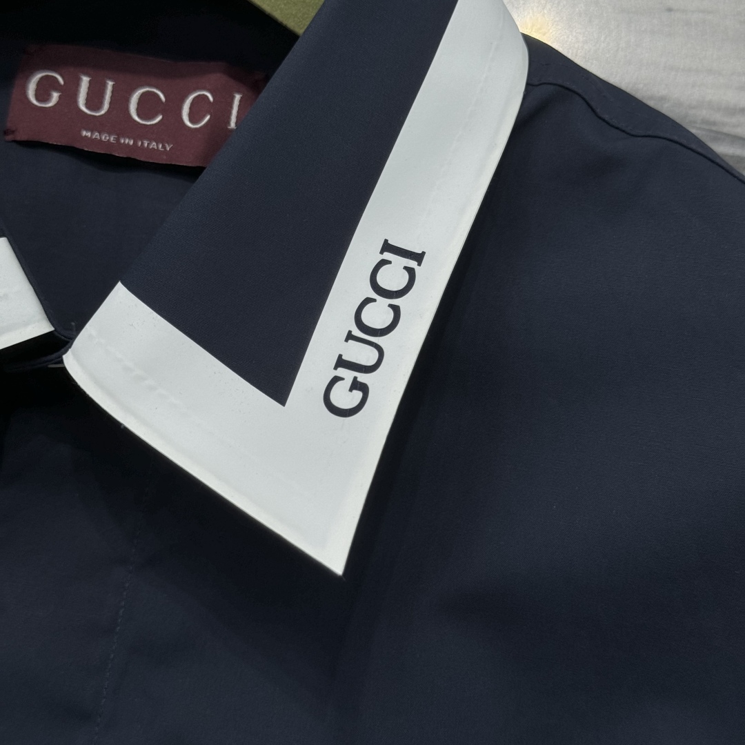 Рубашка украшена контрастным белым воротником с фирменной надписью Gucci, что добавляет изделию узнаваемый акцент. Скрытая застёжка и аккуратный нагрудный карман подчёркивают лаконичный и элегантный дизайн. Идеальный выбор для тех, кто ценит люксовую классику с ноткой современности.