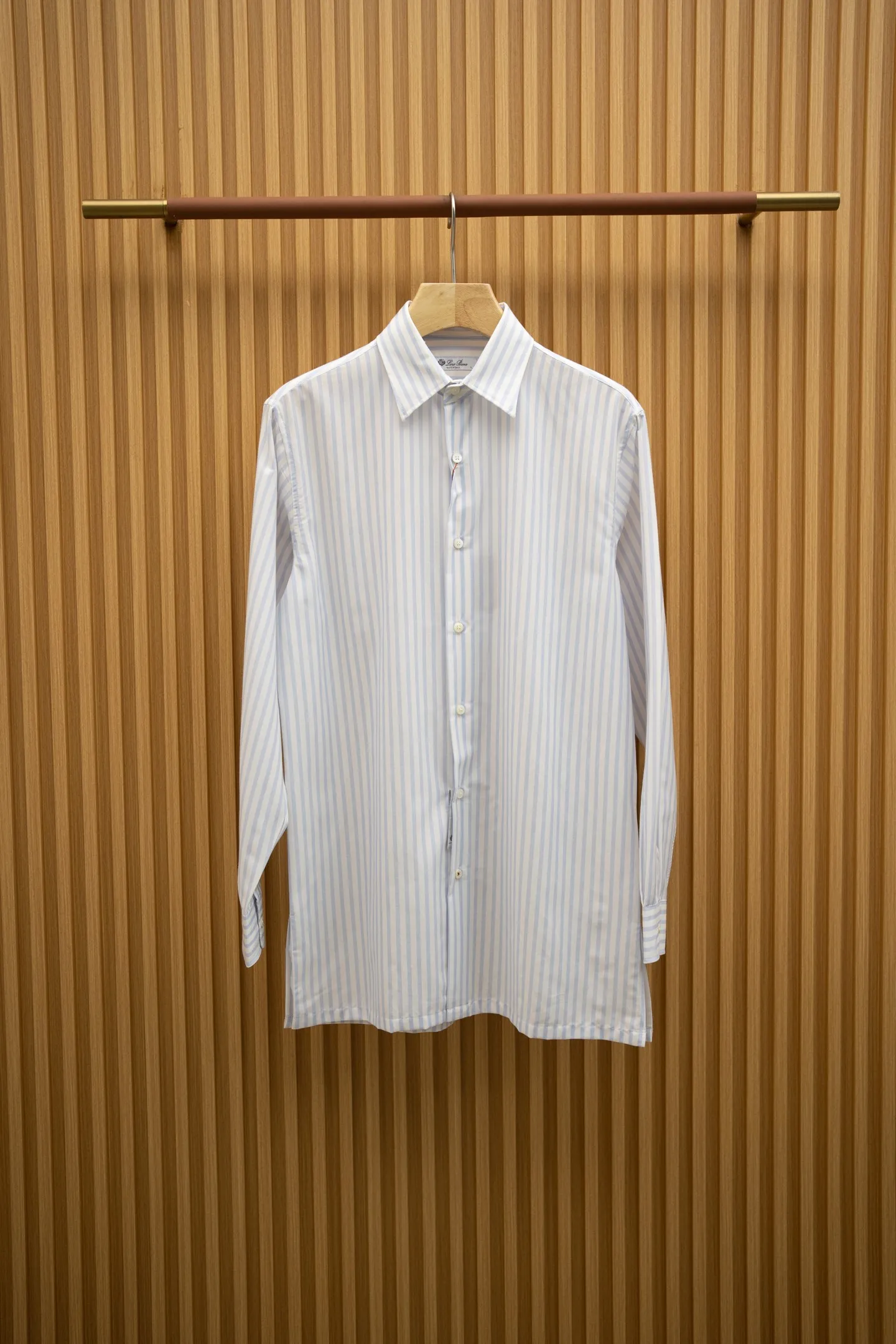 Элегантная мужская рубашка Loro Piana выполнена из эксклюзивного сочетания хлопка и шелка, что обеспечивает невероятную мягкость и комфорт при носке. Легкая, дышащая ткань с деликатным блеском придаёт изделию утончённый и благородный вид.