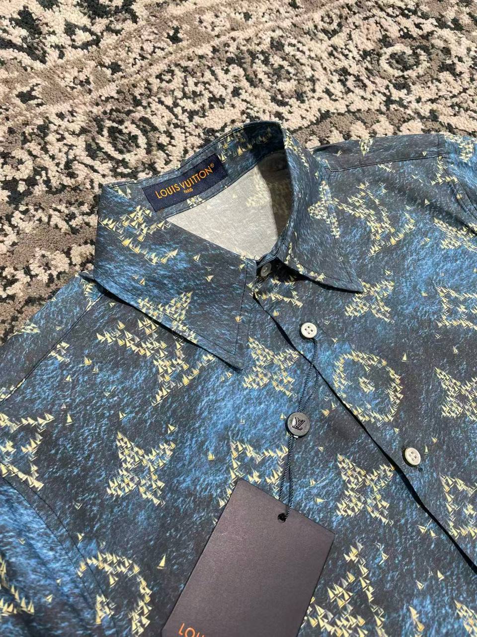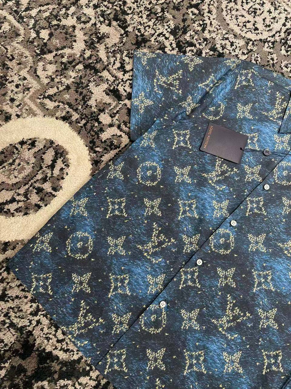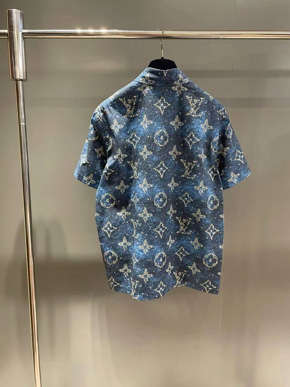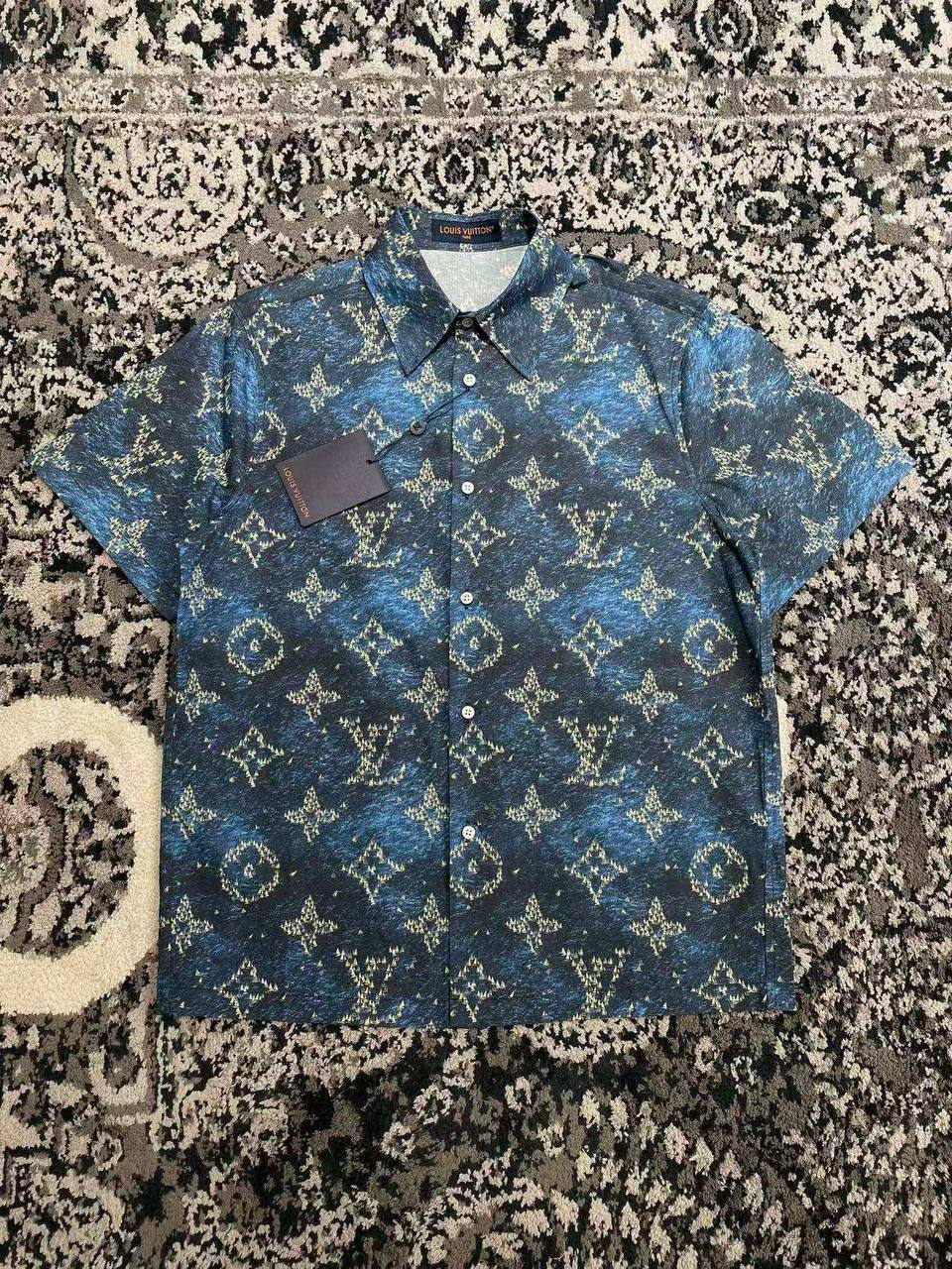 Стильная мужская рубашка от Louis Vuitton выполнена из высококачественного материала и украшена узнаваемым фирменным монограммным узором бренда. Модель с коротким рукавом выполнена в элегантной синей цветовой гамме с необычным эффектом джинсовой текстуры, что придаёт образу современность и лёгкую небрежность.
