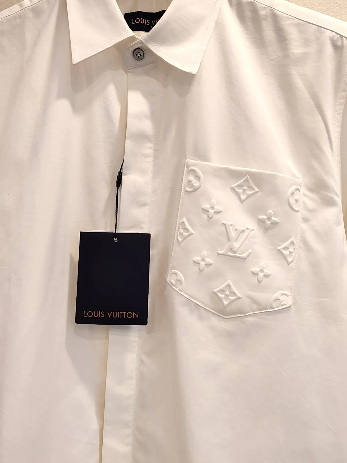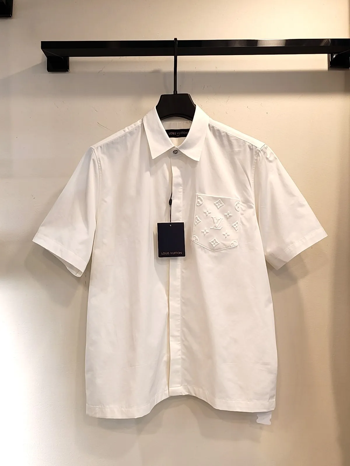 Стильная мужская рубашка от Louis Vuitton выполнена из высококачественного хлопка белого цвета. Модель с короткими рукавами отличается лаконичным дизайном и минималистичным, но узнаваемым акцентом — на нагрудном кармане вышит культовый узор Louis Vuitton.