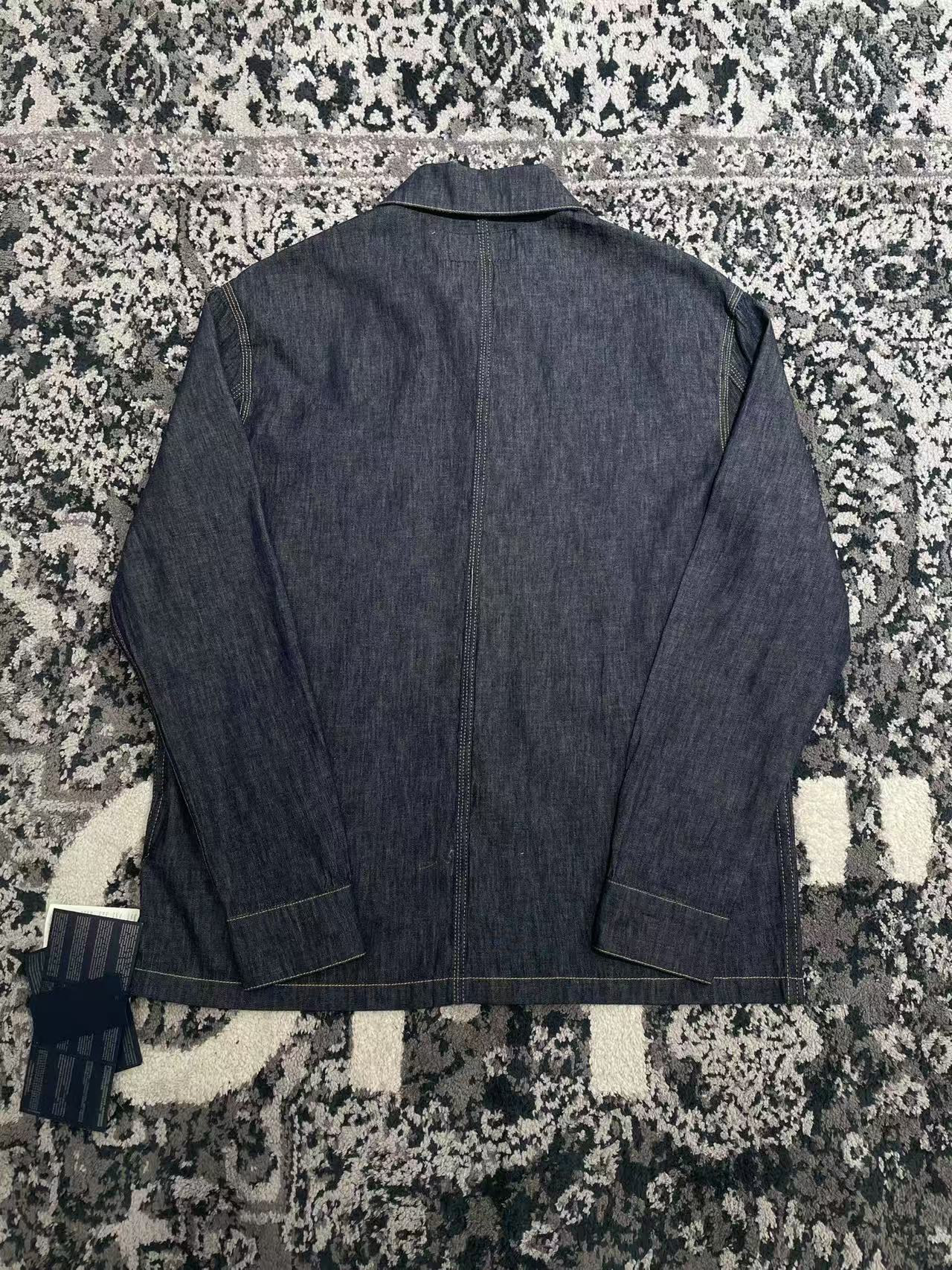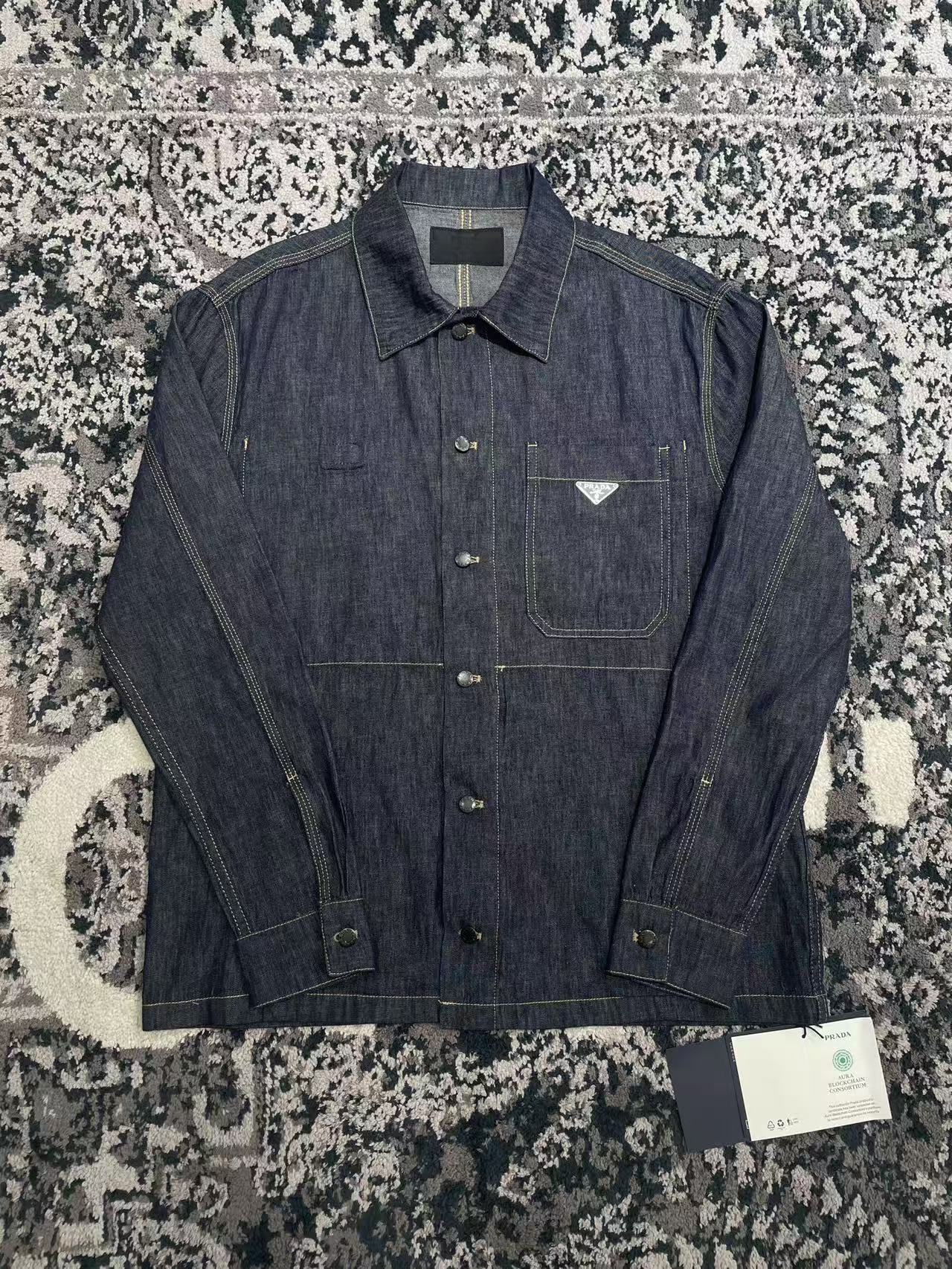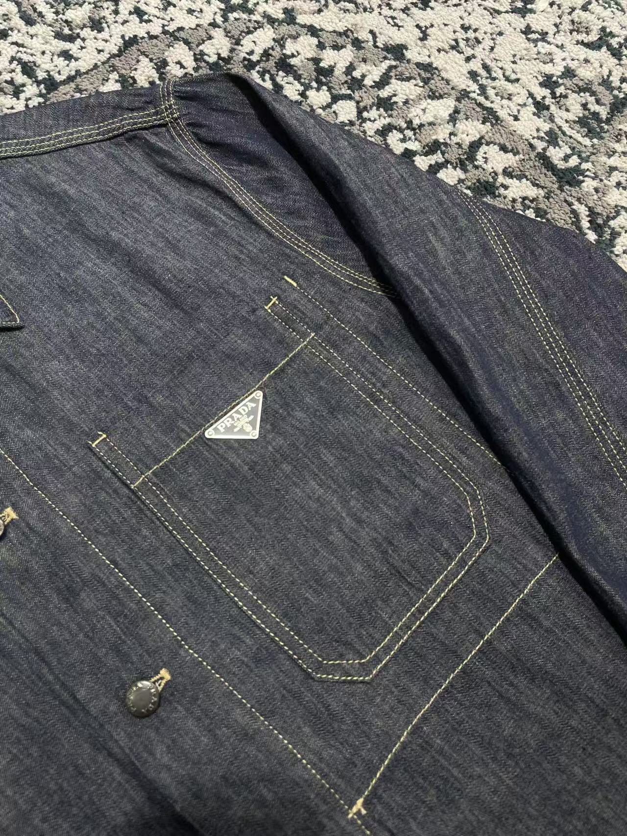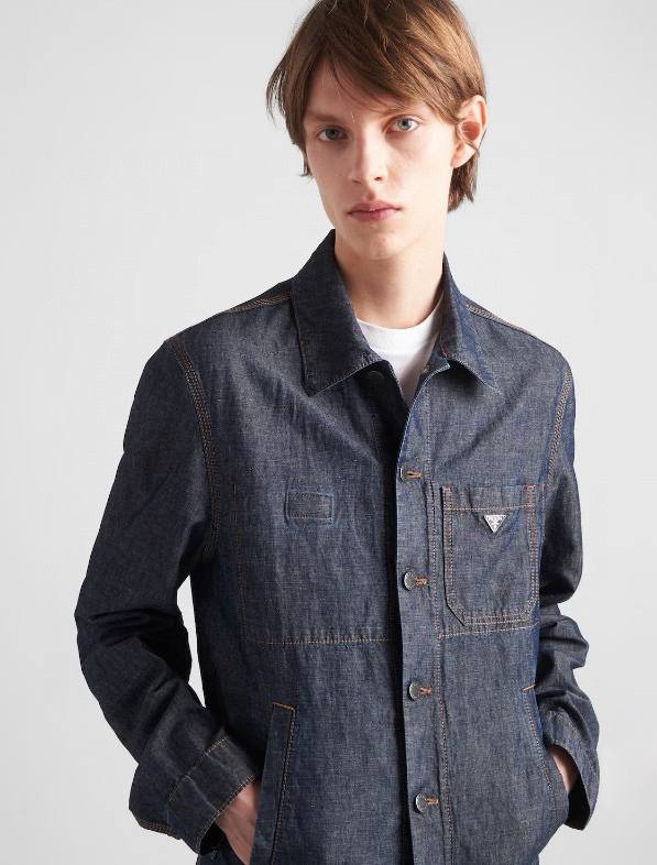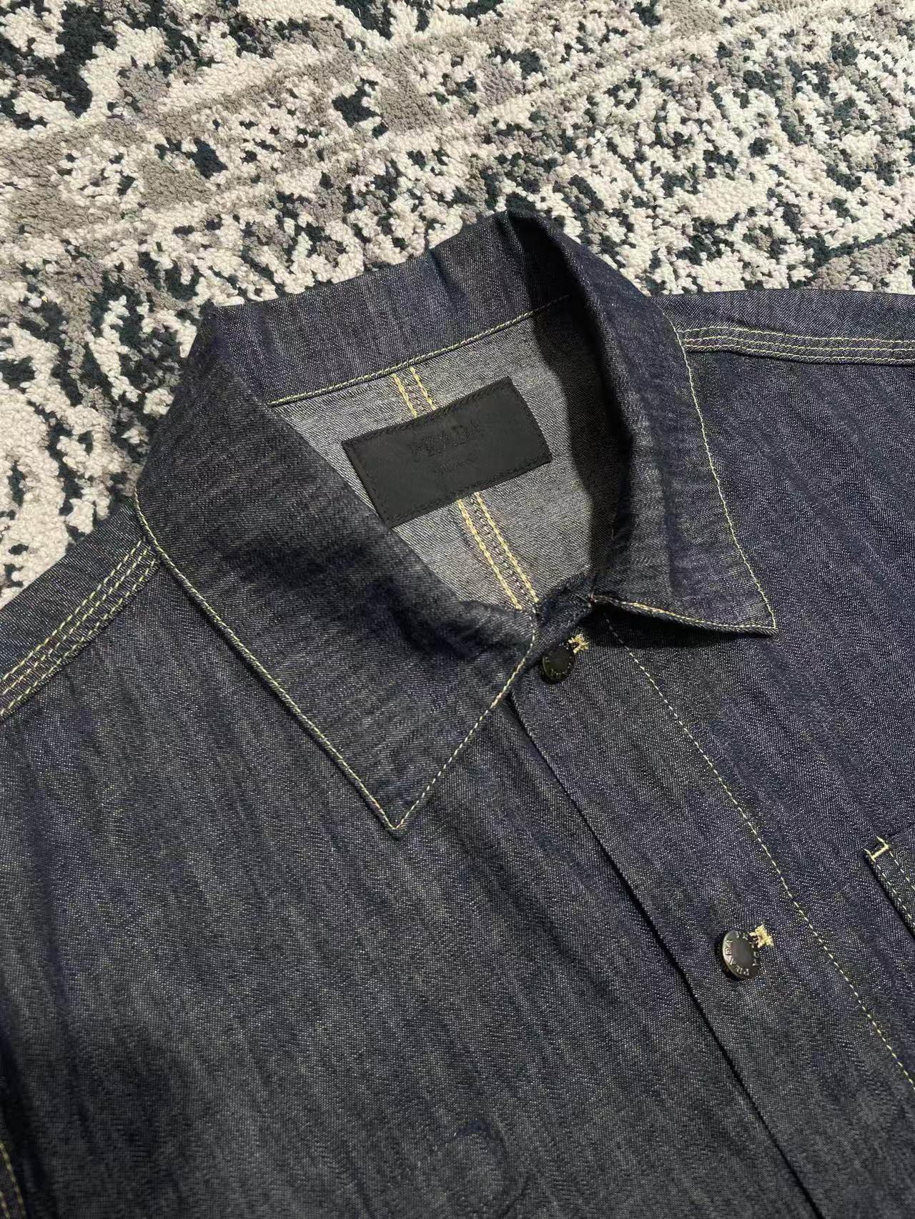 Мужская рубашка Prada выполнена из высококачественного денима глубокого синего оттенка. Модель имеет классический прямой крой с отложным воротником и застежкой на пуговицы. На груди расположен накладной карман с фирменной металлической эмблемой Prada, что подчёркивает узнаваемый стиль бренда.