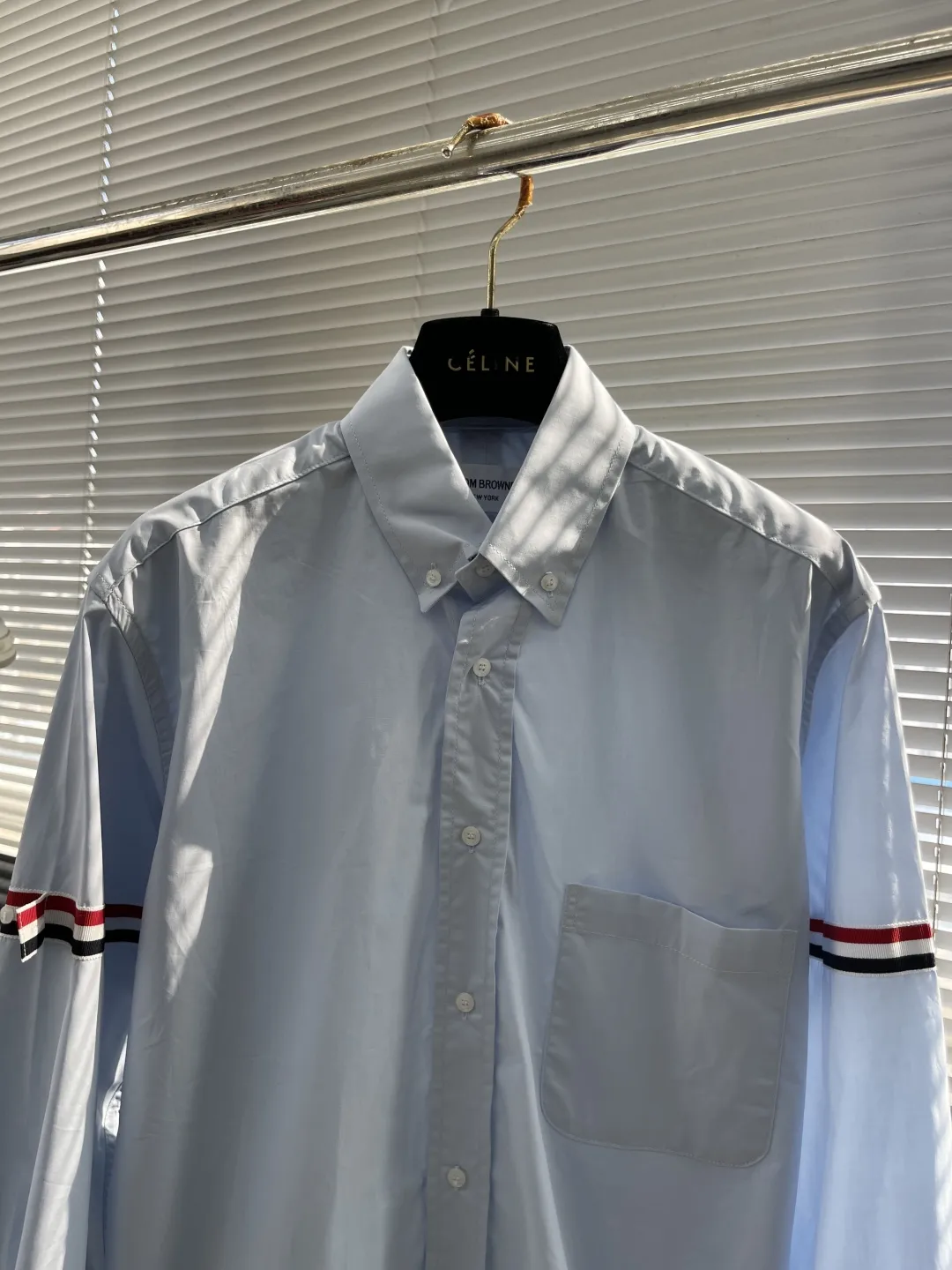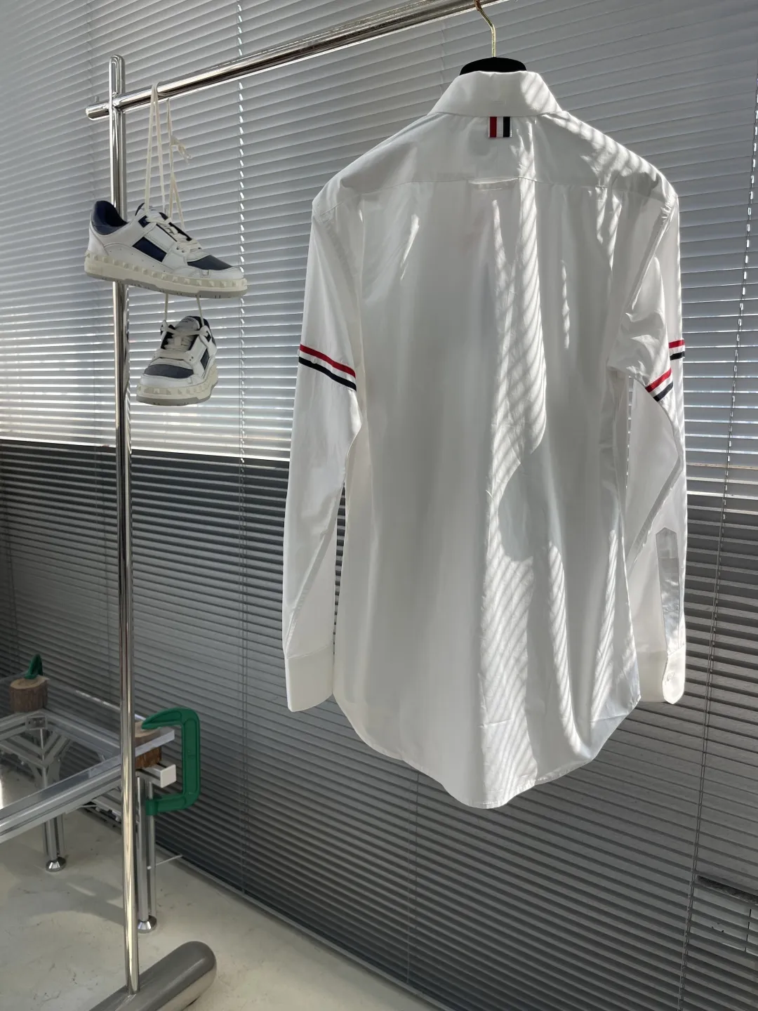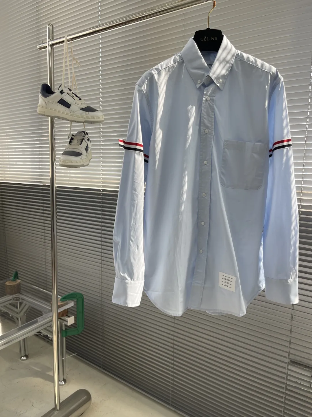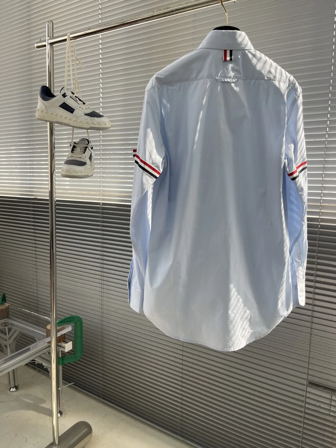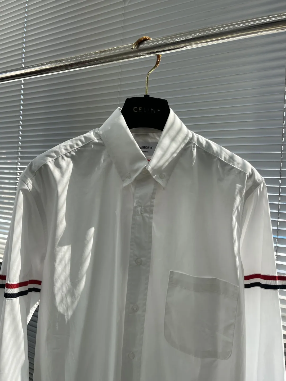 Модель дополнена нагрудным карманом и фирменной биркой Thom Browne у нижнего края. Рубашка легко сочетается с джинсами, брюками и деловыми костюмами.