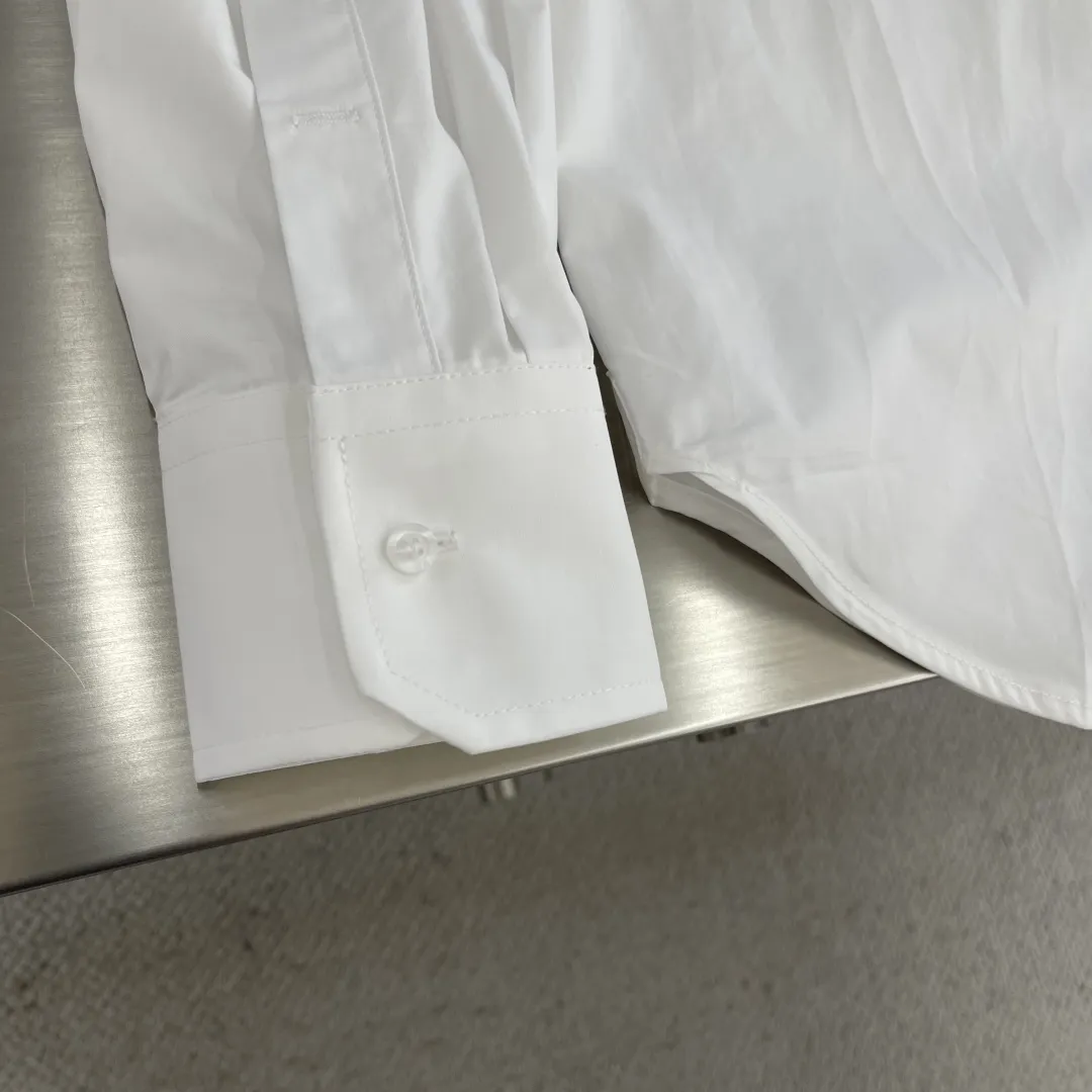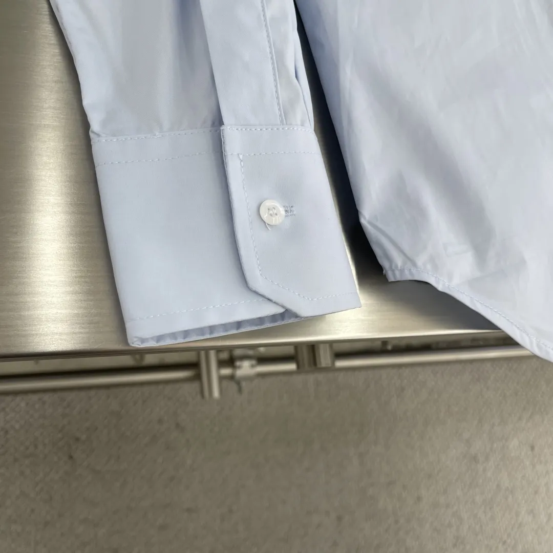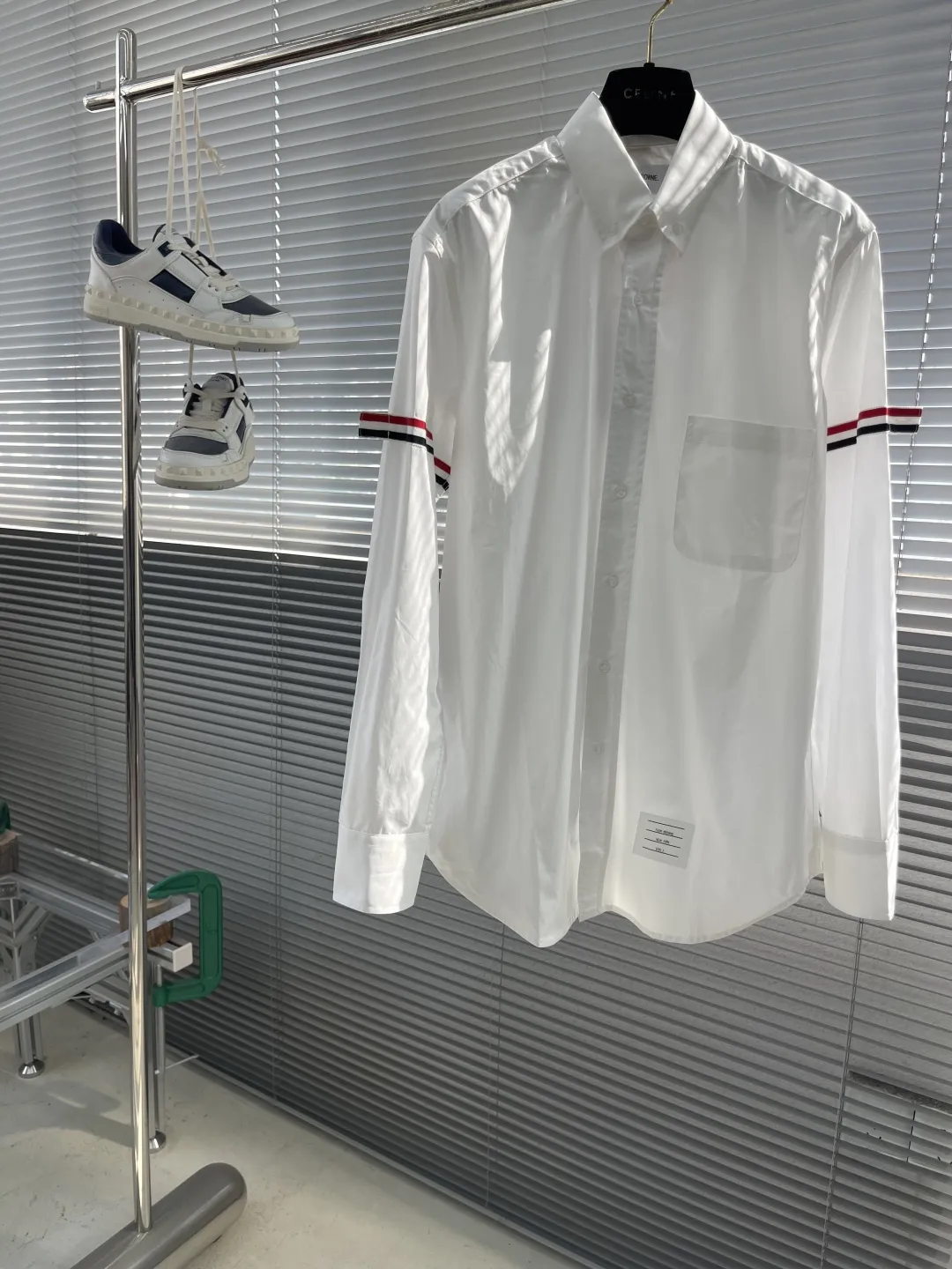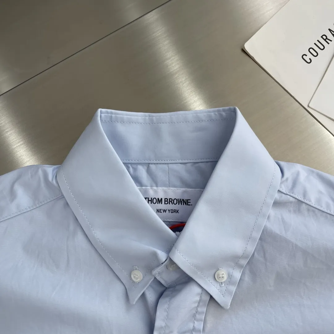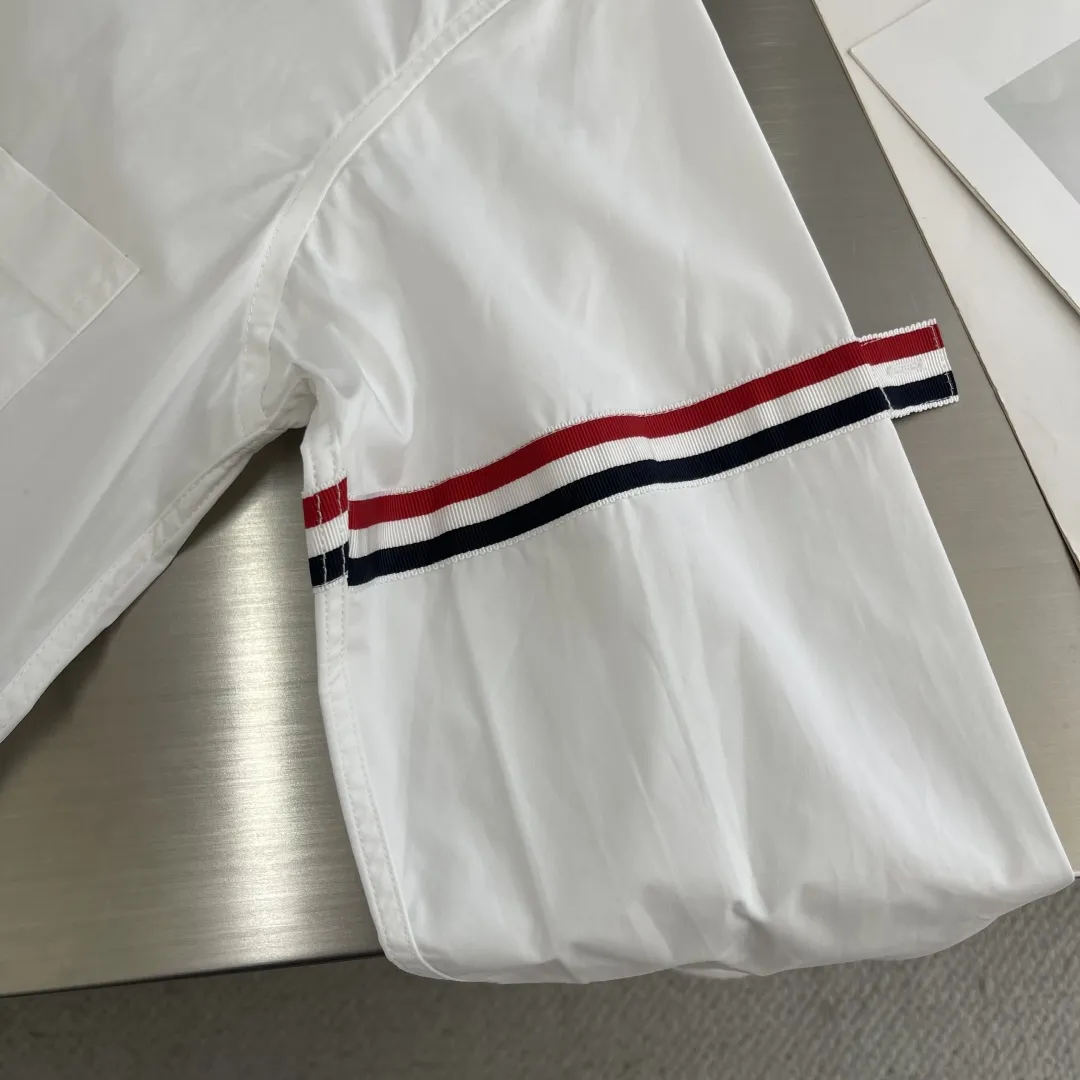 Модель дополнена нагрудным карманом и фирменной биркой Thom Browne у нижнего края. Рубашка легко сочетается с джинсами, брюками и деловыми костюмами.