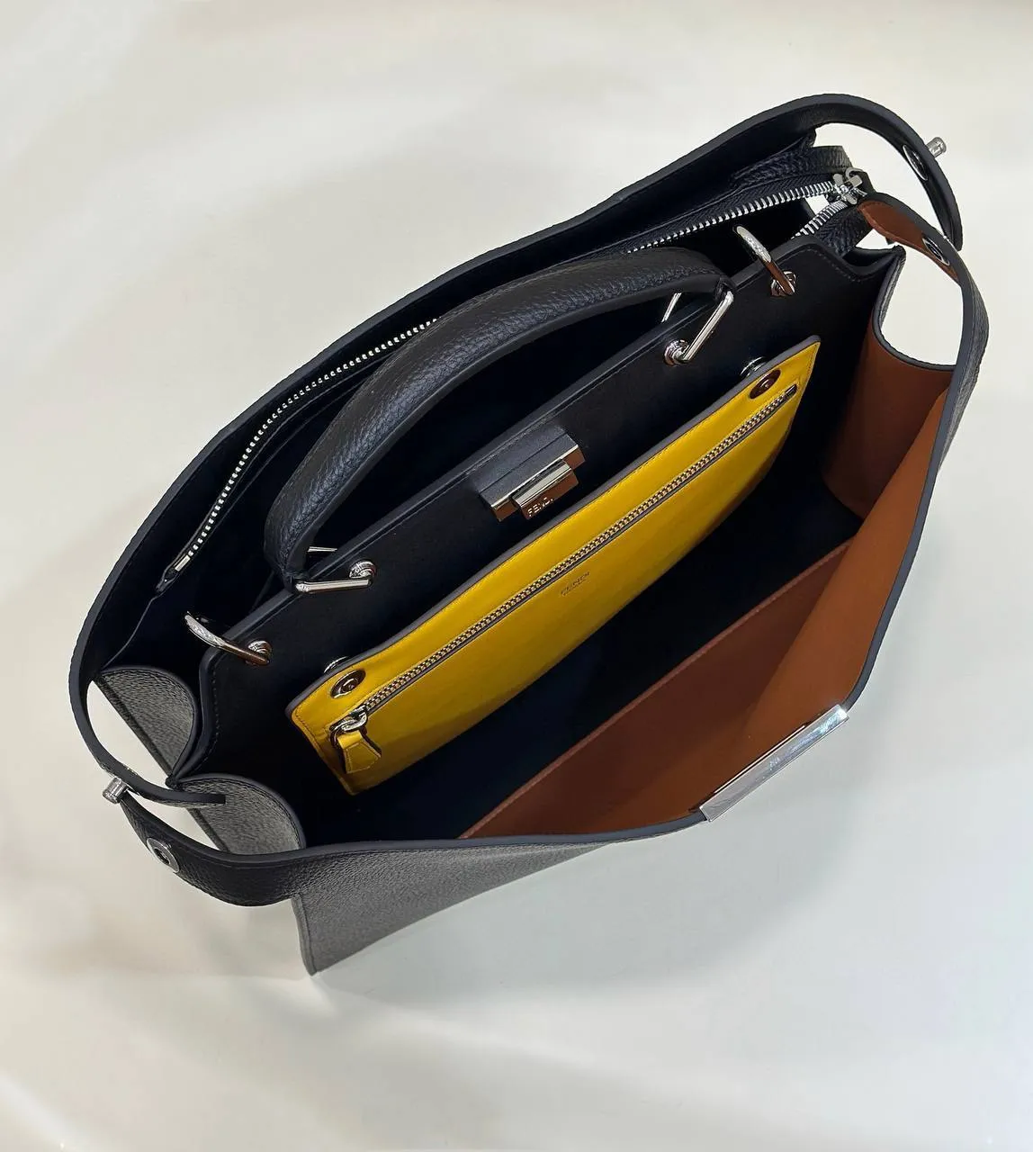 Ее внутренняя часть оснащена двумя жесткими разделителями, что позволяет удобно организовать вещи. Фирменный поворотный замок спереди и застежка-молния сзади обеспечивают надежность и безопасность ваших вещей. Сумка также включает съемный внутренний карман: одна сторона выполнена из яркой желтой кожи, а другая — из ткани с узнаваемым узором FF.