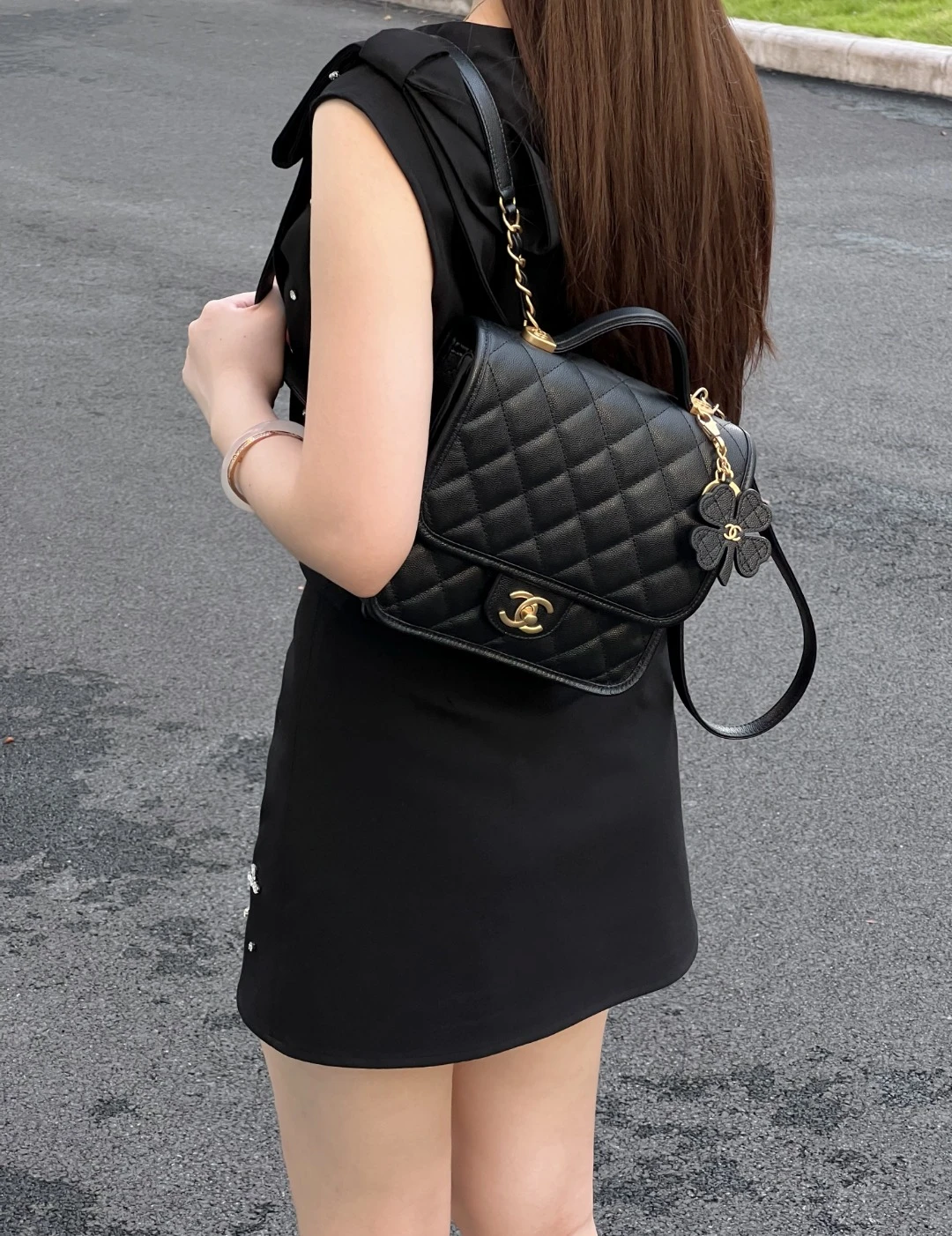 Погрузитесь в атмосферу французского шика с культовым женским рюкзаком CHANEL 25B. Эта элегантная модель выполнена из премиальной зернистой кожи телёнка, отличается плотной текстурой и повышенной износостойкостью. Классический черный цвет гармонирует с золотистой фурнитурой, включая фирменную застёжку с логотипом CHANEL и изысканный брелок-аксессуар.