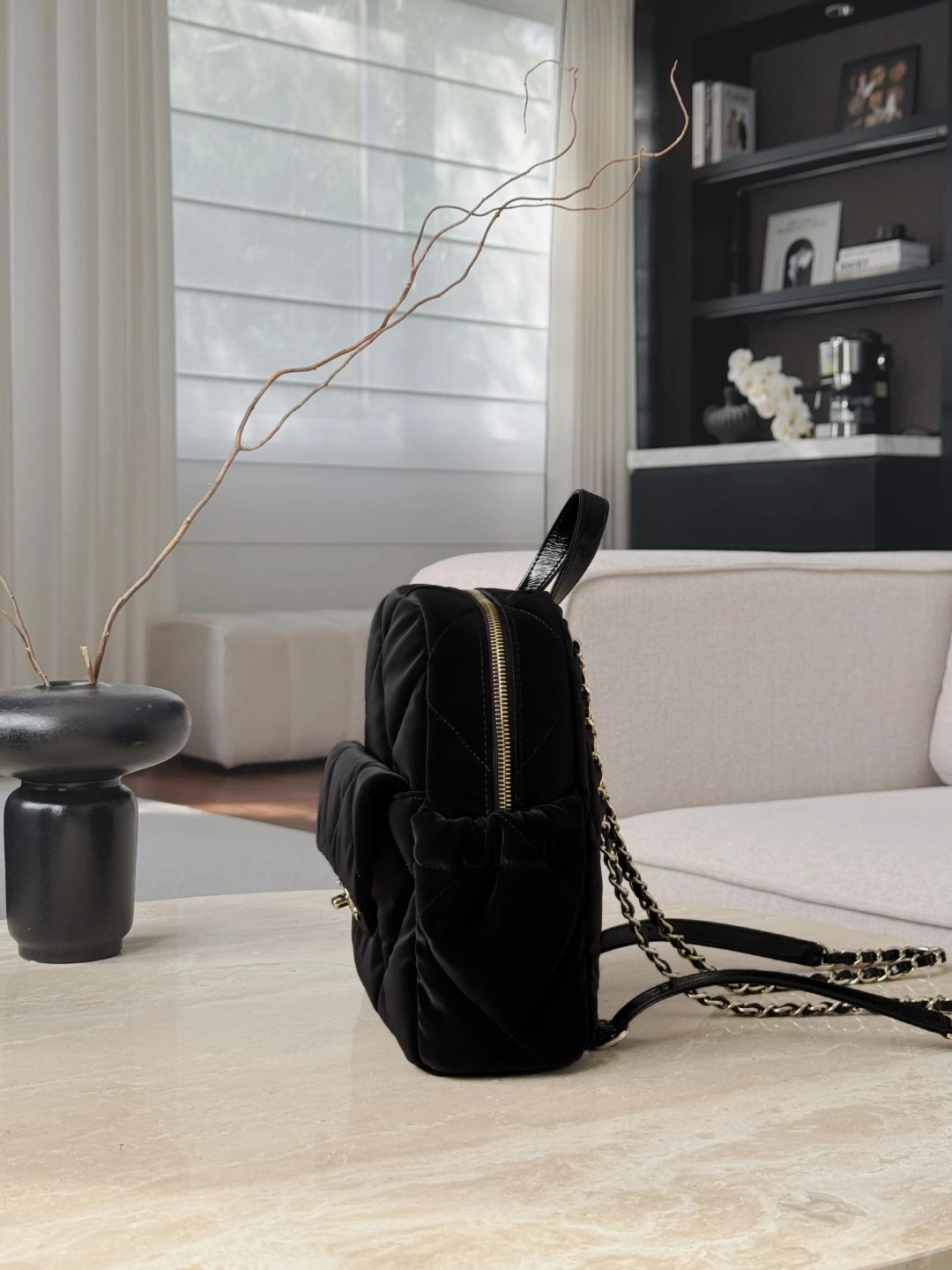 Элегантный компактный рюкзак CHANEL 25N в чёрном велюре с узнаваемым стеганым ромбиком и логотипом CC на фронтальной застёжке. Идеальная городская модель для тех, кто ценит сочетание комфорта и классического шику.
