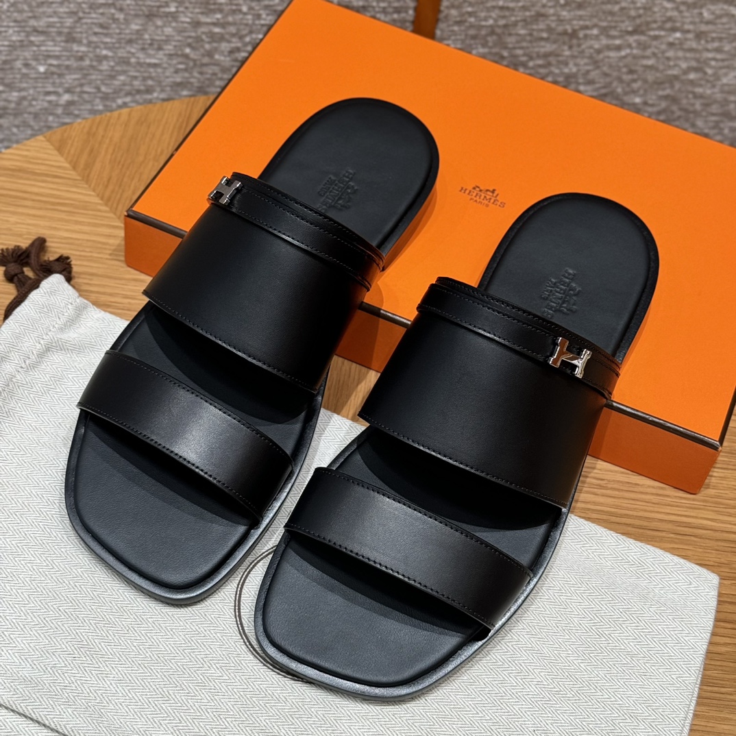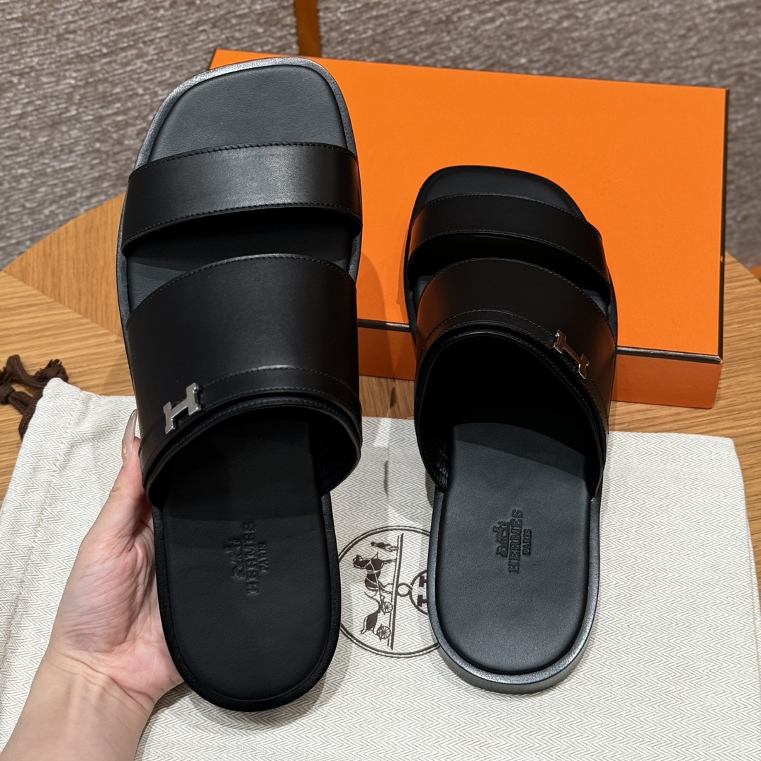 Элегантные мужские сандалии Joao от Hermès — эталон современной роскоши и минималистичного дизайна. Модель выполнена из высококачественной натуральной кожи глубокого черного цвета. Две широкие кожаные перемычки надежно фиксируют стопу и обеспечивают комфорт при ходьбе. Особый акцент — фирменная металлическая пряжка с символичной буквой "H", подчеркивающая престиж бренда. Эргономичная кожаная стелька и прочная подошва гарантируют удобство даже при длительном ношении.