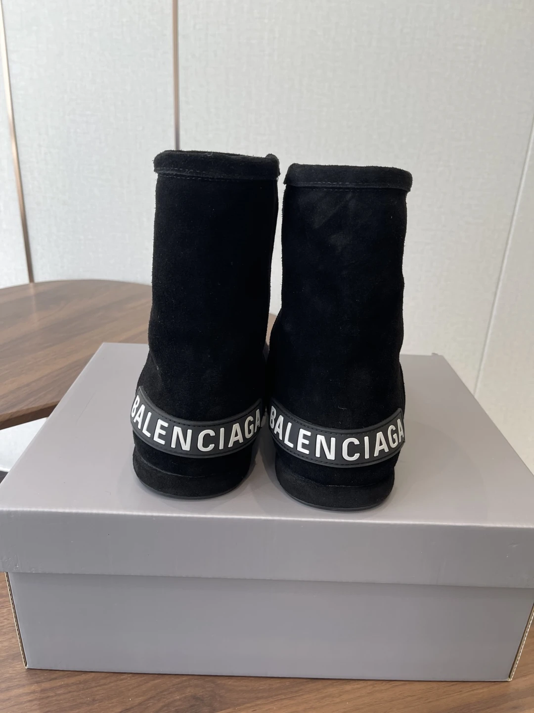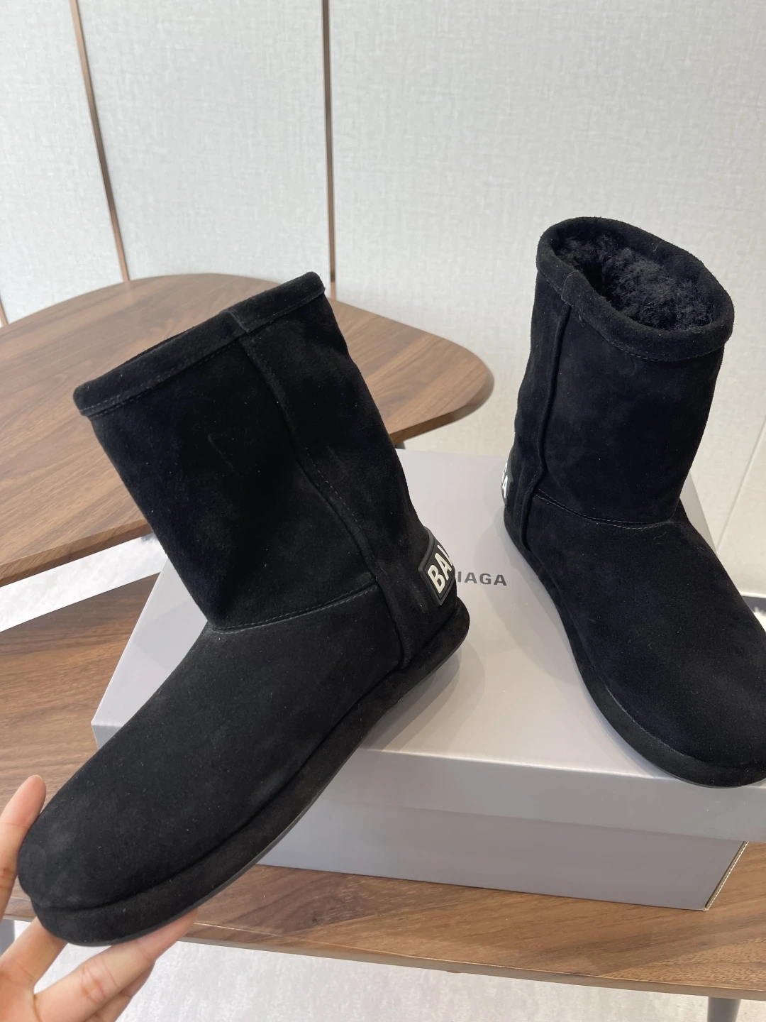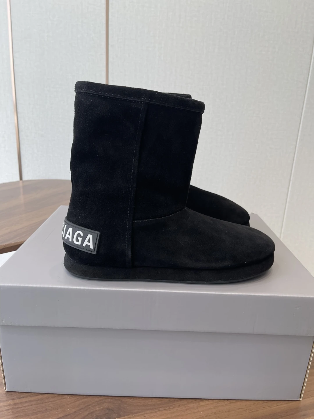 Классические женские угги в лаконичном минималистичном исполнении, представленные в глубокого черного цвета. Модель сочетает комфорт традиционных угг и премиальную эстетику Balenciaga: аккуратный замшевый внешний материал, густая меховая подкладка и фирменная нашивка сзади. Отличный вариант для холодного сезона — тепло и стильно.
