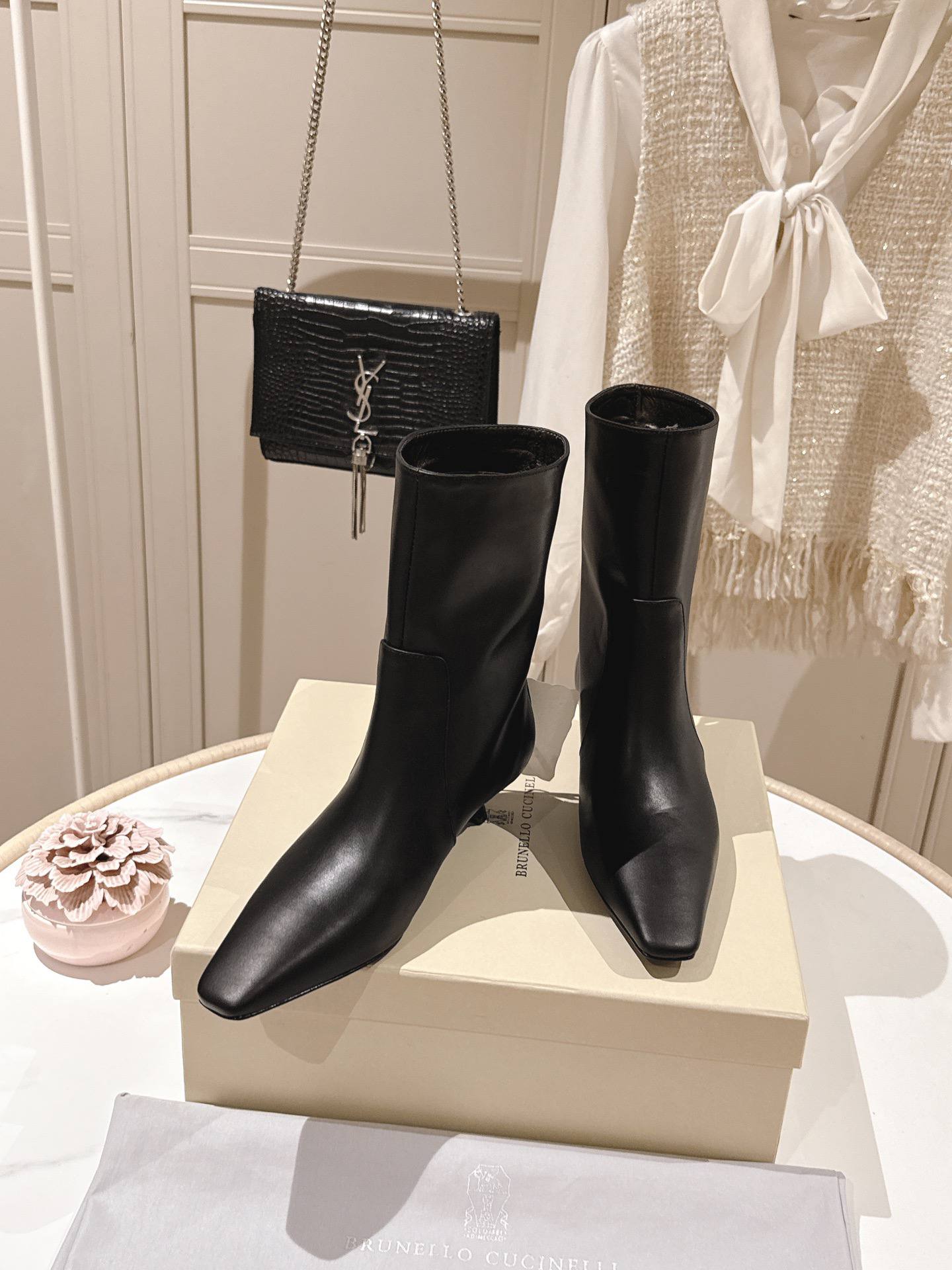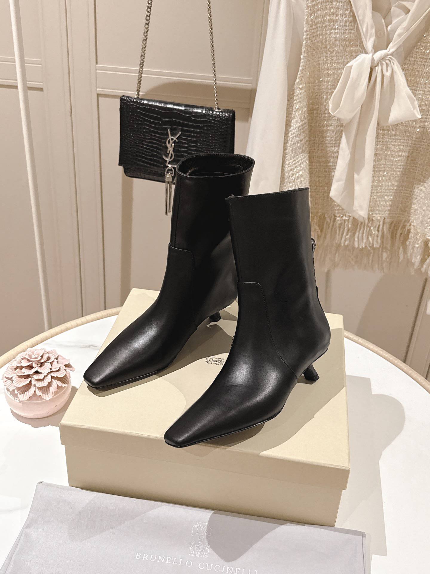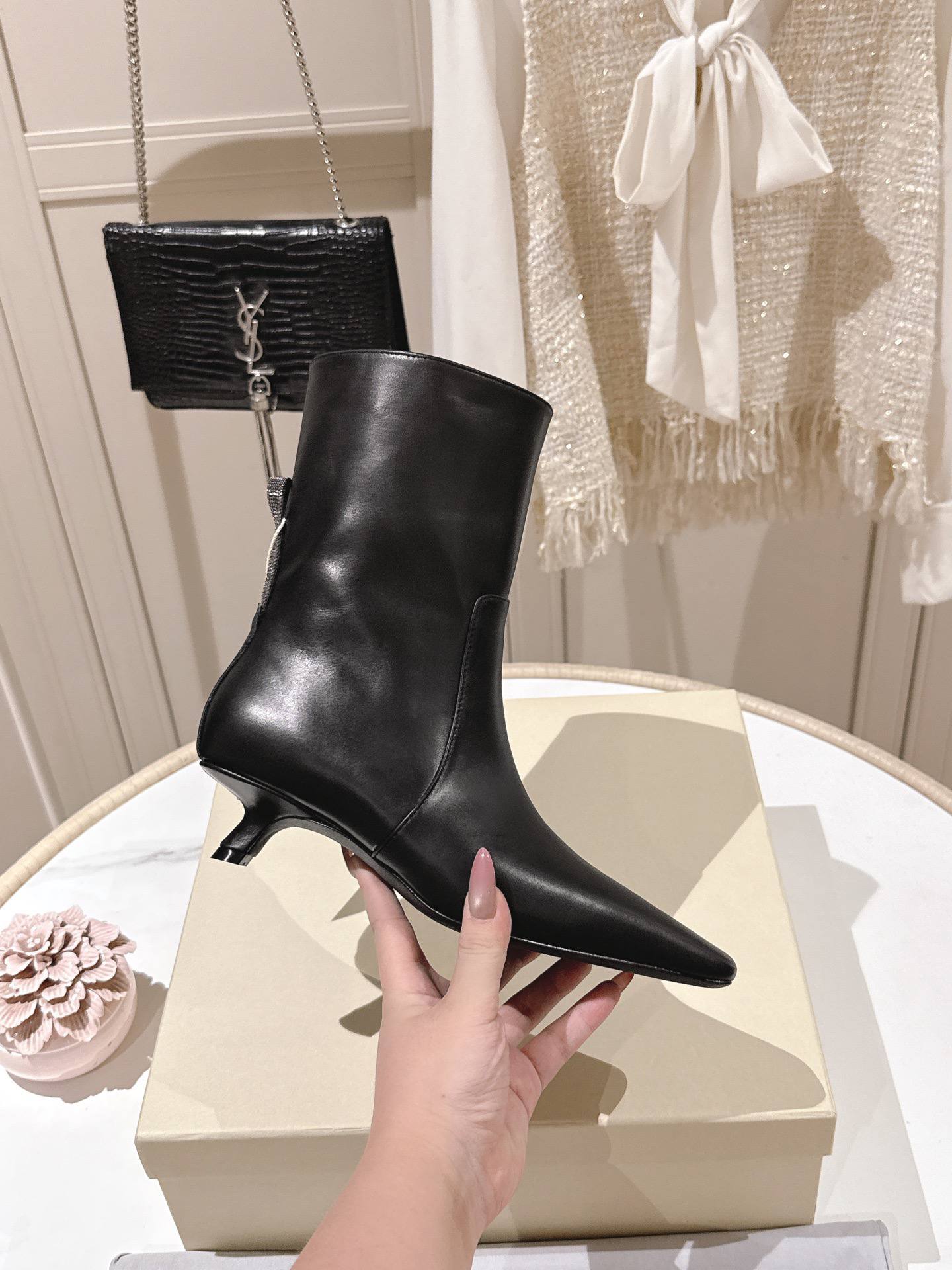 Ботильоны выполнены из гладкой чёрной кожи с деликатным лёгким блеском. Стройный силуэт подчёркивает ногу: аккуратно облегающий голеностоп и чётко выраженный заострённый носок создают сдержанно-лаконичный, но запоминающийся профиль. Низкий «kitten» каблук придаёт модели женственность и обеспечивает комфорт при длительной ходьбе. Дизайн минималистичен — ровные швы, лаконичные линии и продуманная посадка делают ботильоны универсальными и легко сочетаемыми с разными стилями.