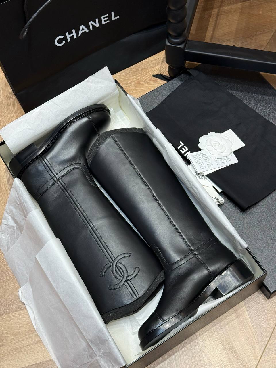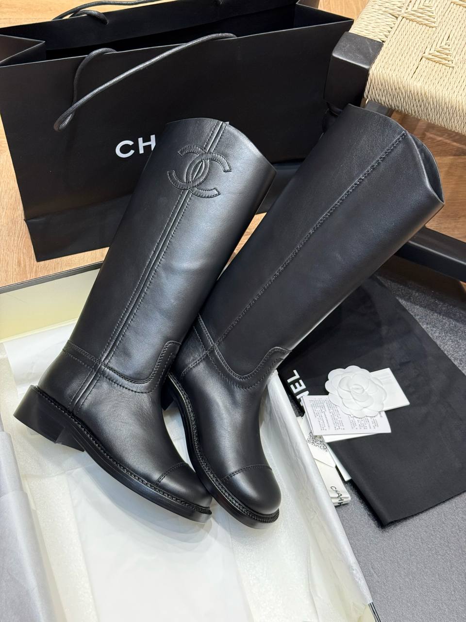 Элегантные сапоги от Chanel выполнены из высококачественной черной кожи и украшены фирменной строчкой и культовой вышивкой логотипа бренда в верхней части голенища. Модель отличается лаконичным дизайном, округлым носком и устойчивым невысоким каблуком, что обеспечивает комфорт при ежедневной носке. Минималистичный силуэт подчеркивает изысканность бренда и легко сочетается как с классическими, так и с повседневными образами. Превосходный выбор для стильных и уверенных в себе женщин, ценящих утонченную роскошь и безупречное качество Chanel.
