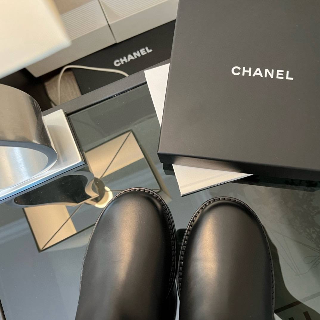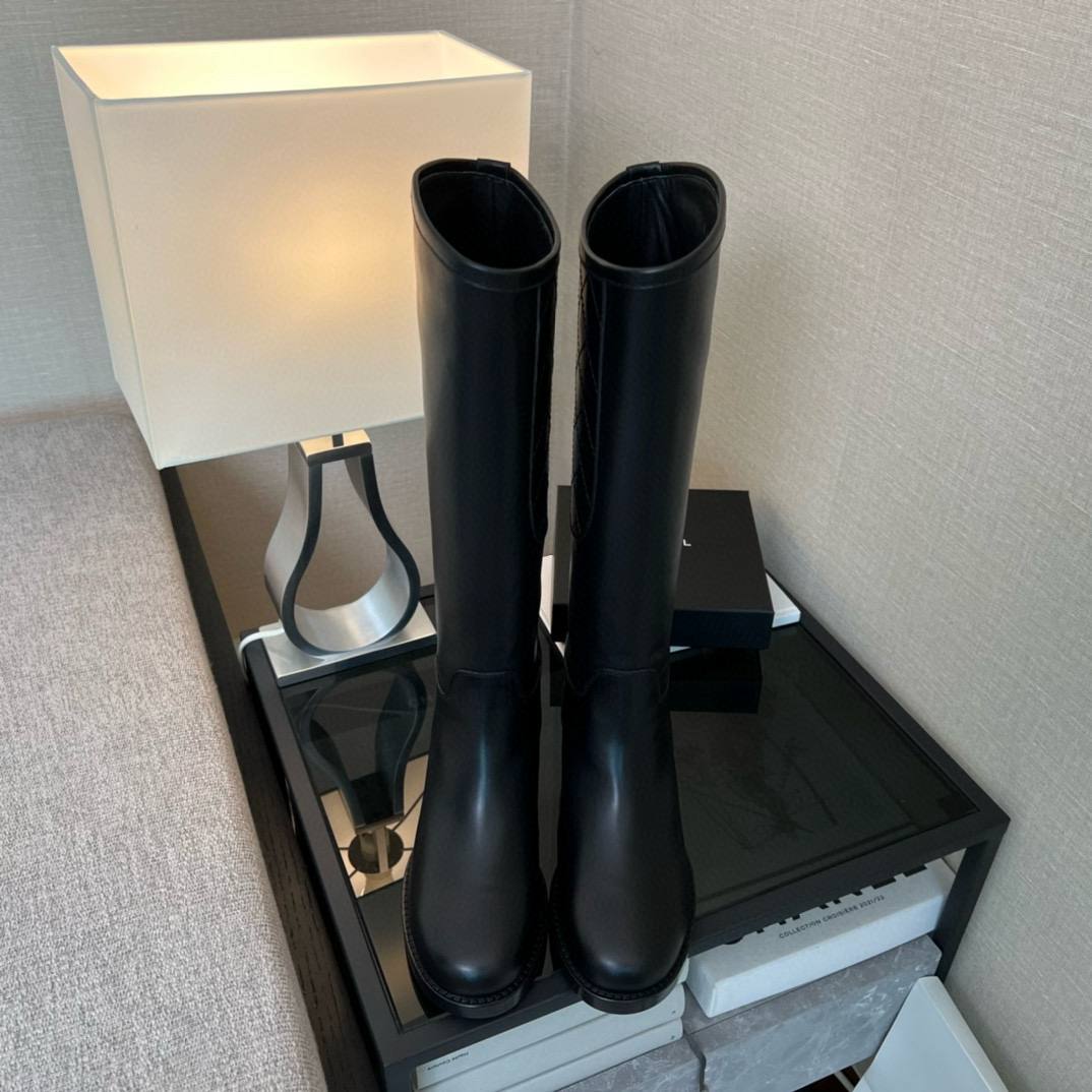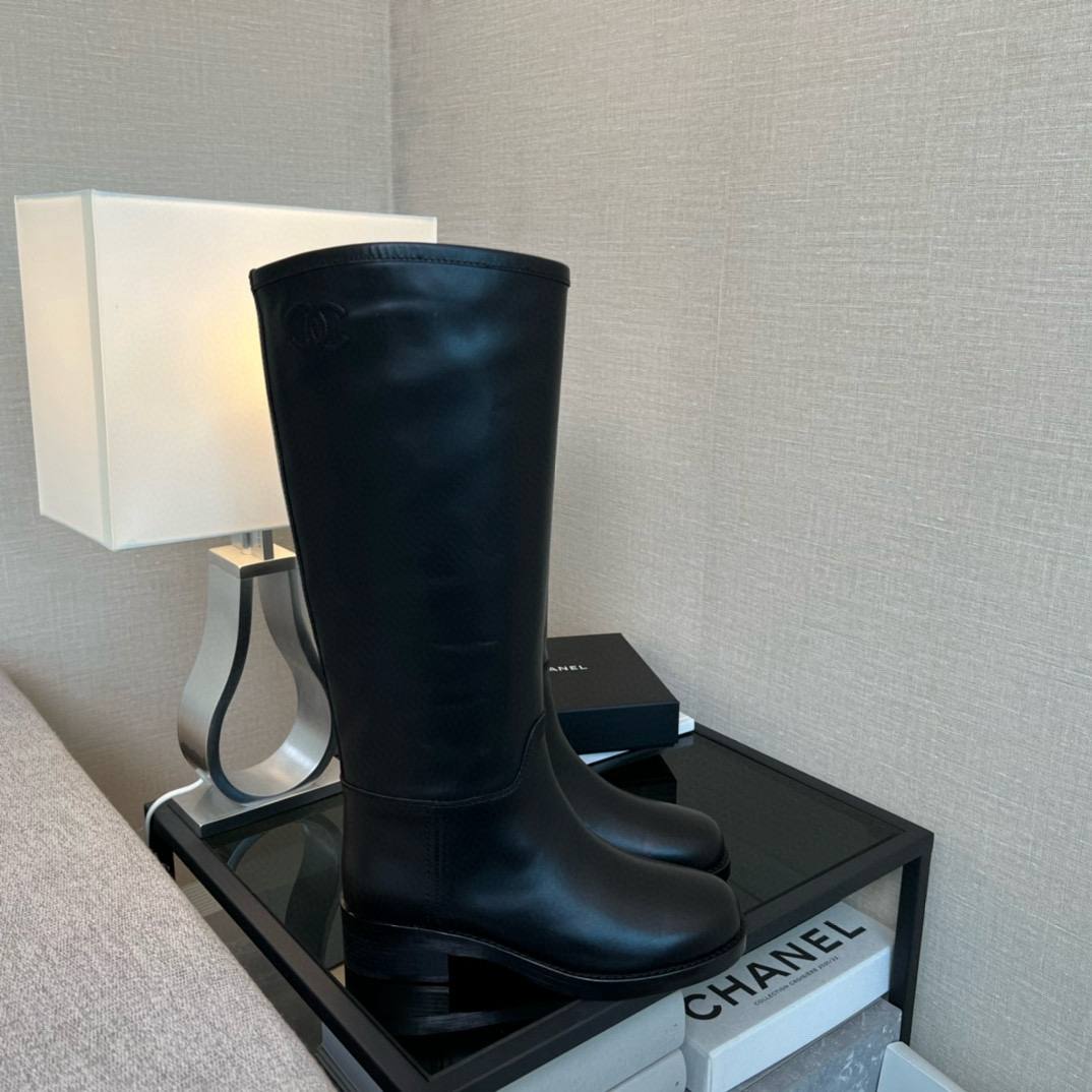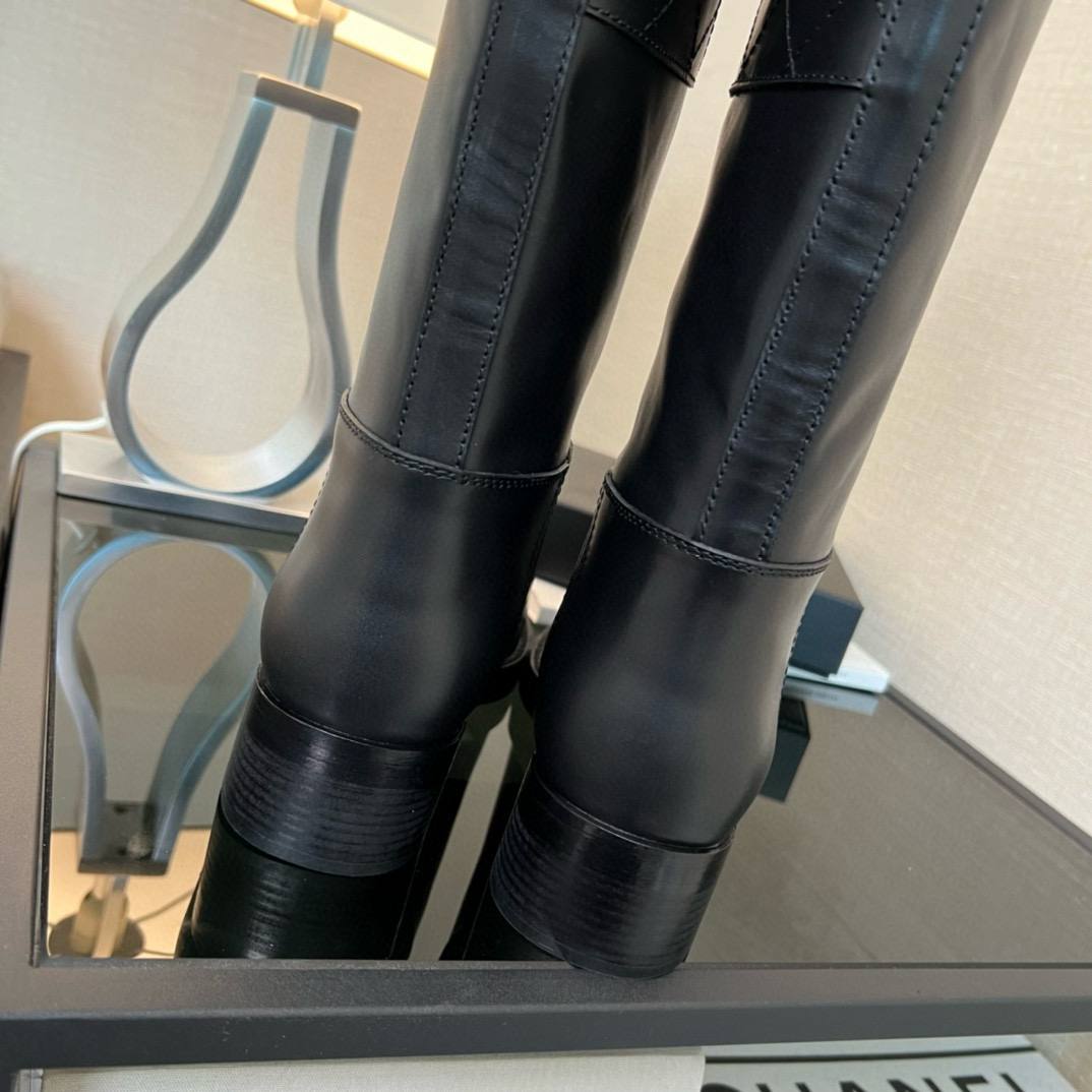Длина сапог достигает середины икры или чуть выше, что позволяет создавать классические и современные образы. Минималистичный дизайн дополнен фирменным логотипом CHANEL, рельефно выполненным в верхней части голенища, что подчеркивает принадлежность обуви к культовому бренду. Небольшой устойчивый каблук обеспечивает комфорт на протяжении всего дня, а округлый носок придаёт моделям особую элегантность и универсальность. Внутренняя отделка изготовлена из высококачественных материалов, что обеспечивает максимальный комфорт при носке и долговечность. Сапоги идеально дополнят как повседневный, так и более официальный гардероб, станут превосходной базой для создания стильных осенне-зимних образов.