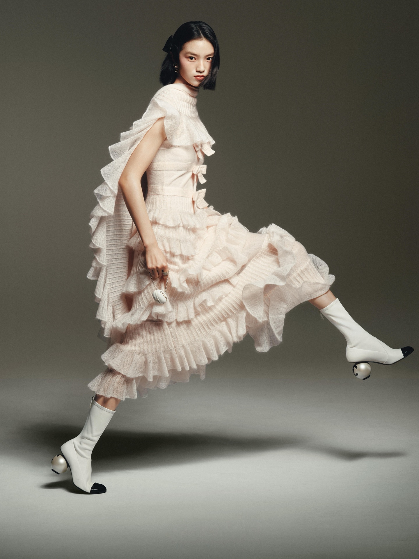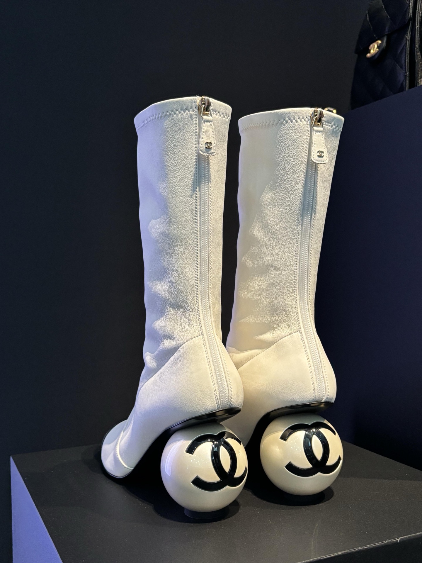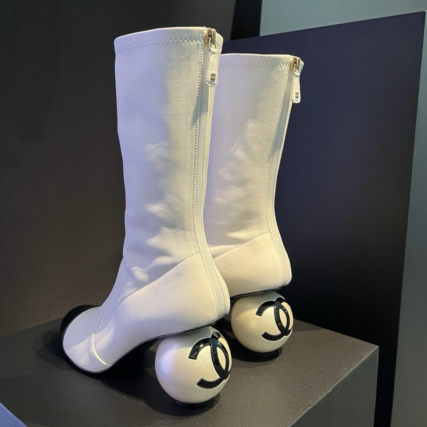 Сапоги изготовлены из премиальной эластичной кожи с добавлением эластана — мягкой, растяжимой и облегающей, обеспечивающей идеальную посадку без дискомфорта. Верх белого цвета гладкий, матовый, с лёгким блеском; сзади — золотистая молния YKK для удобного надевания, скрытая под клапаном для эстетики. Дизайн — высокие ботфорты до середины икры, с открытым носком или закрытым мыском, стройным силуэтом и чёрной платформой (высота каблука 10 см с подъемом). Иконический элемент — два белых шара с логотипом CC на чёрной резиновой подошве, символизирующие жемчужины Коко Шанель, добавляющие объём и игривость.