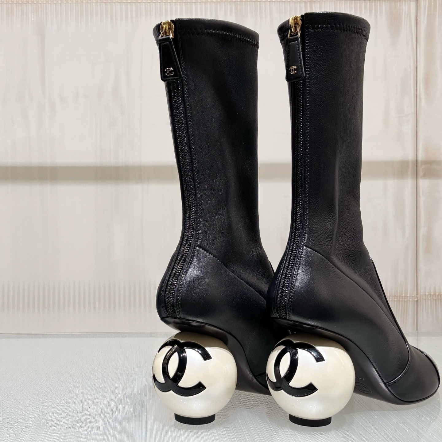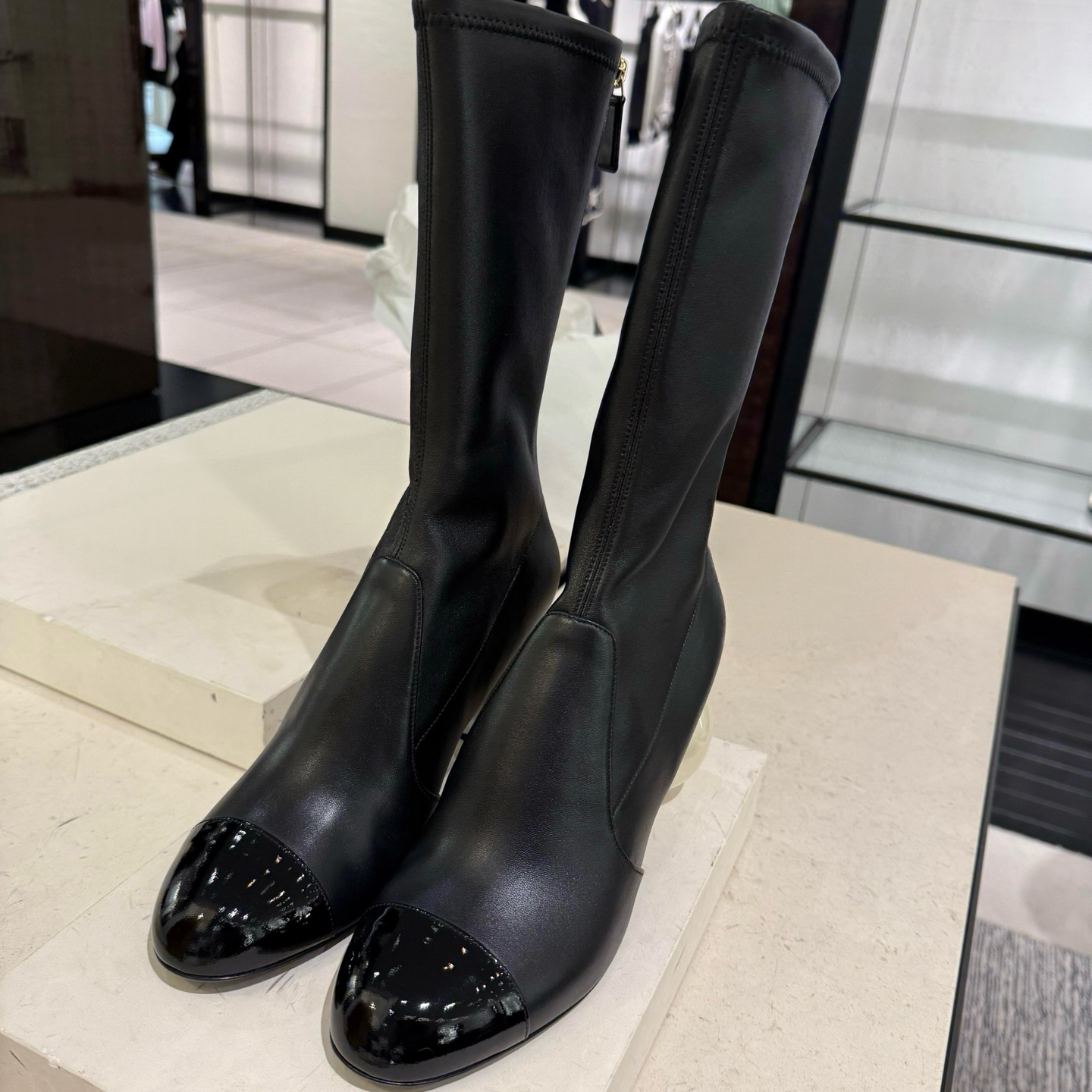 Сапоги CHANEL универсальны для осени-зимы: эластичная кожа облегает ногу, сохраняя тепло, платформа добавляет роста без усталости, жемчужные CC устойчивы к царапинам. Подходят для городских прогулок, вечеринок или офиса — сочетайте с мини-юбкой для смелости, с брюками для casual-chic или с пальто для классики; молния упрощает надевание, эластичность адаптируется к разным икрам.