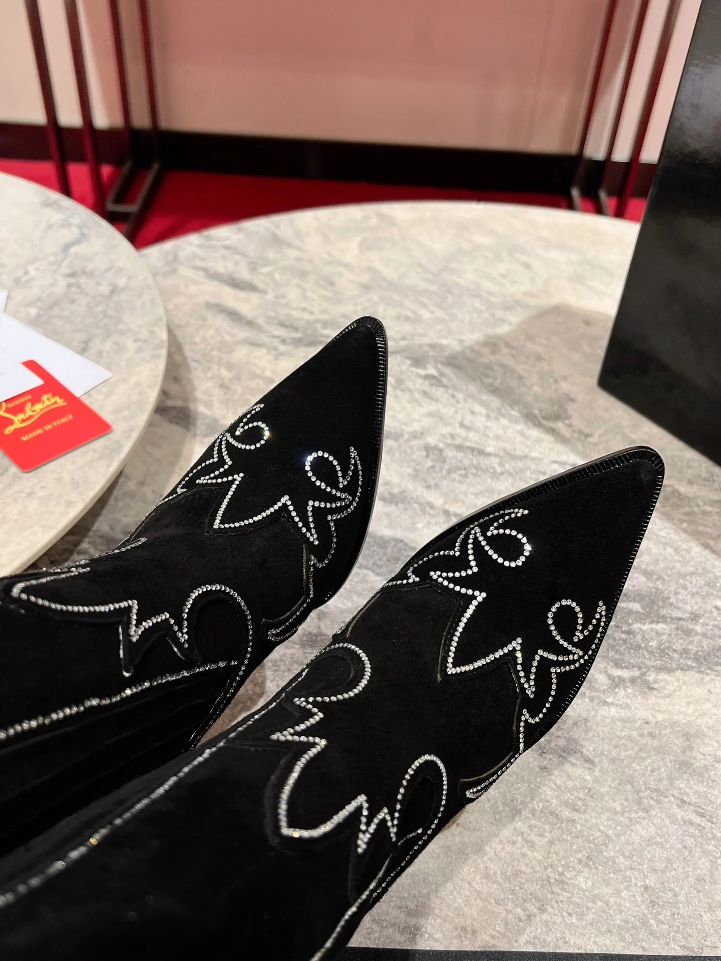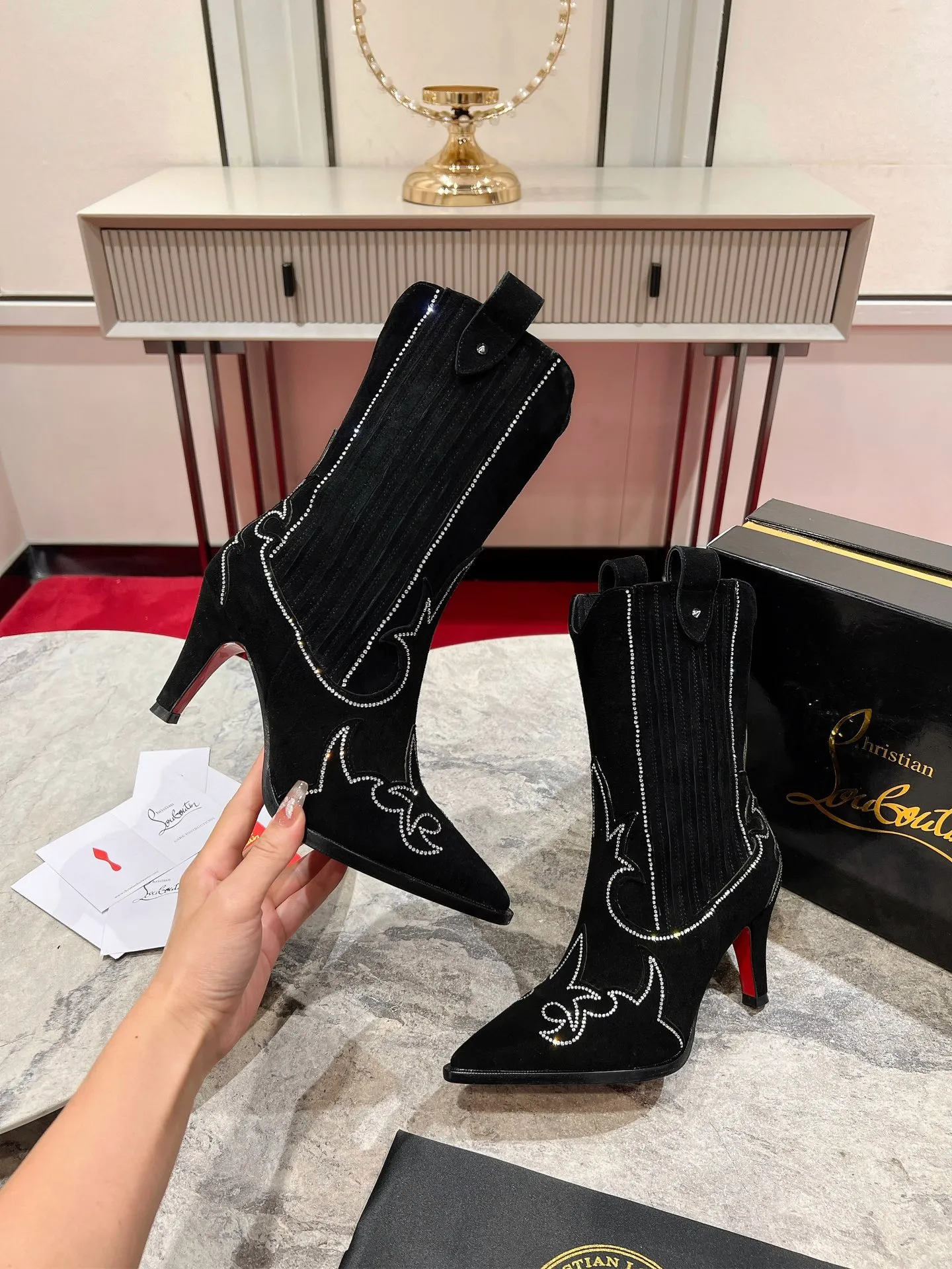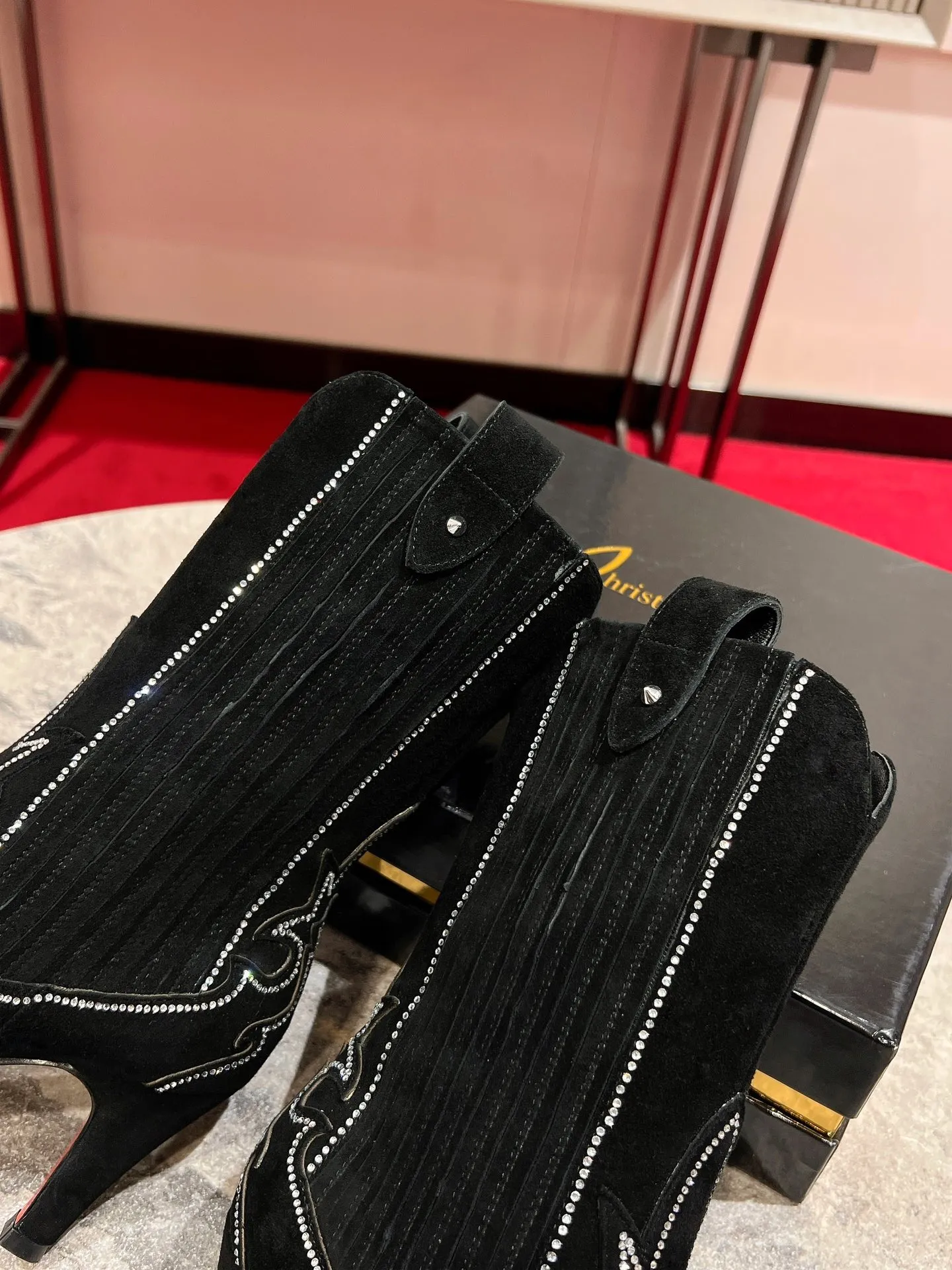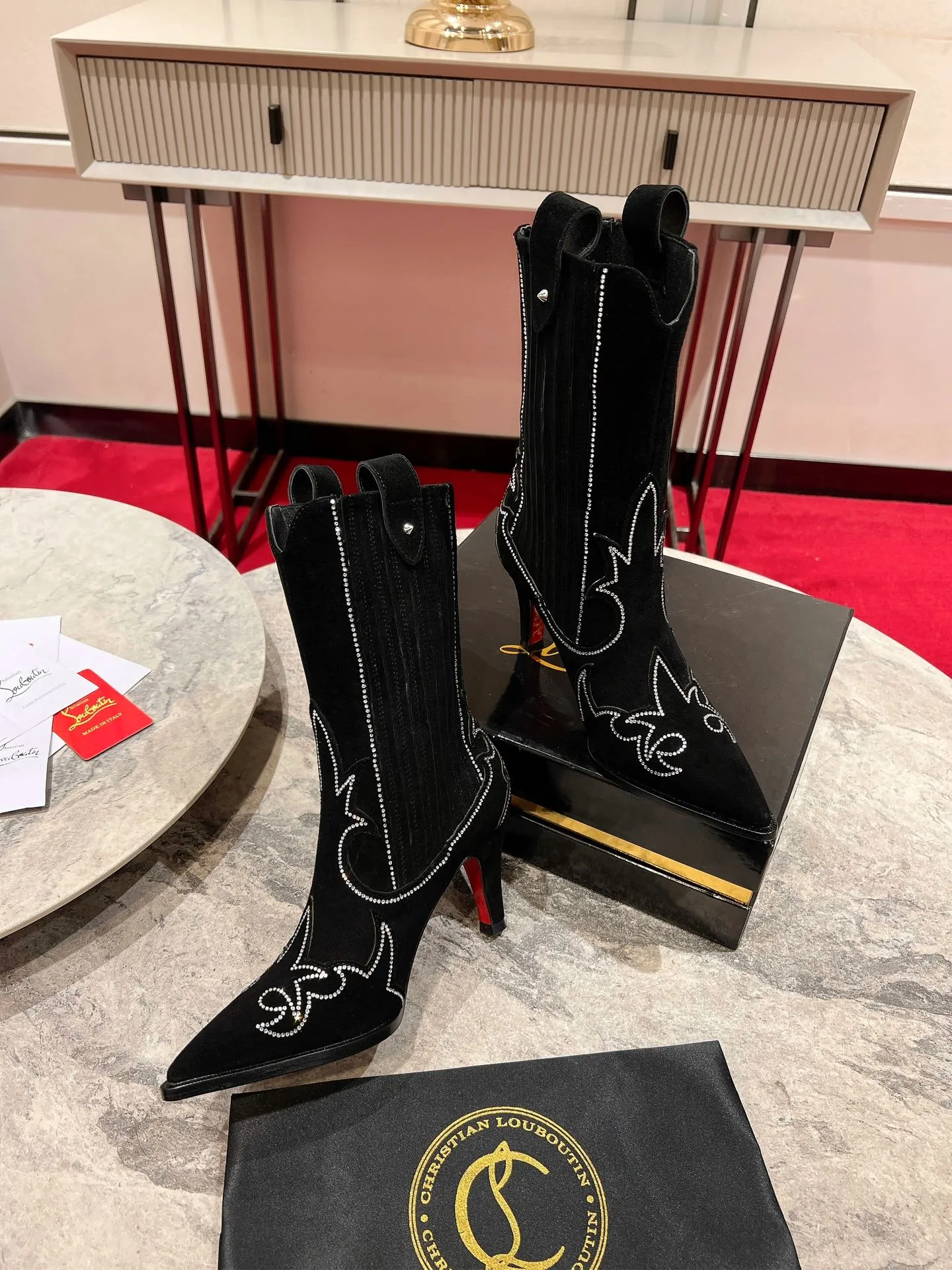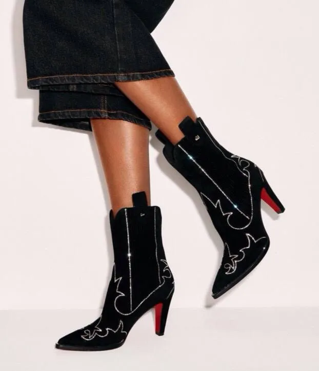 Классические сапоги воплощают инновационный дизайн, вдохновленный атмосферой Дикого Запада. Изготовленные из черной овчины, они отличаются элегантным силуэтом и удобным каблуком высотой 85 мм. Ковбойский стиль вестерна придаёт им уникальность. Каждая пара выделяется высококачественной 3D-вышивкой на верхней части и вручную вышитыми стразами, что подчеркивает их статус как предмета роскоши.