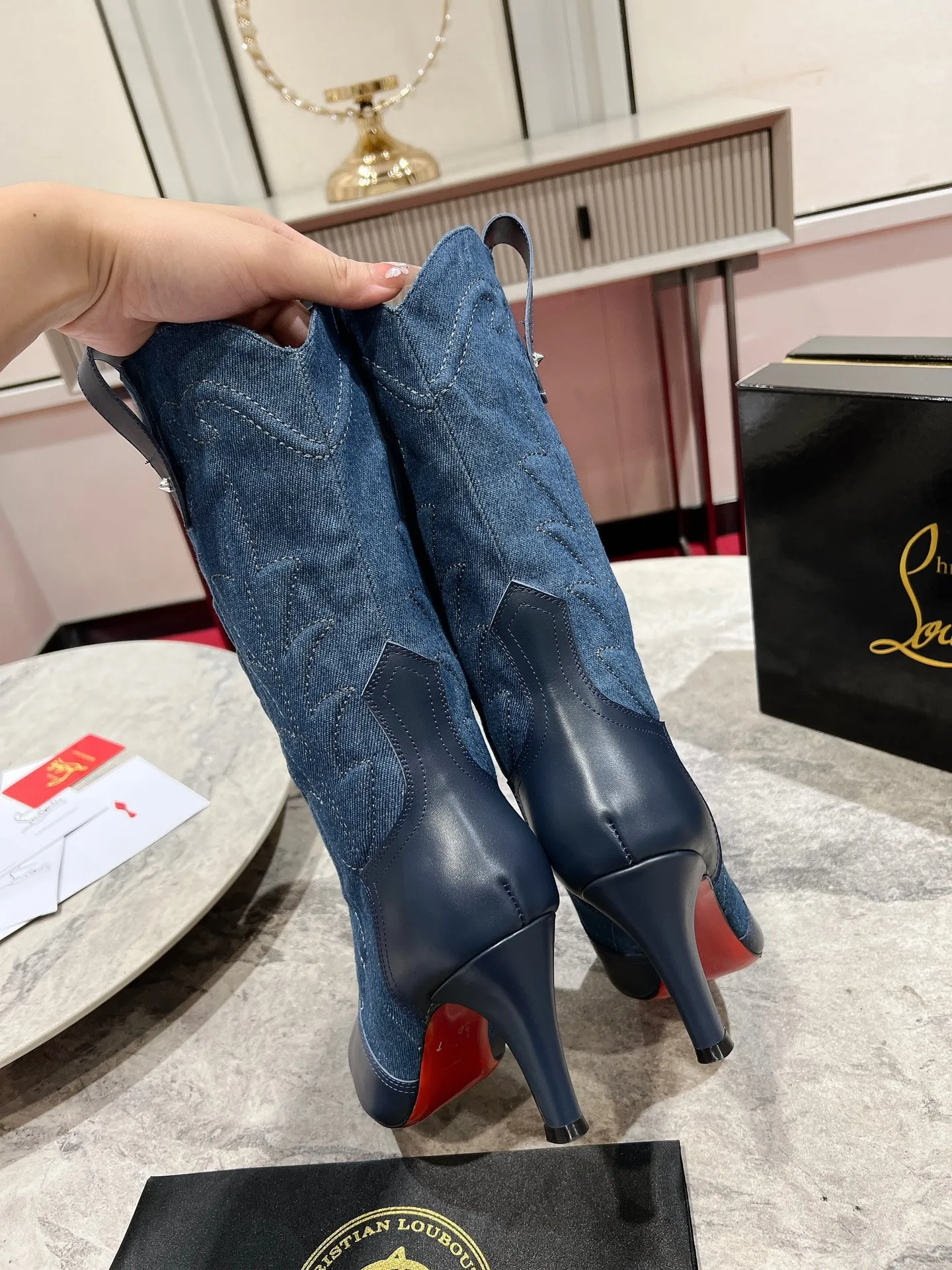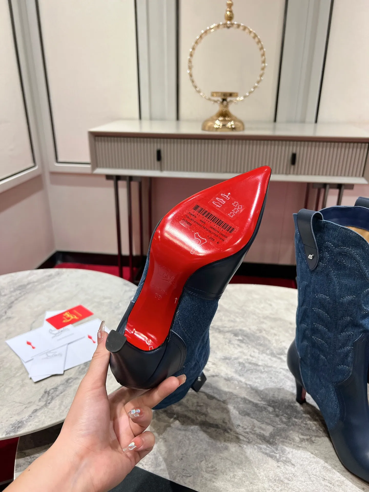Женские короткие сапоги CHRISTIAN LOUBOUTIN из джинсовой ткани — это идеальное сочетание элегантности и уникального стиля. Их рельефный фактурный рисунок органично подчеркивает изящные линии голени, добавляя образу нотку индивидуальности и яркости. Каблук высотой 8,5 см выполнен в традиционном ковбойском стиле, придавая обуви характерные черты вестерна.