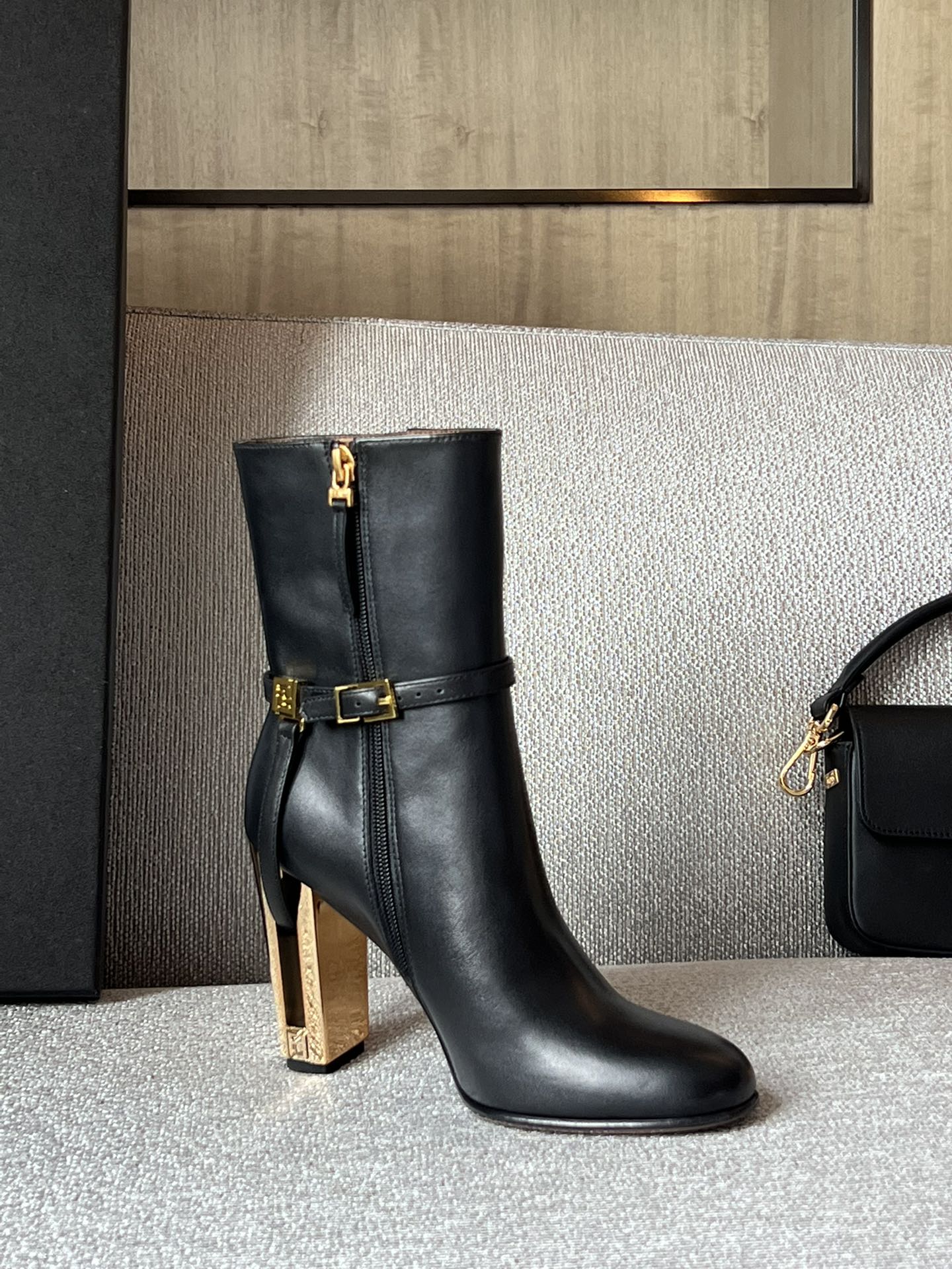 Элегантные женские ботильоны Fendi, выполненные из натуральной кожи с фирменным монограммным узором FF . Детали из натуральной кожи дополняют образ, а декоративный ремешок с золотистой фурнитурой и пряжкой с логотипом придают особый шарм. Особое внимание привлекает устойчивый каблук необычной геометрической формы с металлическим покрытием и гравировкой бренда, подчеркивающей роскошь модели.