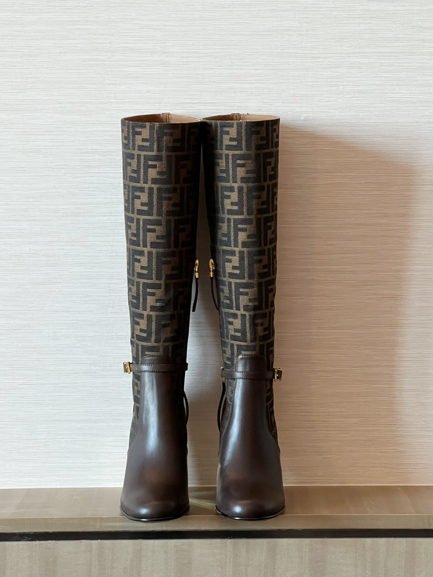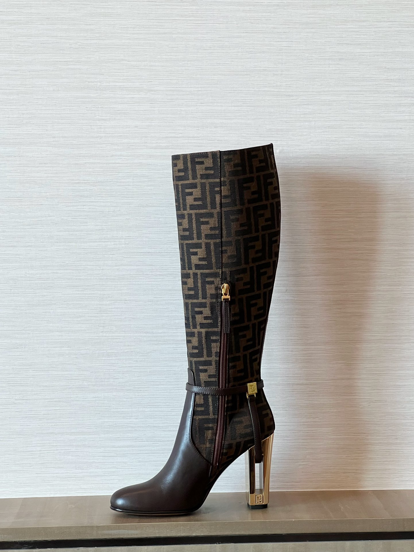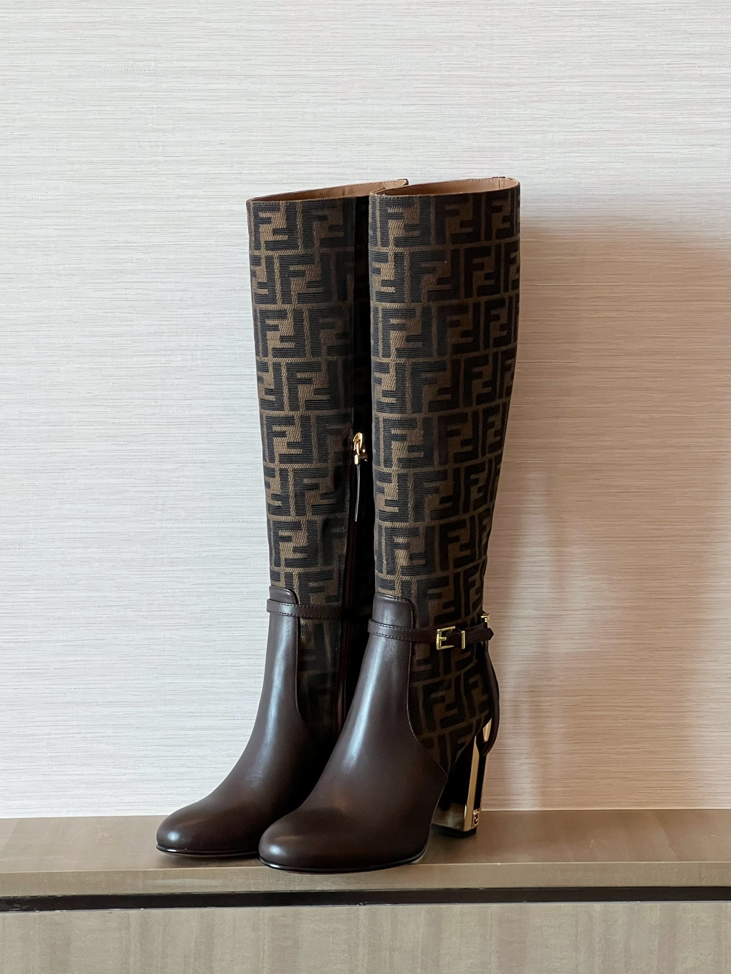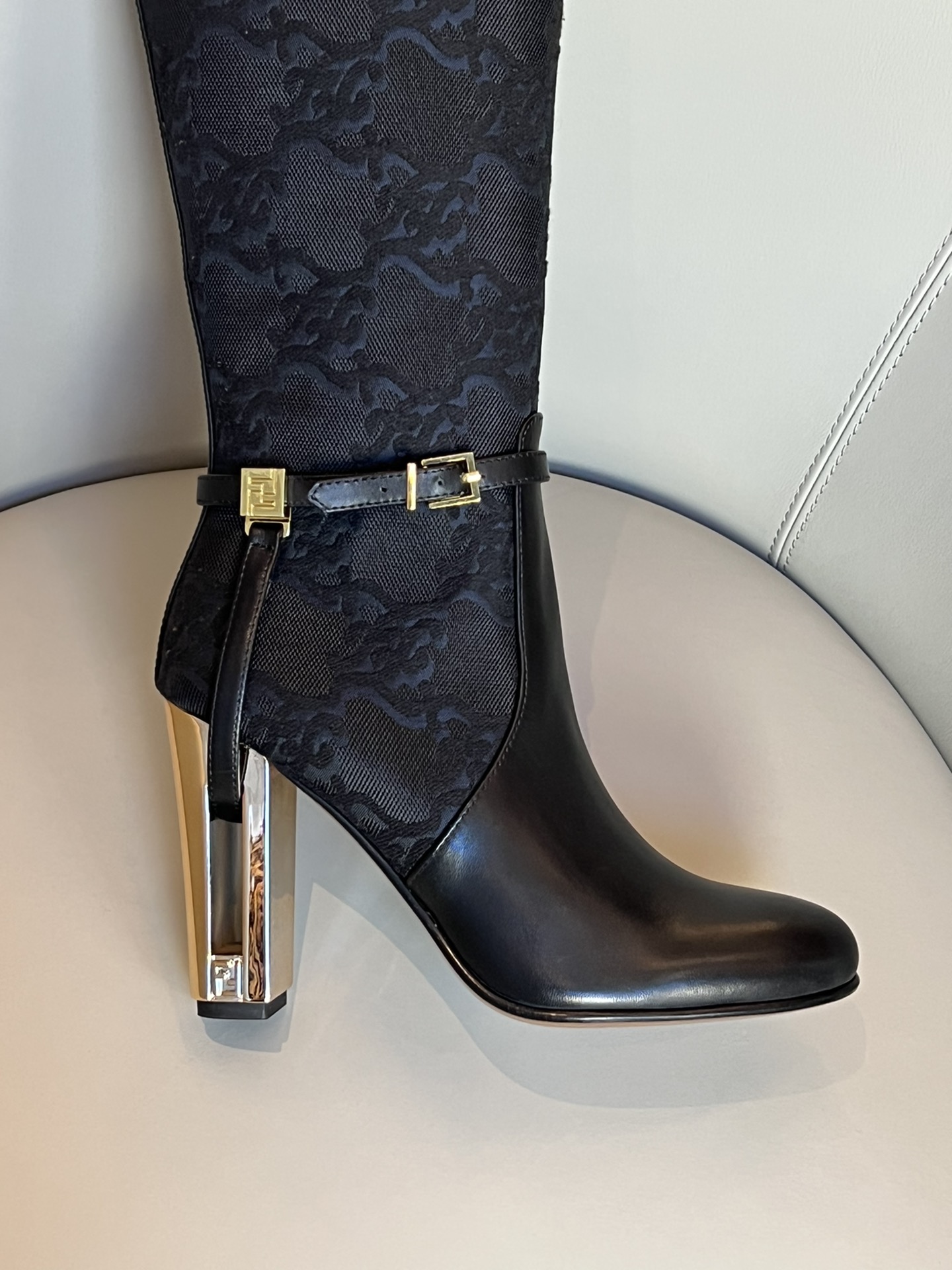 Погрузитесь в мир итальянской роскоши с женскими сапогами Fendi Delfina. Эффектное сочетание высококачественной гладкой кожи и премиального жаккарда придаёт паре особую глубину и фактуру. Элегантный силуэт подчеркивает линию ноги, а устойчивый каблук с золотистыми акцентами добавляет женственности и изысканности.