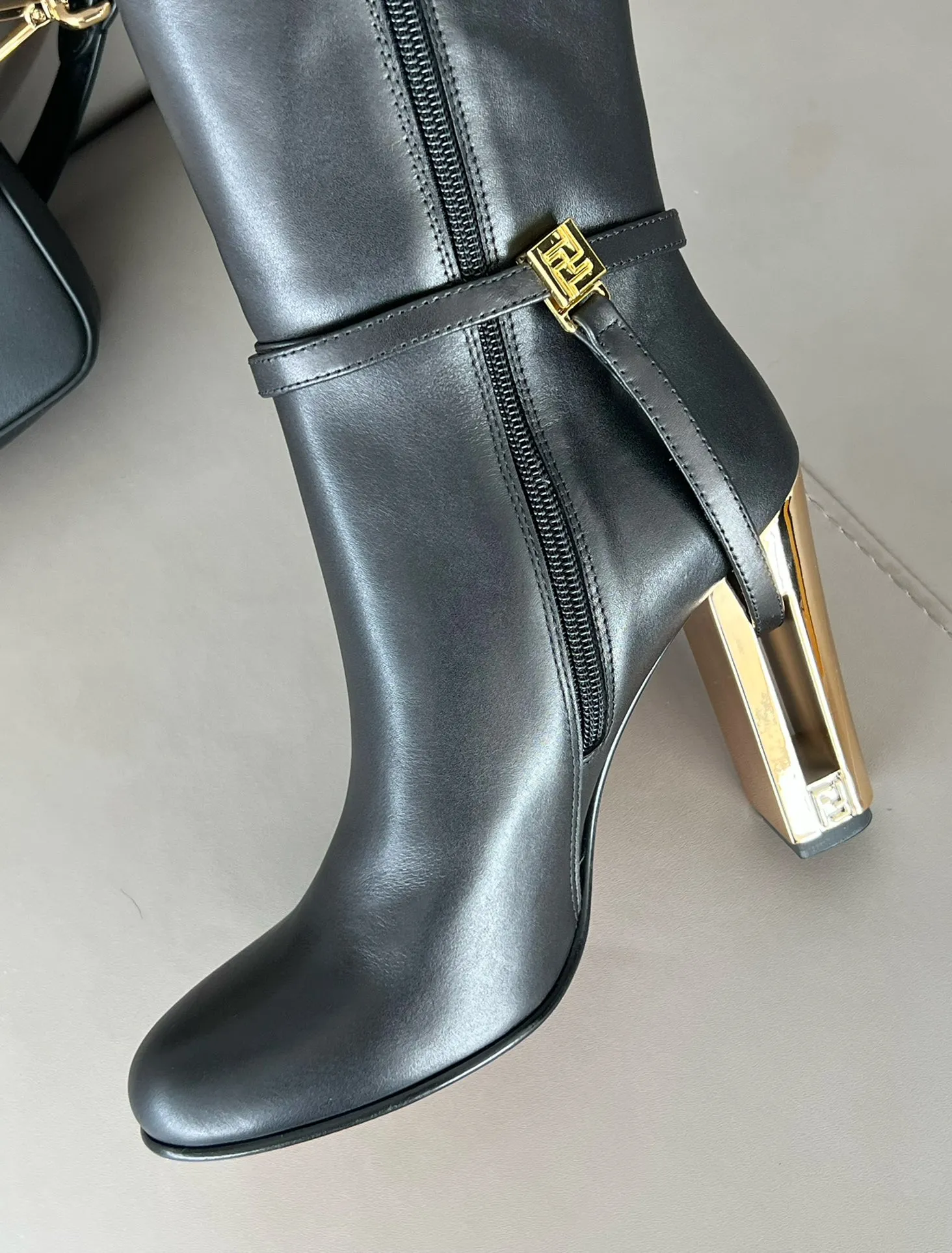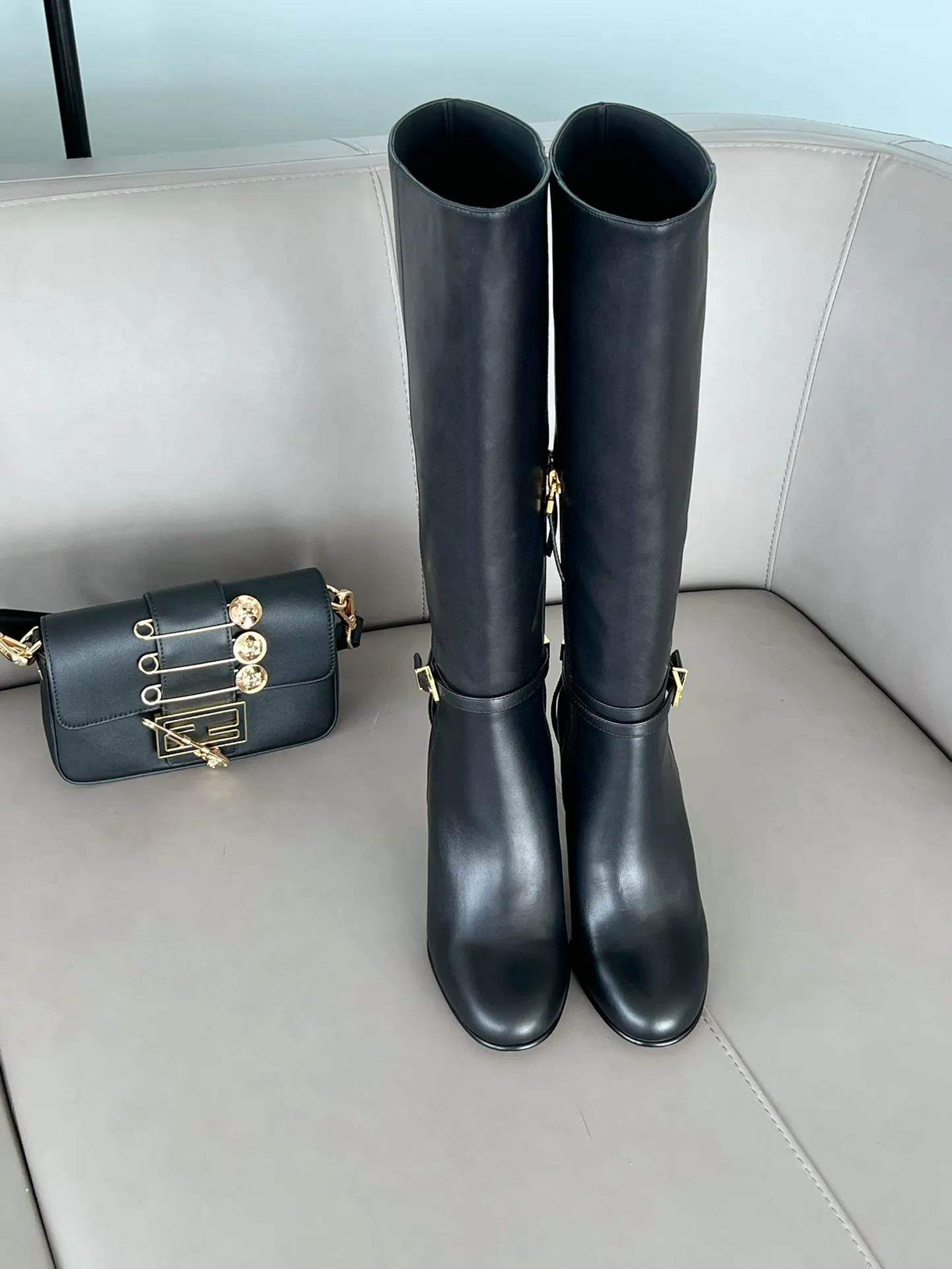 Осенне-зимние сапоги Delfina от FENDI – это воплощение классики и элегантности. Изготовленные из 100% оригинальной телячьей кожи. Внутреннее крепление на молнии обеспечивает удобство и легкость надевания, а использование натурального бархата и эксклюзивной металлической пряжки с надписью FENDI добавляет изысканности. Подкладка из импортной телячьей кожи и оригинальная кожаная подошва гарантируют долговечность и комфорт. Уникальные вырезы и золотистый металлический узор FF на каблуке придают обуви особый шарм.