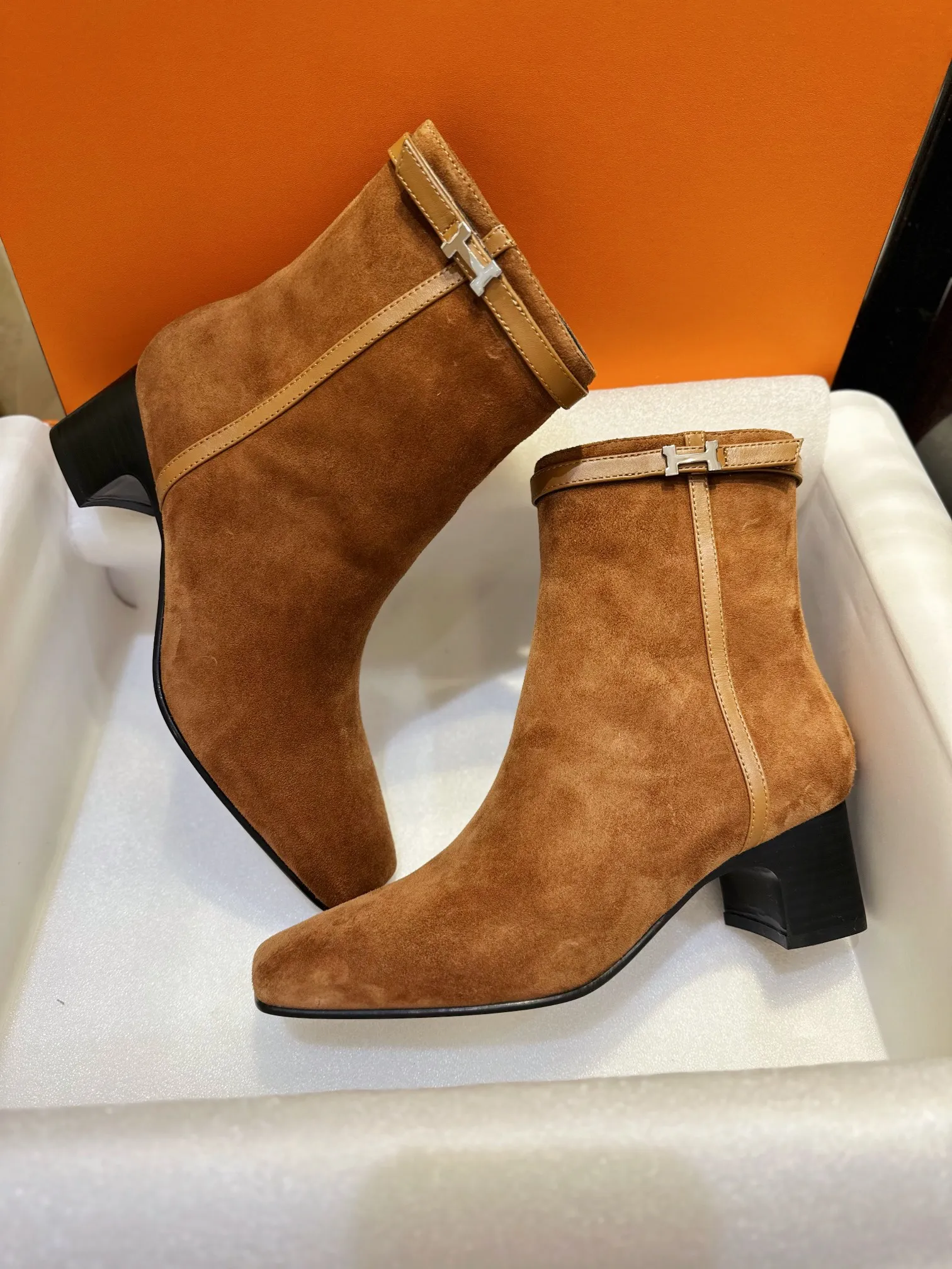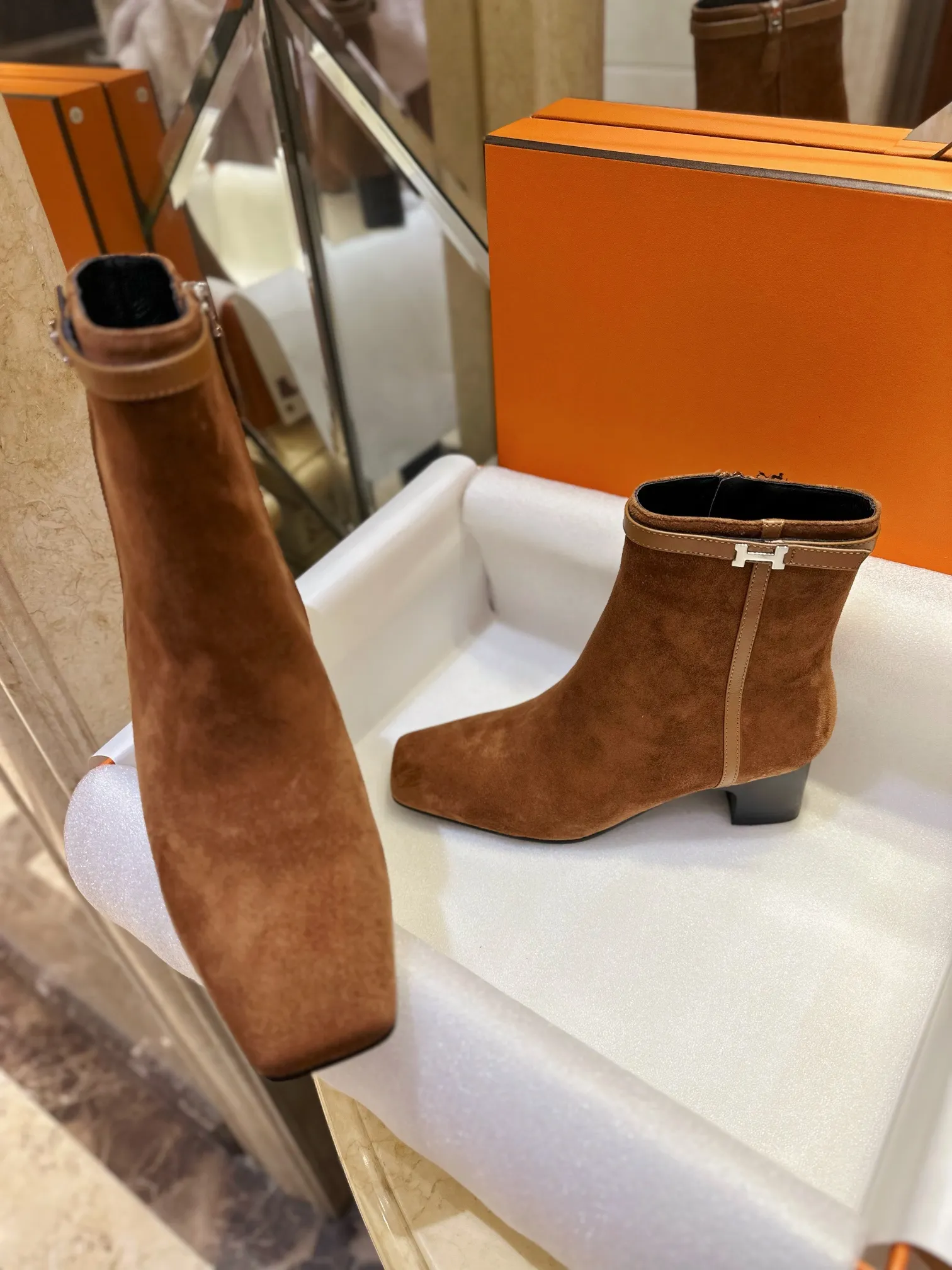 Эти сапоги HERMES - идеальное сочетание элегантности и практичности. Нежная коричневая цветовая гамма замши и кожи создает ощущение уюта и тепла, а ретро-стиль добавляет изысканности. Четкие линии и элегантные детали делают эти сапожки настоящим украшением любого образа. Толстый каблук обеспечивает комфорт и устойчивость, позволяя носить их ежедневно, не утомляя ноги.