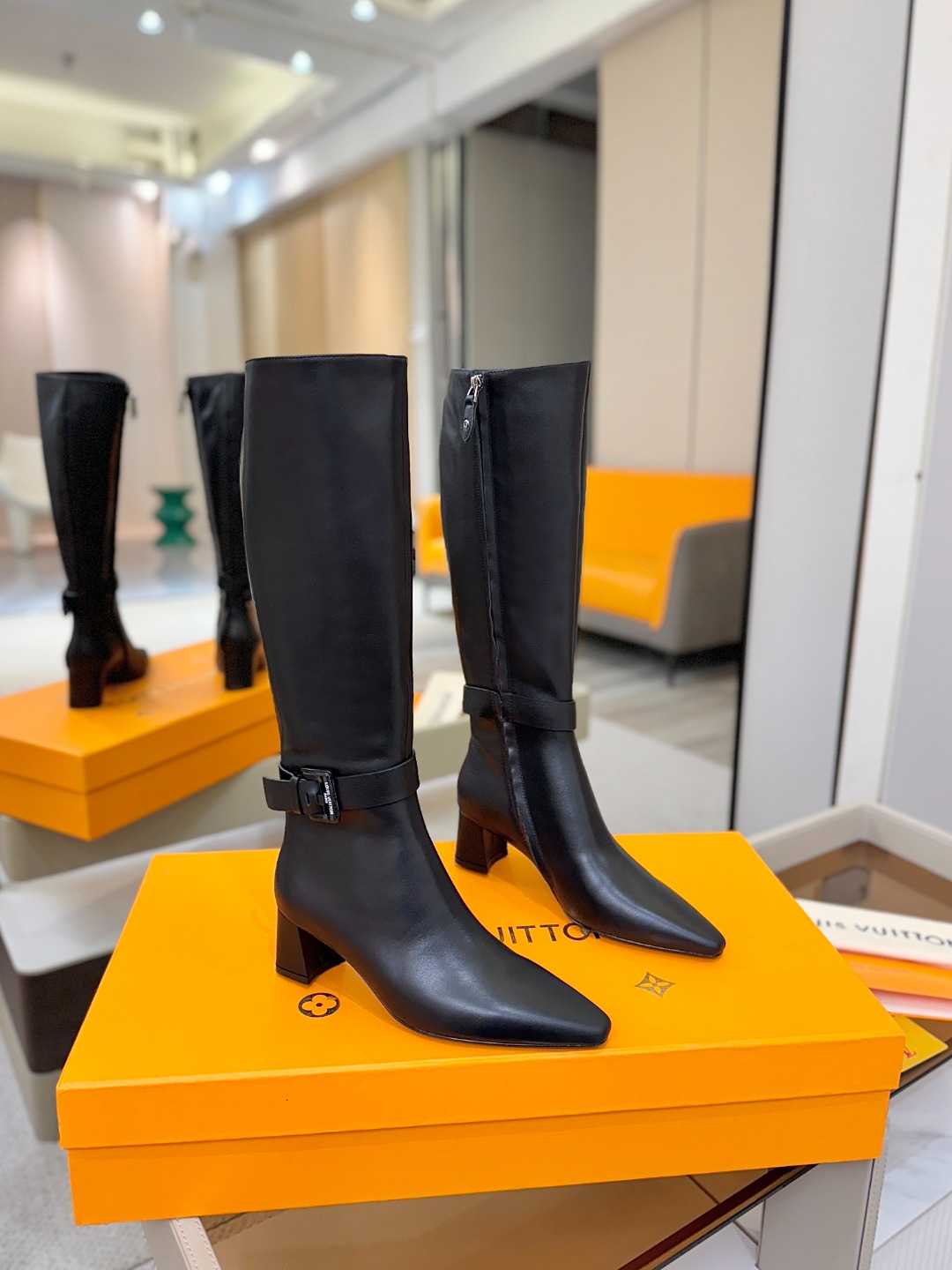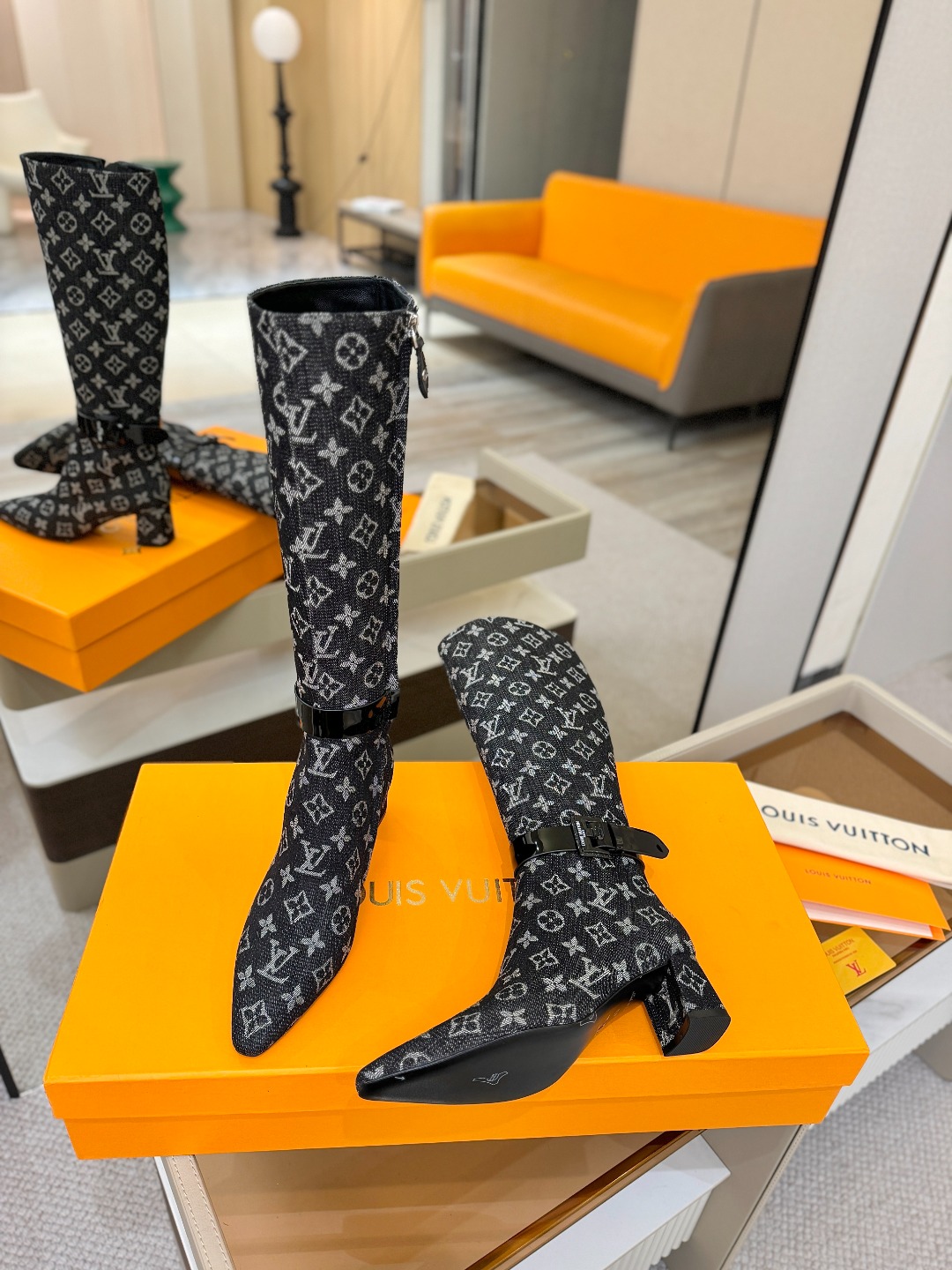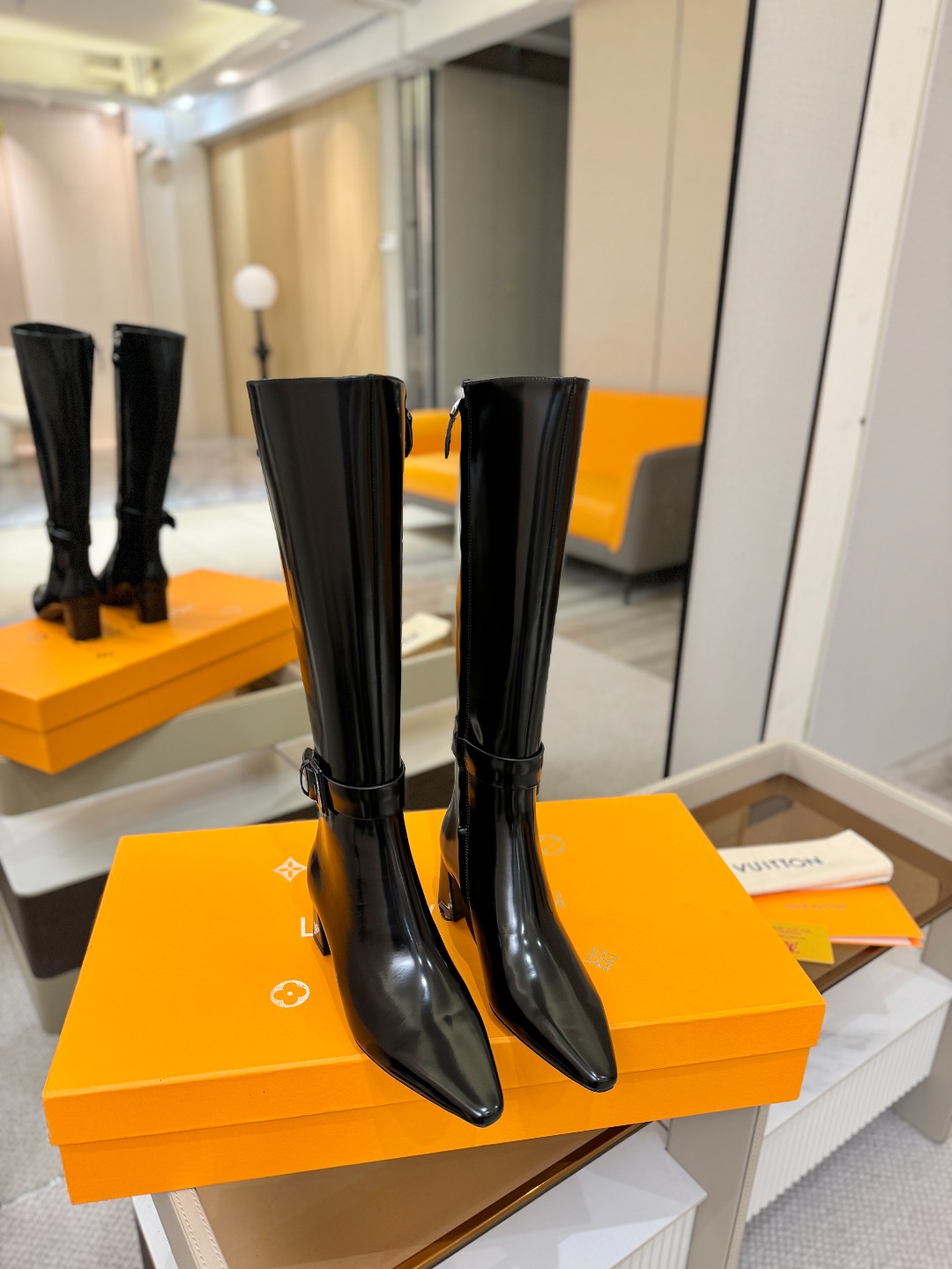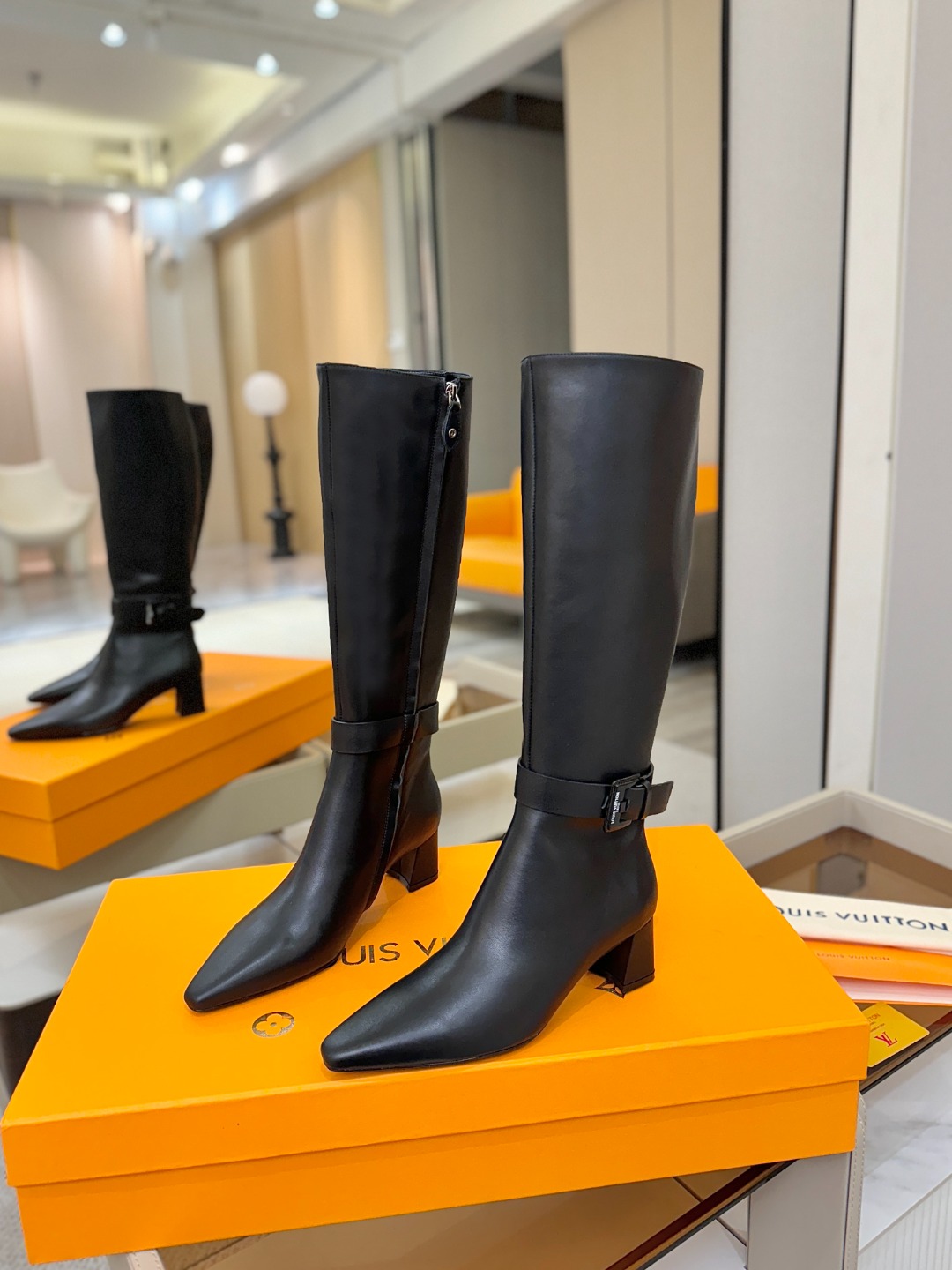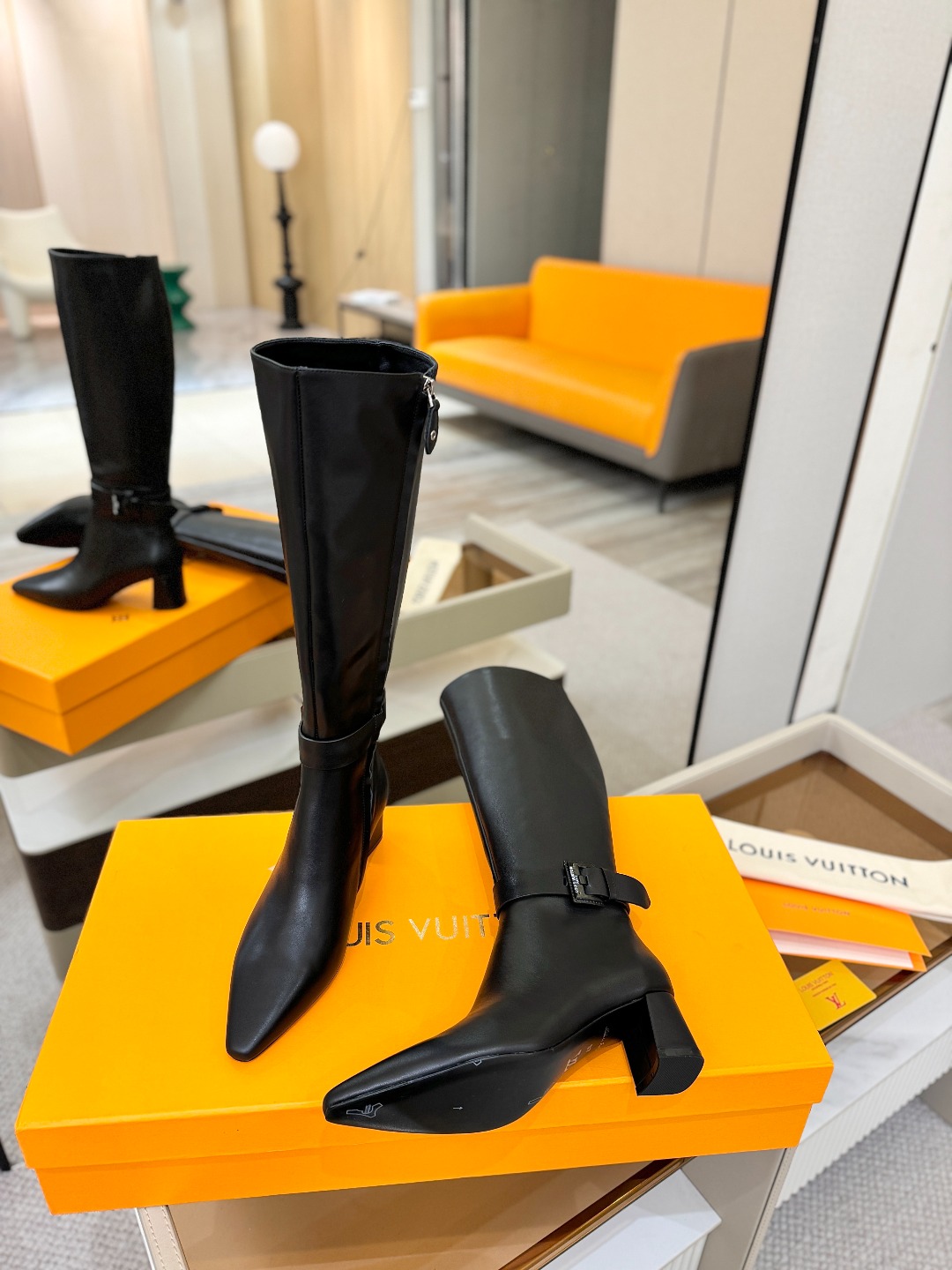 Эти стильные женские сапоги Louis Vuitton выполнены из высококачественной натуральной кожи в классическом цвете. Удлинённый мысок и элегантная пряжка с фирменным логотипом LV придают обуви изысканный и современный вид. Средний устойчивый каблук обеспечивает комфорт на каждый день, а боковая молния — легкость и удобство при надевании. Эта пара идеально дополнит как деловой, так и повседневный гардероб, подчеркнув Вашу индивидуальность и безупречное чувство стиля.