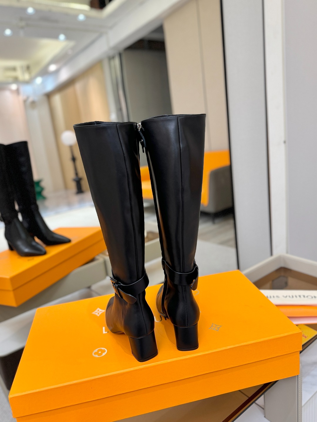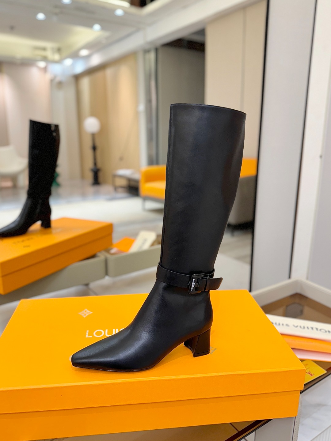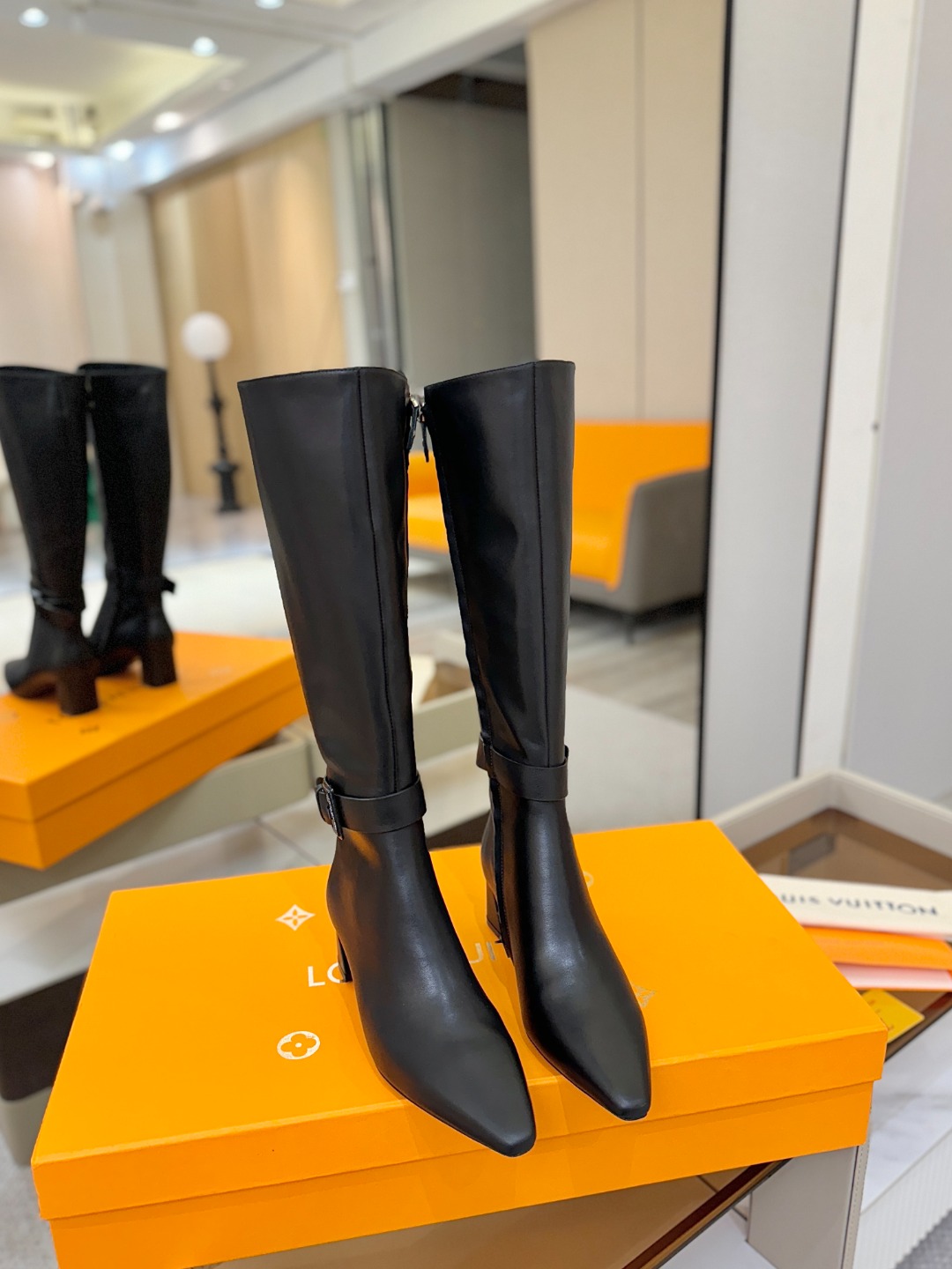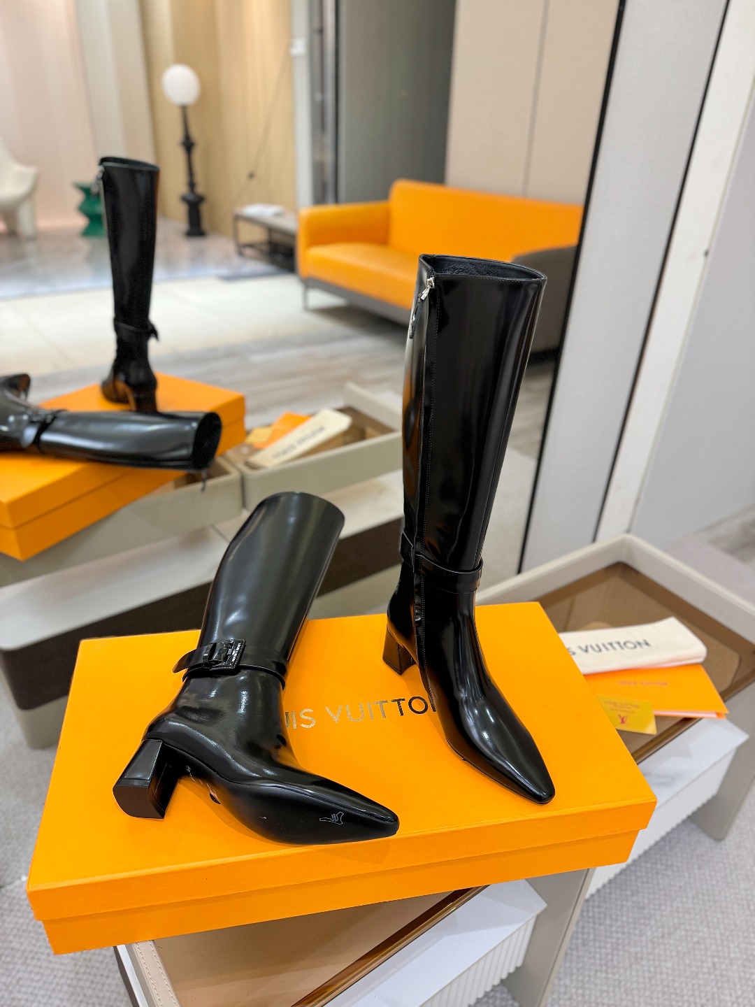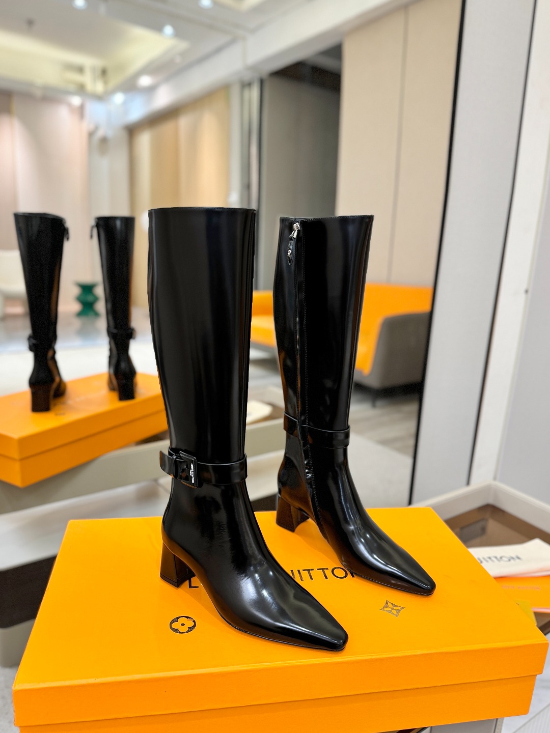 Эти стильные женские сапоги Louis Vuitton выполнены из высококачественной натуральной кожи в классическом цвете. Удлинённый мысок и элегантная пряжка с фирменным логотипом LV придают обуви изысканный и современный вид. Средний устойчивый каблук обеспечивает комфорт на каждый день, а боковая молния — легкость и удобство при надевании. Эта пара идеально дополнит как деловой, так и повседневный гардероб, подчеркнув Вашу индивидуальность и безупречное чувство стиля.