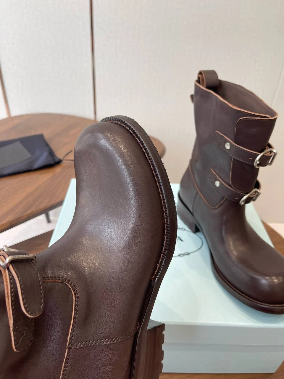Элегантные женские ботинки PRADA в тёмно‑коричневом оттенке — минималистичный городской дизайн с аккуратной отделкой и выразительной фурнитурой. По фото видно высококачественную гладкую кожу, прочную низкую подошву и декоративные ремешки с серебристой пряжкой, которые придают модели слегка брутальный, но при этом очень женственный характер.